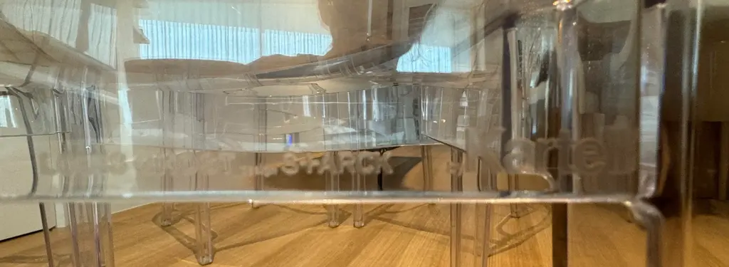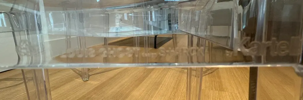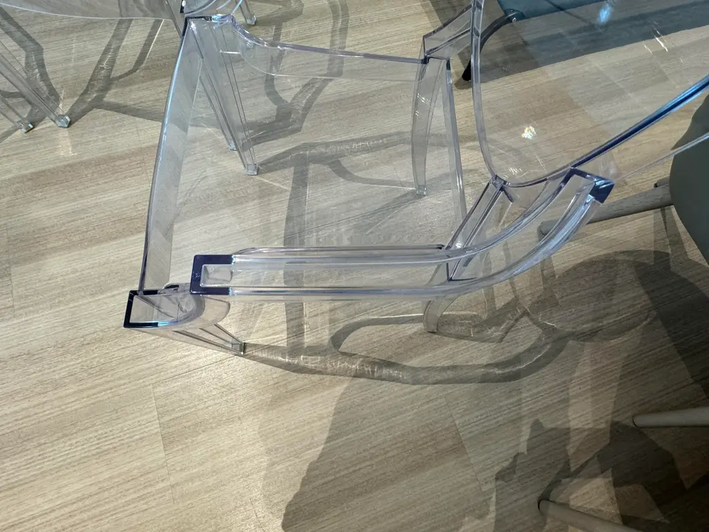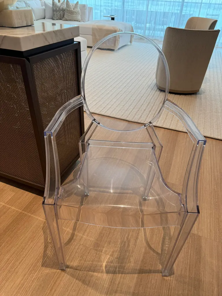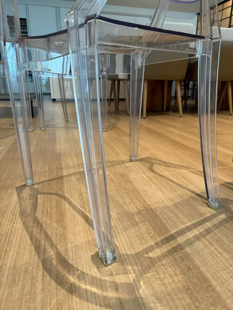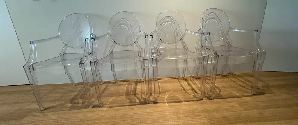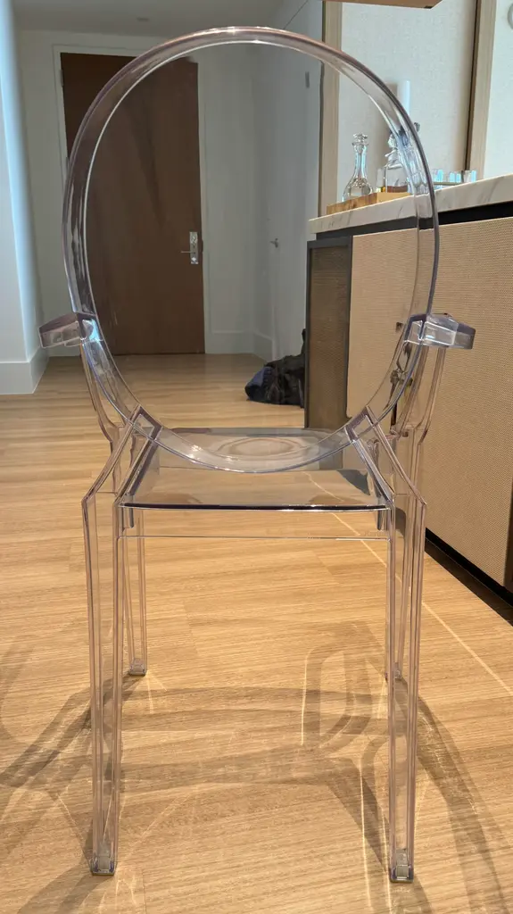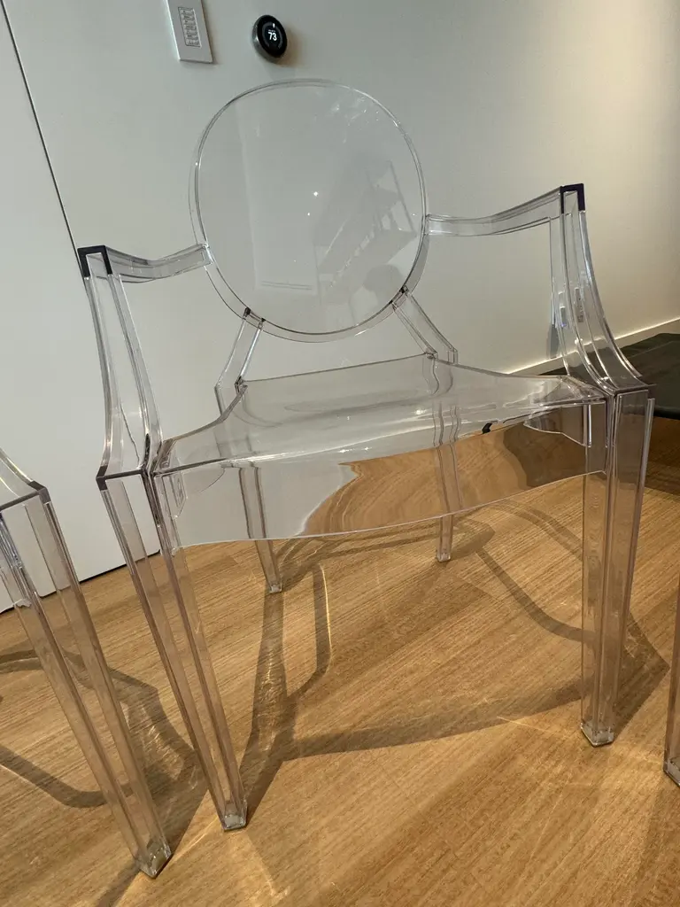Chairs are in almost perfect condition. One chair has slight scratches on the seat - almost not visible. There is the Louis Ghost Philippe Starck Kartell stamp on the back of each chair seat at the bottom rim. It is very hard to see and photograph because it is clear. Price is per chair or I can sell all 4 Louis Ghost is the world’s bravest example of the injection of polycarbonate in a single mould. A chair inspired by the Louis XV chair, the baroque ideotype, reinterpreted by Philippe Starck to amaze, inspire and beguile. Despite its evanescent and crystalline image, Louis Ghost is stable and strong, collision-proof and capable of withstanding the effects of the weather; and it can be stacked in piles of up to six. A very charismatic product with enormous aesthetic appeal, perfect for every setting, be it domestic or professional. Scratch- and weather-resistant Durable and stable Overall: 37.2"H x 21.4"W x 21.8"D Arm: 26.38"H Seat: 18.67"H Molded polycarbonate Made in Italy