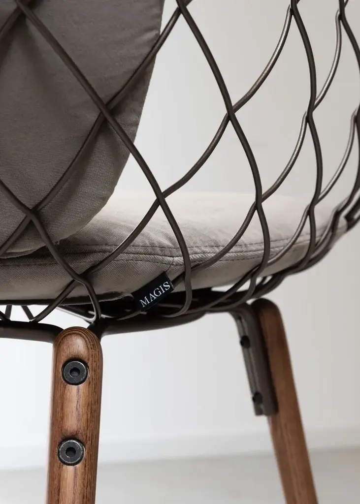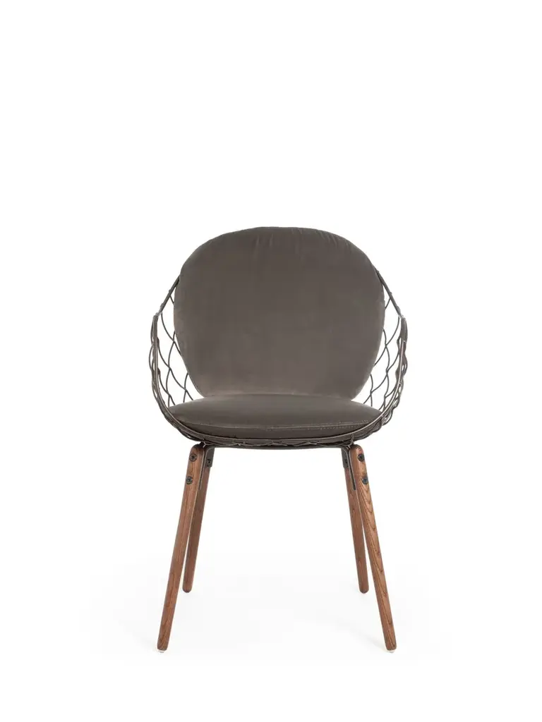 Armchair.Material: legs in solid ash, natural or painted. Seat in steel rod painted in polyester powder. Seat/back cushion with removable cover in fabric (Kvadrat, “Steelcut 2”) or leather.