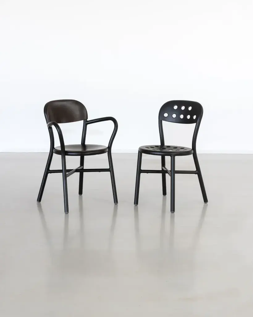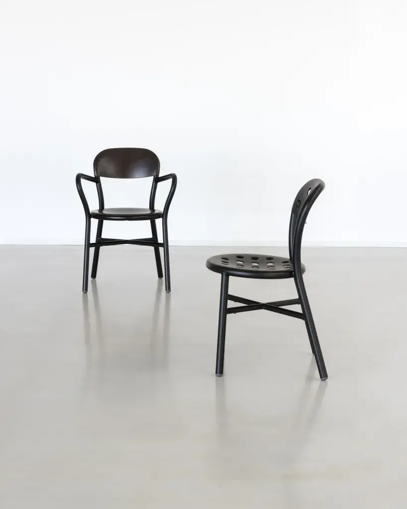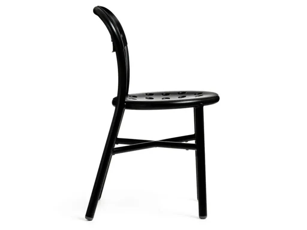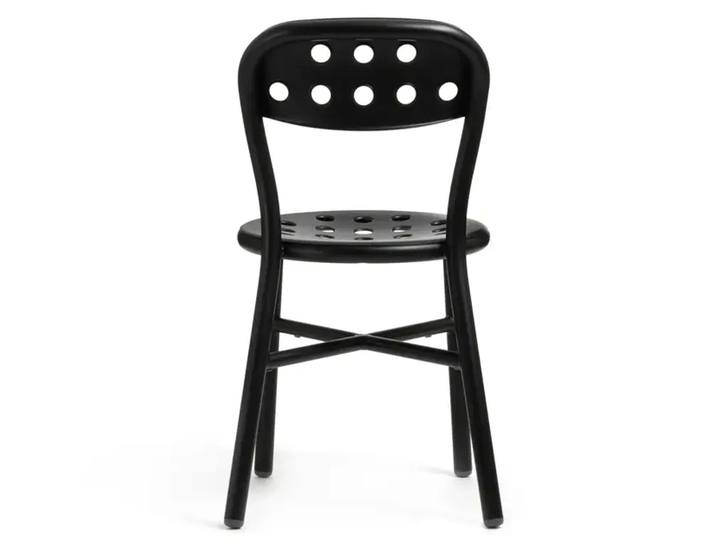 Stacking chair.Material: frame in aluminium tube painted in polyester powder.Seat and back in punched aluminium plate painted in polyester powder.Also available with arms.Versions for outdoor use available. Flame retardant.