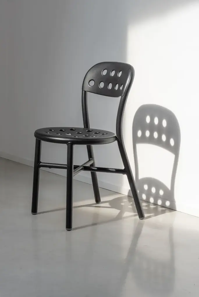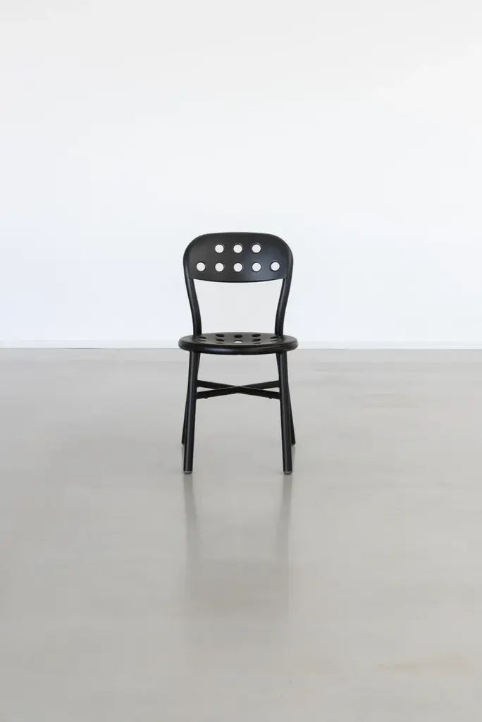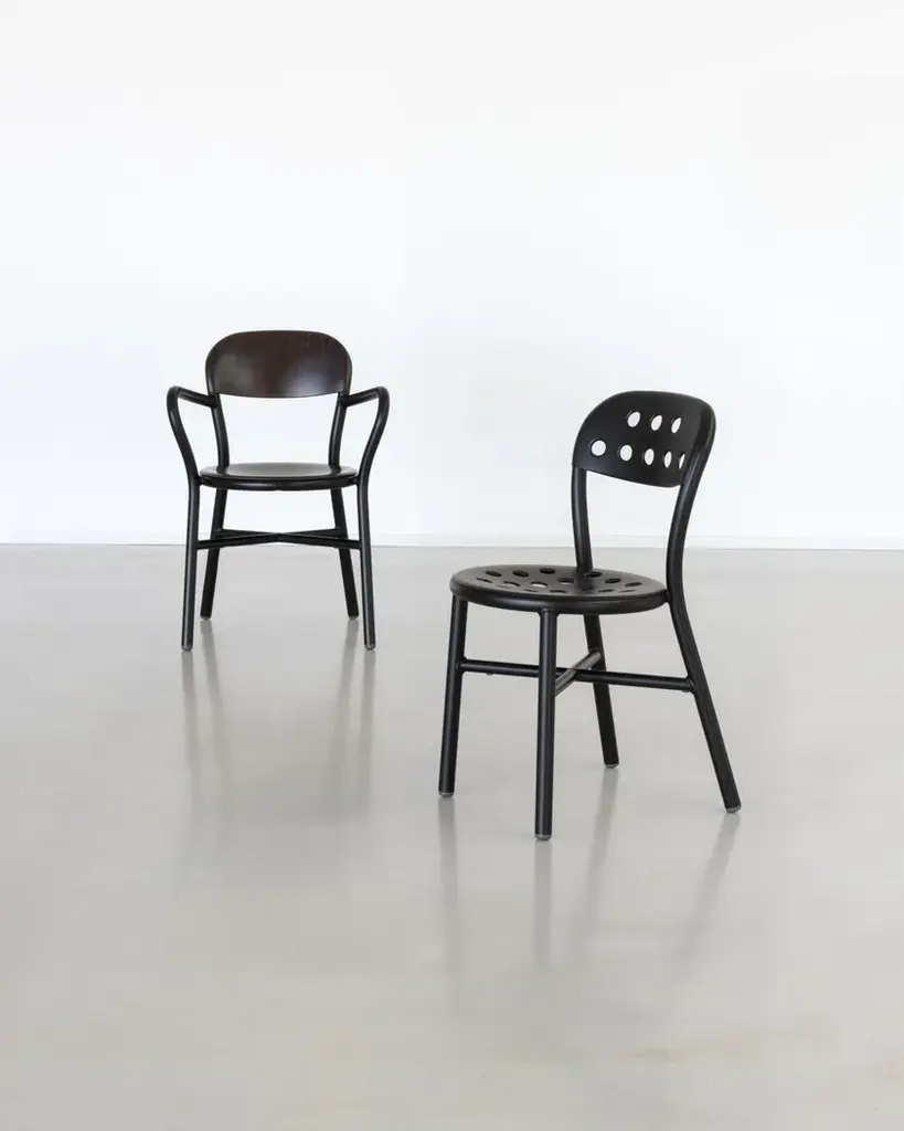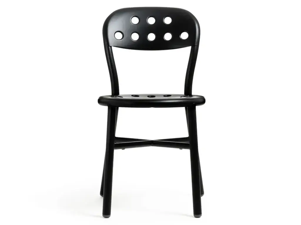Stacking chair.Material: frame in aluminium tube painted in polyester powder.Seat and back in punched aluminium plate painted in polyester powder.Also available with arms.Versions for outdoor use available. Flame retardant.