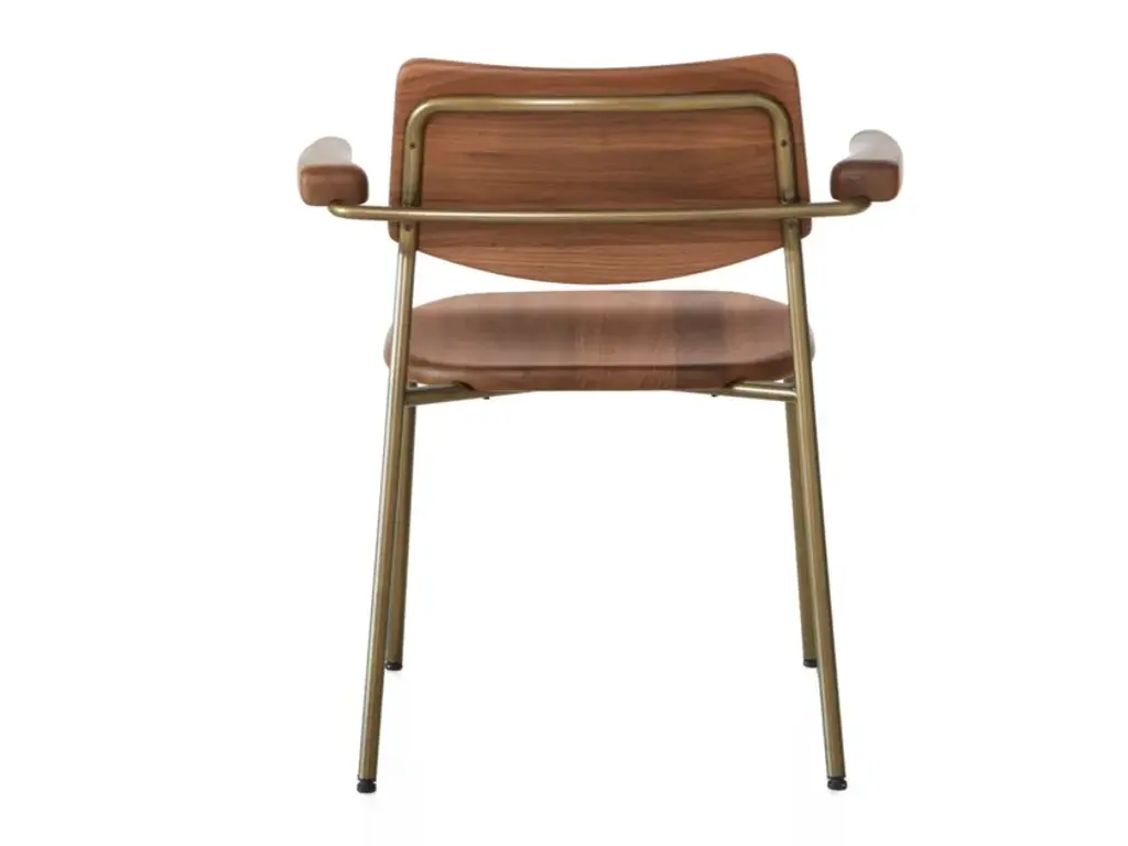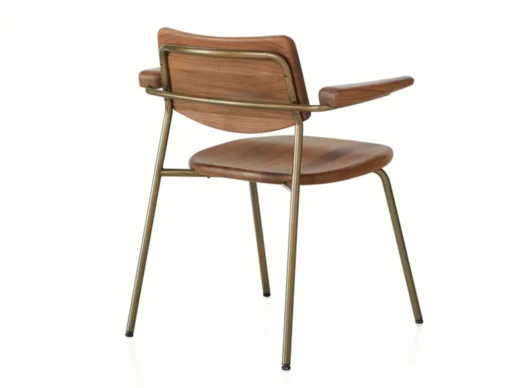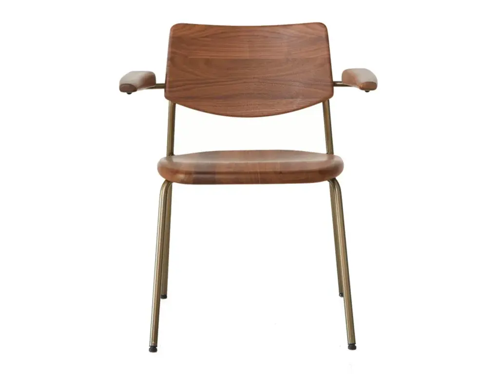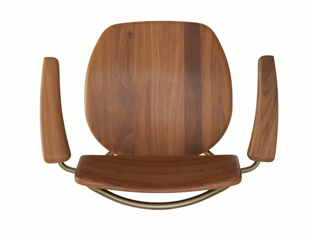 The Pipe Chair is a chair with carved, solid wood seat, back, and arms with a nanoceramic coated stainless steel tubular frame. The chair is stackable, limited to four high and is available for outdoor use in certain wood types. Materials: Carved solid White Oak or Walnut. Base Options: Tubular stainless steel, or Satin Nickel, Bronze, Satin Brass, Gunmetal nanoceramic coated tubular stainless steel.The BassamFellows Pipe Chair Collection has the striking silhouette and strength of an A-frame stance. The tubular stainless-steel structure holds solid wood seat and back panels that are carved in two directions. From the perspective of the sitter, the seat and back panels have carved, softened edges and are dished for ergonomic comfort while underneath, the panels are carved to integrate with the frame, melding two materials together – structure and wood. Originally the design brief required the chair to be stackable and appropriate for both indoor and outdoor use. The chair is stackable, limited to four high, and is available in outdoor versions in appropriate woods such as Teak or Iroko.