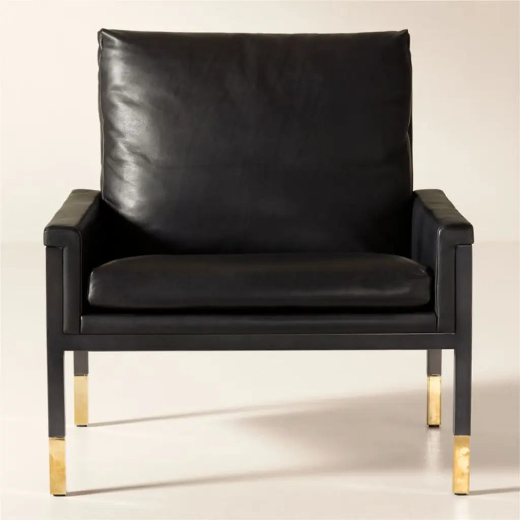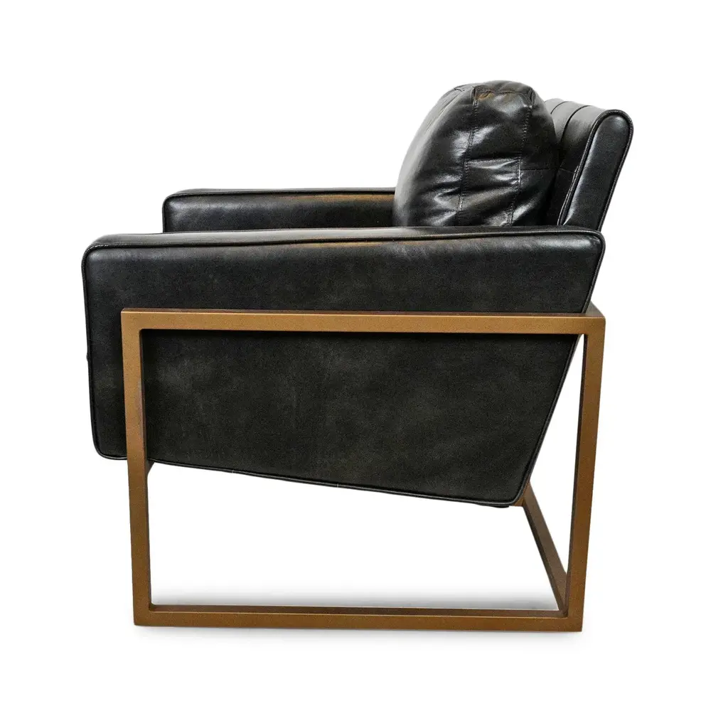 Rich black top grain leather club chair set in a modern brass bronze finish iron base. Aged and distressed finish may vary slightly with each chair. Seat height is 20" and arm height is 23.5". This chair weighs approx. 65 lbs.