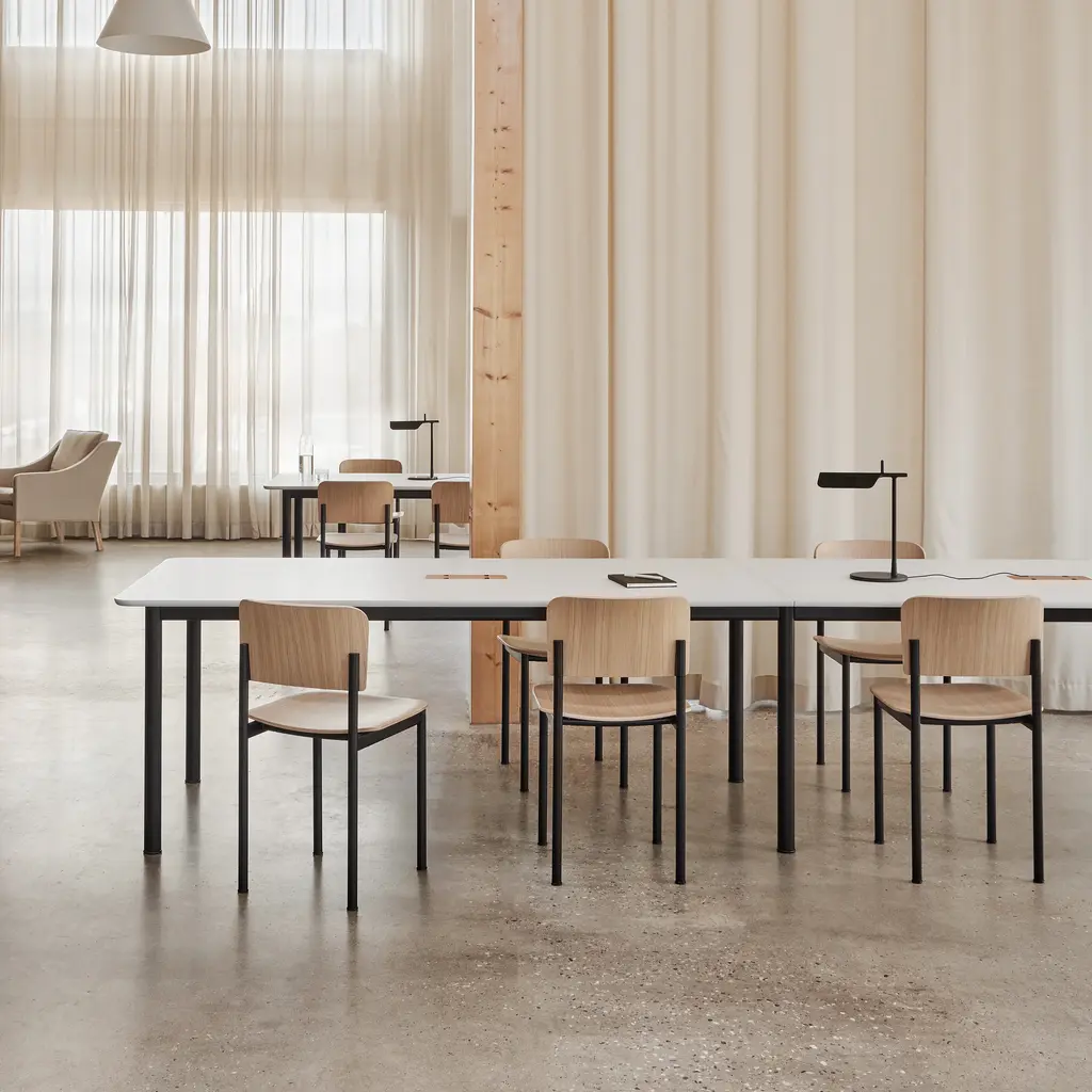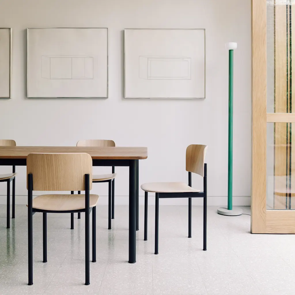 With its surprisingly minimal footprint and generous comfort, Plan is ideal for a variety of uses—in hospitality spaces, the flex-workplace and everyday in the home. Barber & Osgerby’s chair features a plywood veneer seat and back finished with water-based lacquer and a powder-coated tubular steel frame in black, Bordeaux or Modernist green.