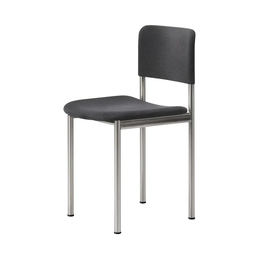 Clean lines and soft curves define this chair, offering a compact footprint suited to a range of environments—from collaborative workspaces to hospitality settings. A steel tube frame, available in powder-coated or brushed finishes, supports a fully upholstered seat and backrest. The chair is EU Ecolabel certified and designed for disassembly and recycling.