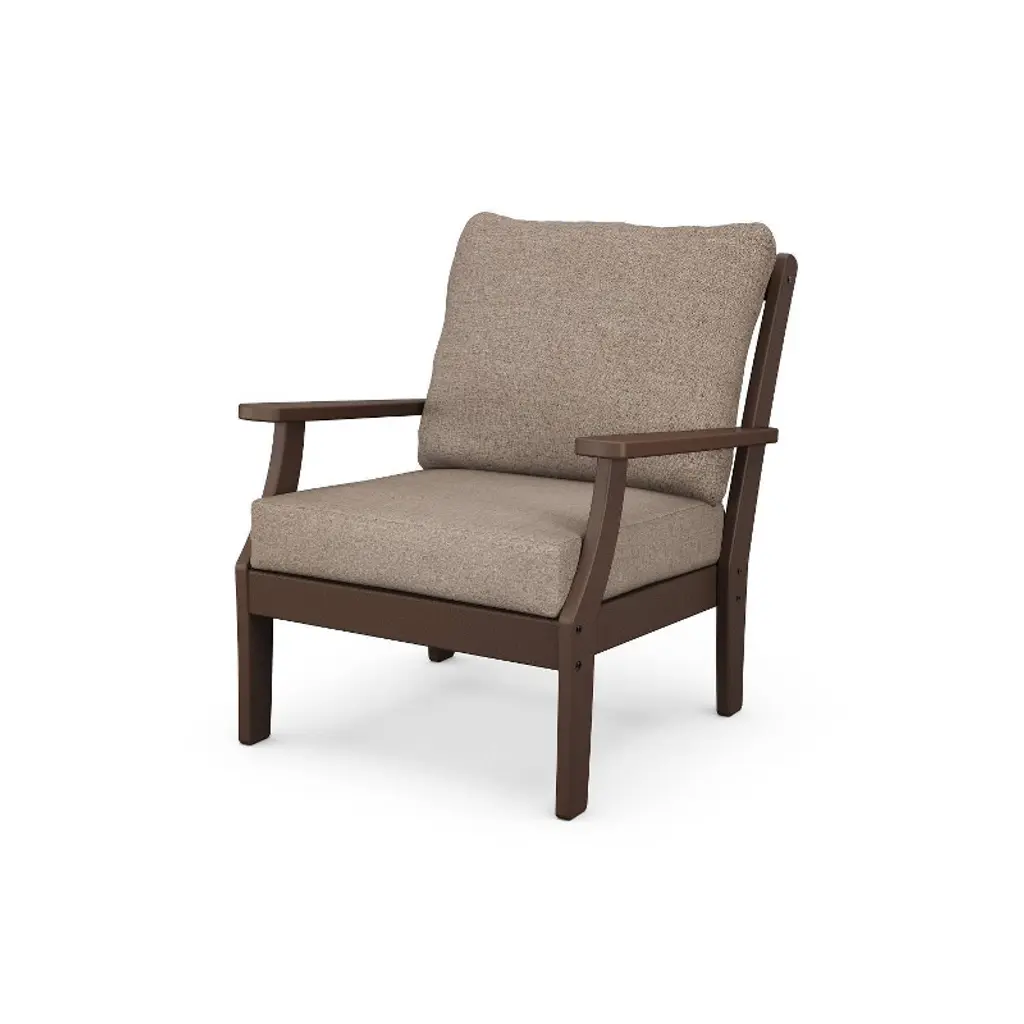 The Braxton Deep Seating Patio Chair by POLYWOOD strikes the perfect balance between urban and rustic. With a reclined backrest that features an eye-catching X-back design and soft, weather-resistant cushions, this all-weather chair provides style and comfort in your outdoor space. Create a relaxation-ready nook by grouping a few deep seating chairs with coordinating pieces from the Braxton Collection.