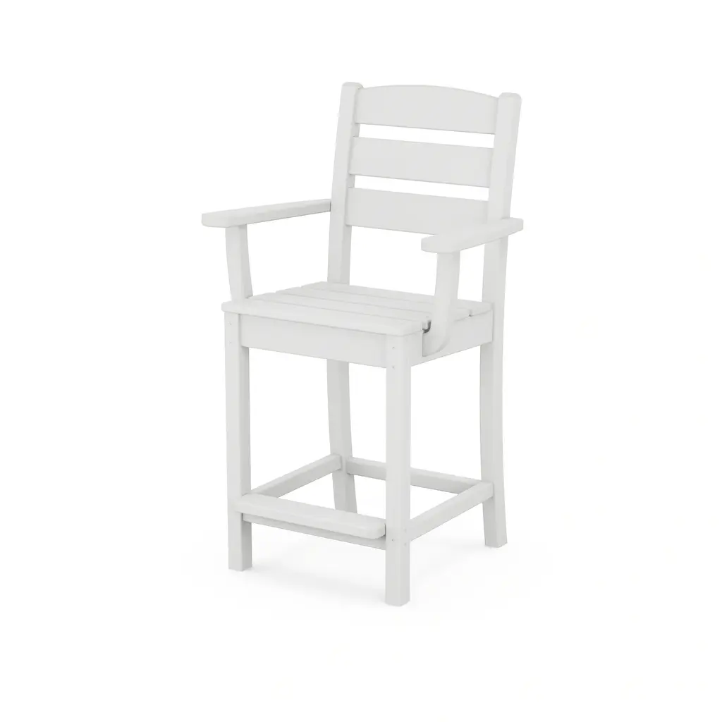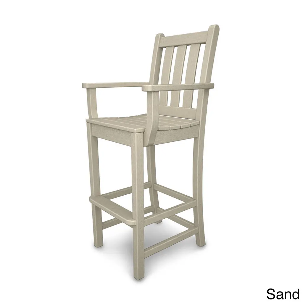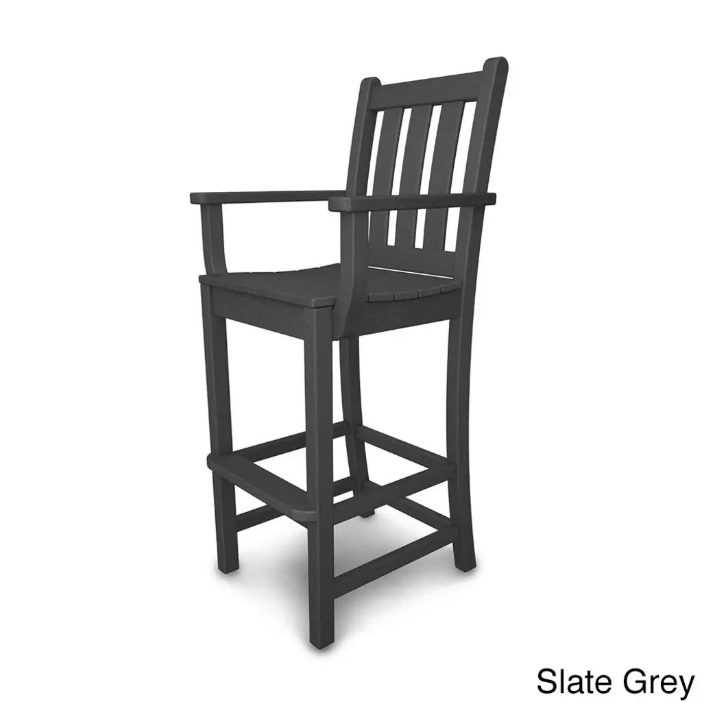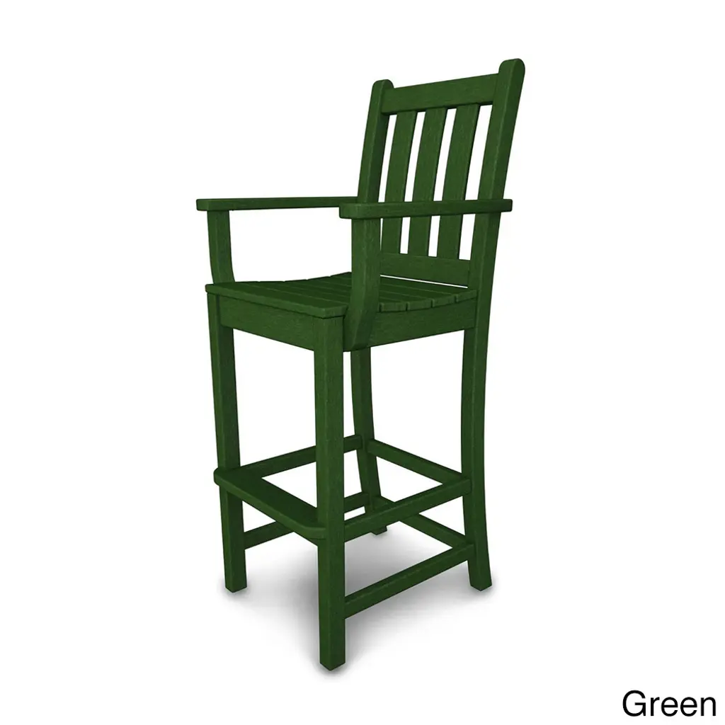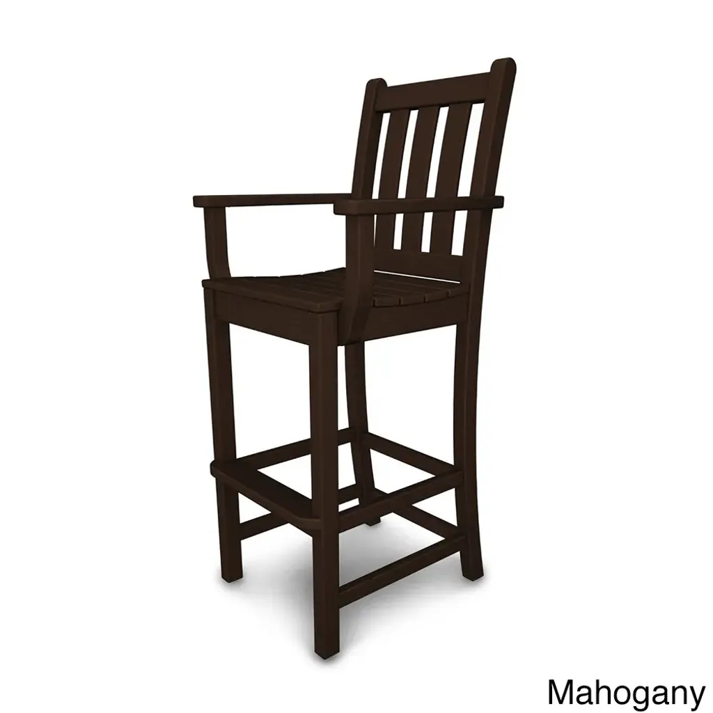 Gaze at your garden while seated in this traditional-style bar-height arm chair designed for comfort. Constructed of polywood, which doesn't fade, crack, or peel, this chair easily stands up to inclement weather. Eco-friendly product made with recycled materials Constructed of durable HDPE POLYWOOD lumber that provides the look of painted wood without the maintenance POLYWOOD lumber does not splinter, crack, chip, peel or rot and it is resistant to corrosive substances such as oil, salt spray and other environmental stresses Set includes: 1 Chair Color: Black,Green,Slate Grey,Mahogany,Sand,Teak,White Materials: High-density Polyethylene Finish: Black,Green,Slate Grey,Mahogany,Sand,Teak,White Weather-resistant UV protection Dimensions: 22.00D x 22.50"W x 47.75H Weight: 31Assembly RequiredNote: POLYWOOD products are built-to-order in the USA. We're working hard to build and ship orders as quickly as possible.