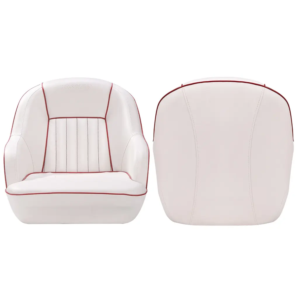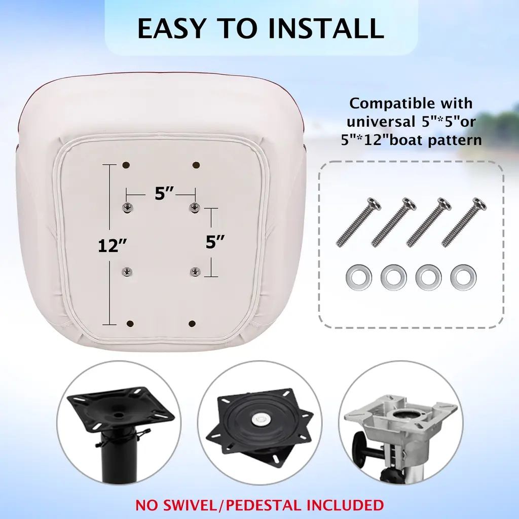 "Premium captain boat seat delivers the ultimate outdoor and water leisure experience.Products Features:1.Durable: The captain boat seat is made of marine grade vinyl with high-density compression foam padding.2.Seat Dimension: Height 19.5” X Width 22” X Depth 21.5”.3.Easy to Install:Fits for universal 5”X5” and 5”X12” mounting bolt pattern, stainless steel mounting screws and washers included.Specification:Material:Marine grade vinglColor: White/Blue;White /RedPackage Dimension:23 x 22 x 21 inchesPackage Weight:21.61lbs"