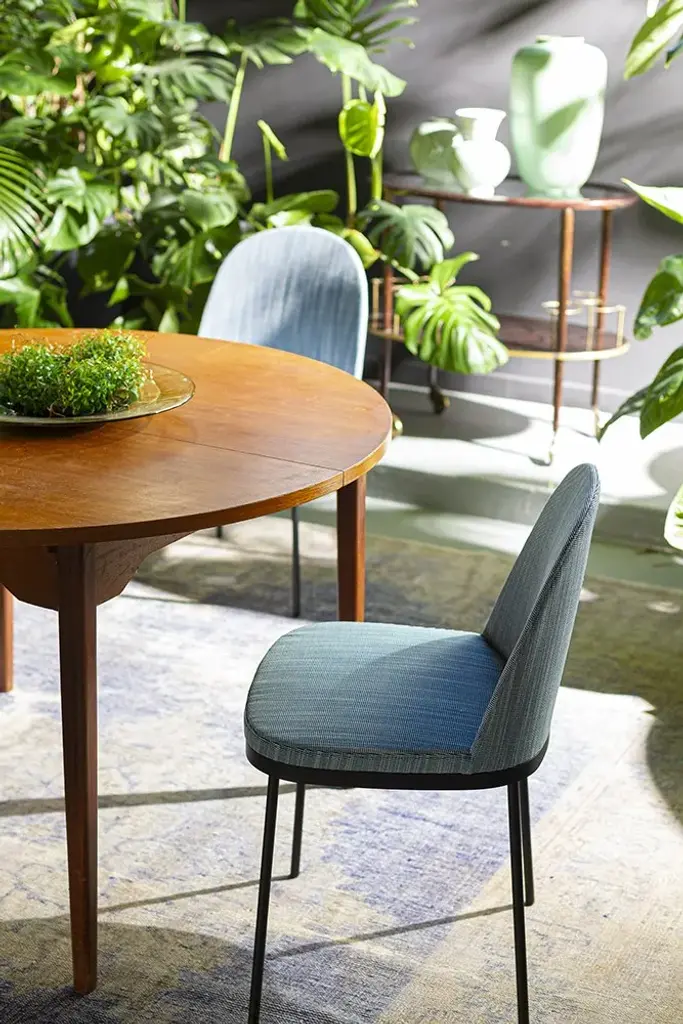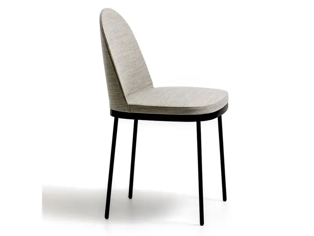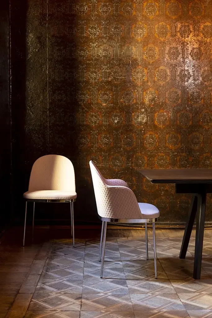 The Precious chair design is an attempt to slim down the cross-section to the lowest limit possible in order to create a lightweight, elegant product that would defy the laws of physics. The product’s minimalist shape nevertheless is combined with solidity, making it suitable for heavy-duty use, such as in the contract industry. A perfect combination, therefore, and not a contraposition between crisp, clear-cut shapes and solidity. In line with the trending taste and love for “precious” materials, the Precious collection offers a rich variety of fabrics and finishes and pays meticulous attention to detail.The legs of the chairs are extremely slender and the chrome-plated or painted steel plate forming the base of the seat sports a minimalist design reminiscent of the shape of a thin ring or wedding ring.Injected flame-retardant flexible foam over internal steel frame. Varnished or electroplated stainless steel base. Polypropylene gliders.Available in fabric or leather, with or without armrests.The Precious collection covers are not removable.