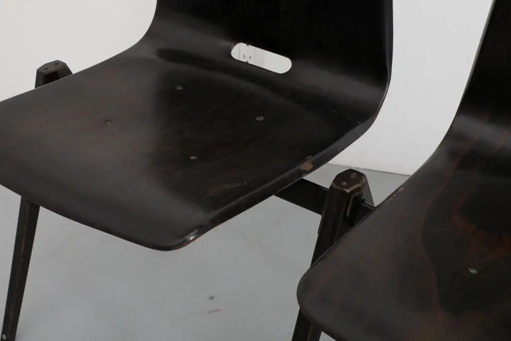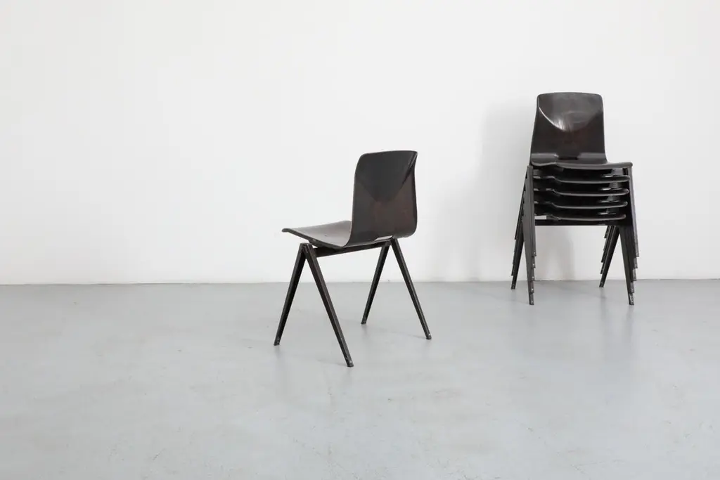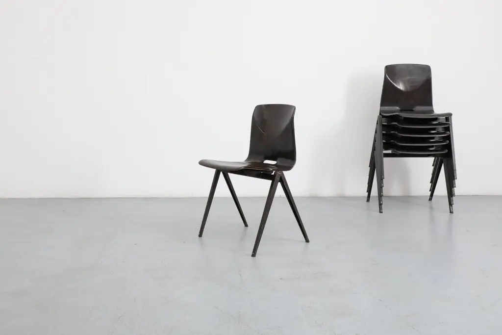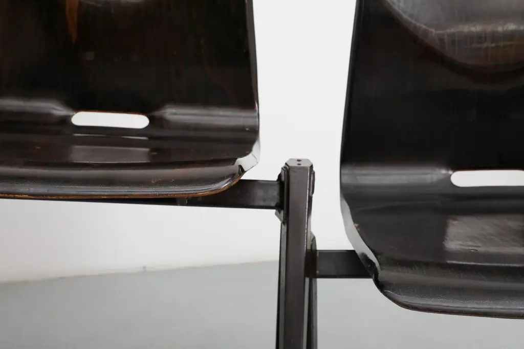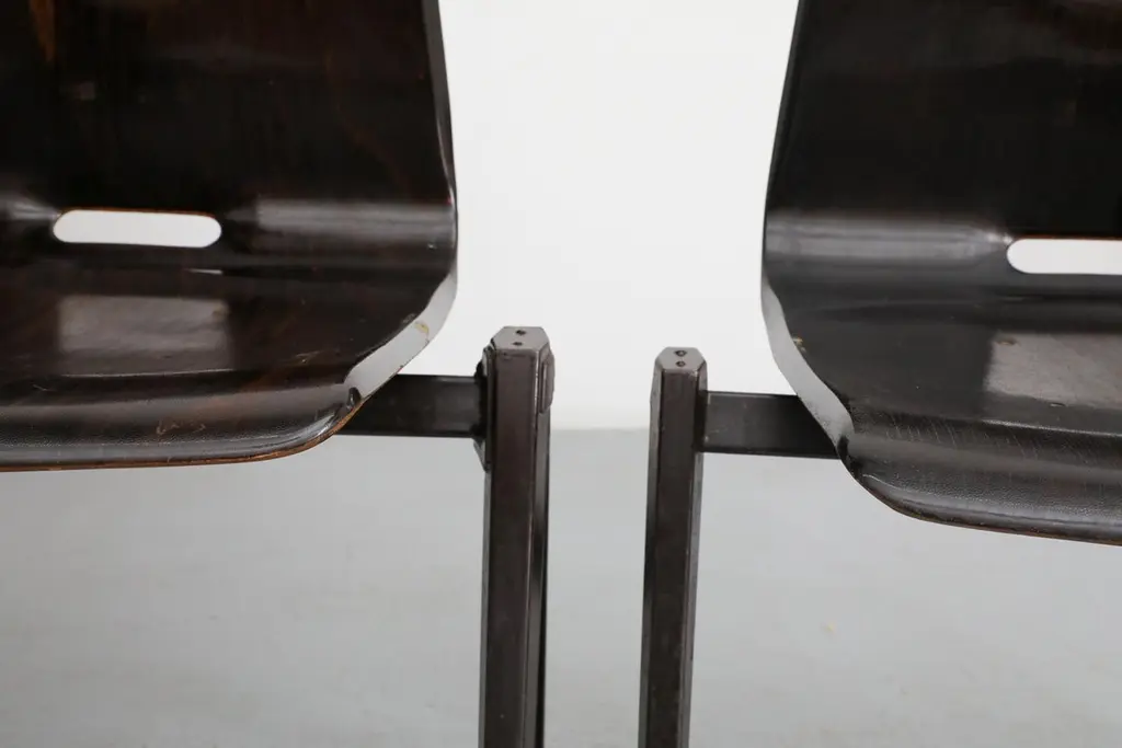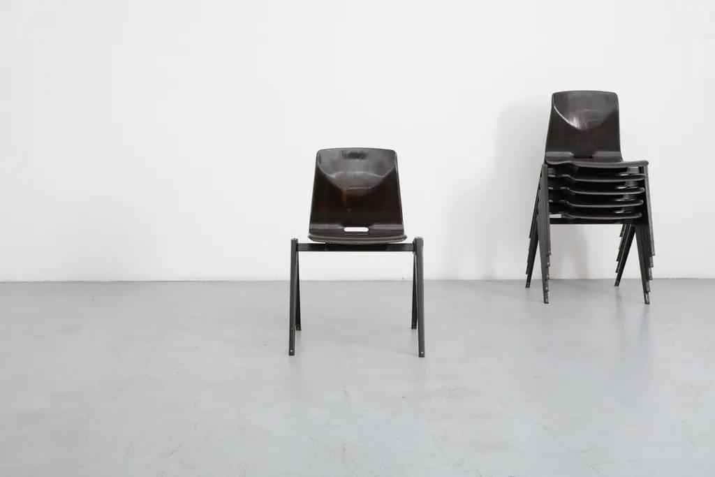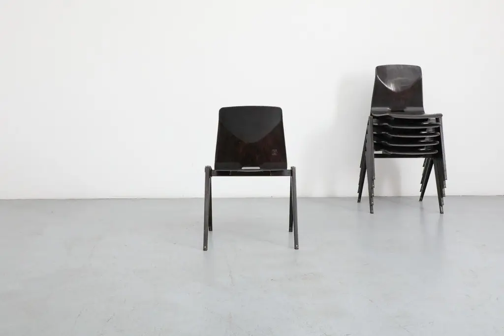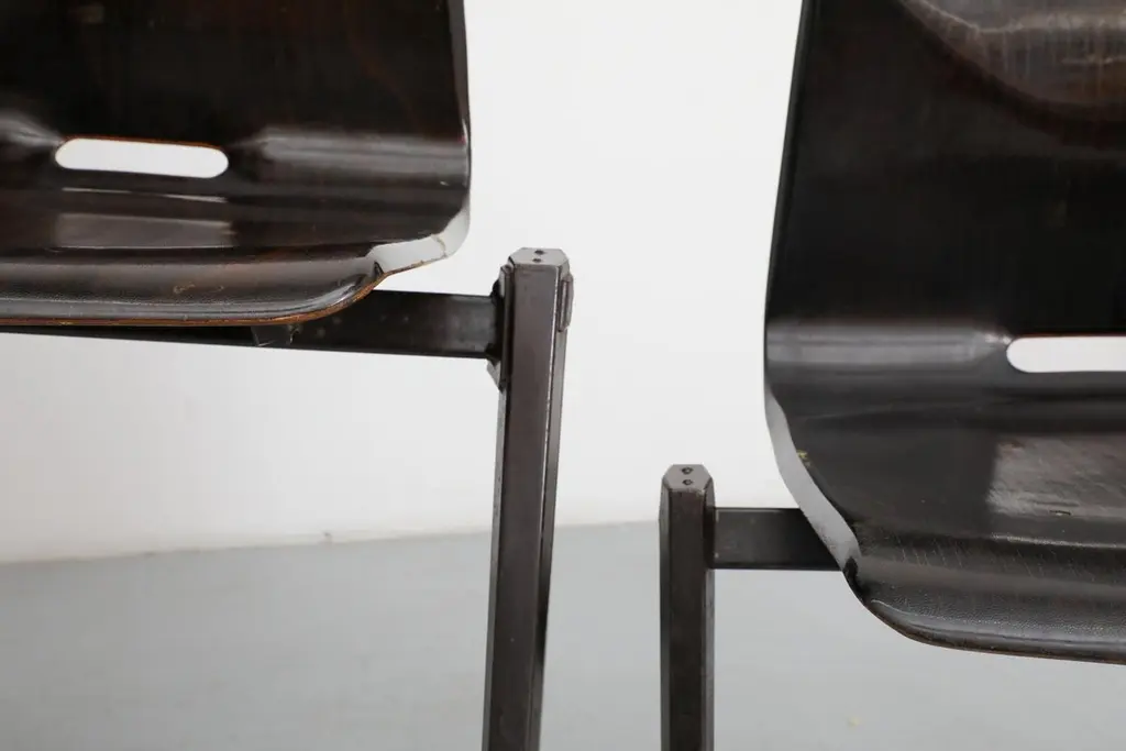 Prouve Style Wenge Toned Industrial Stacking Chairs With Compass Legs