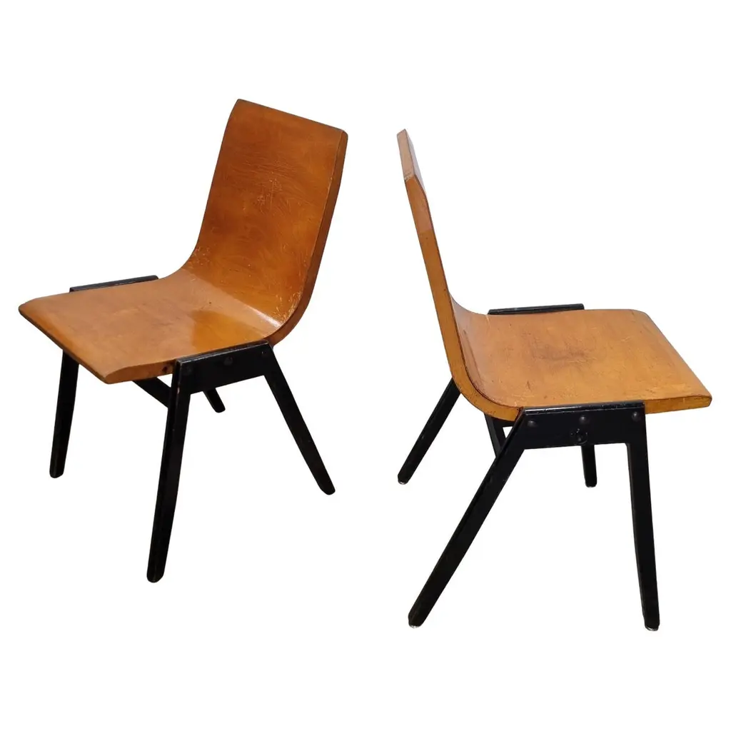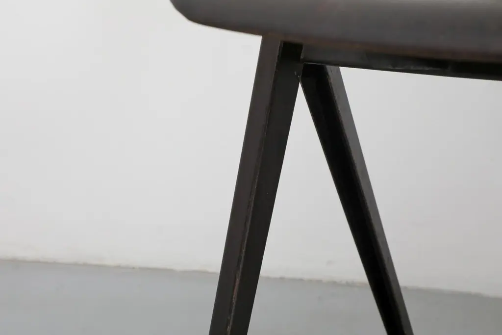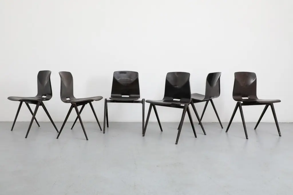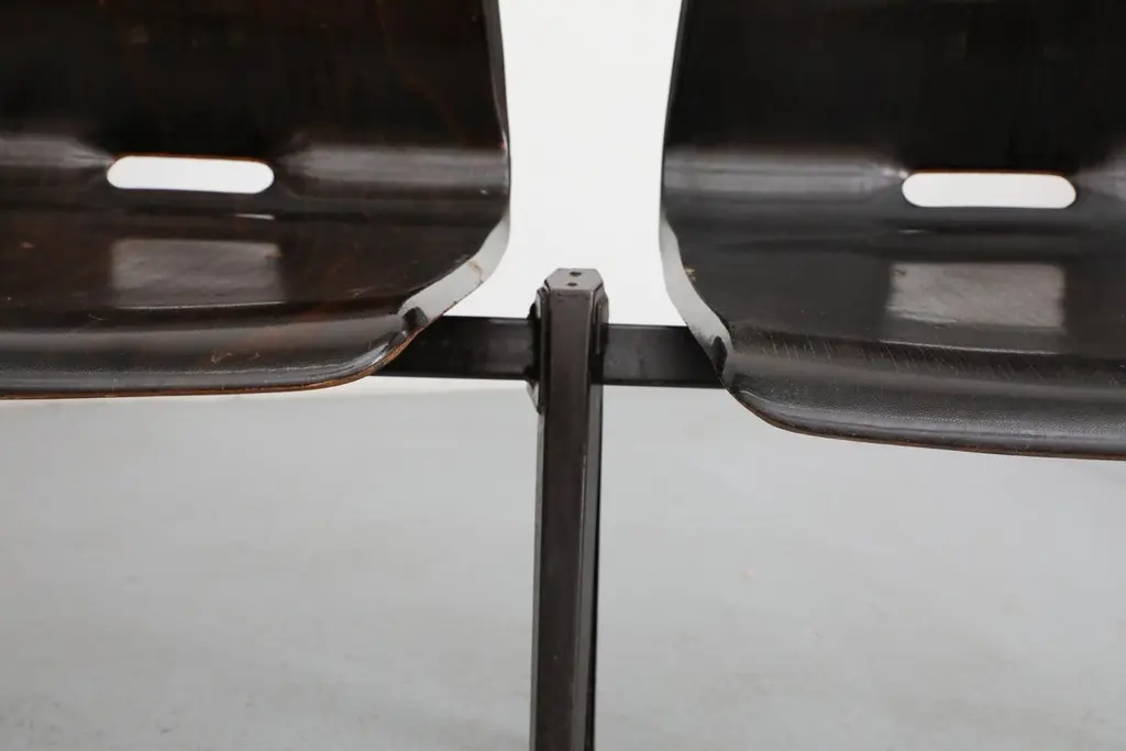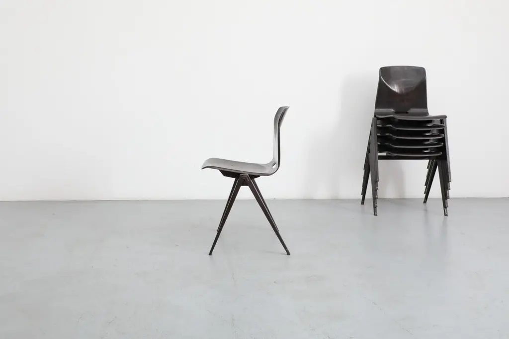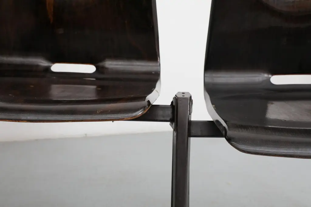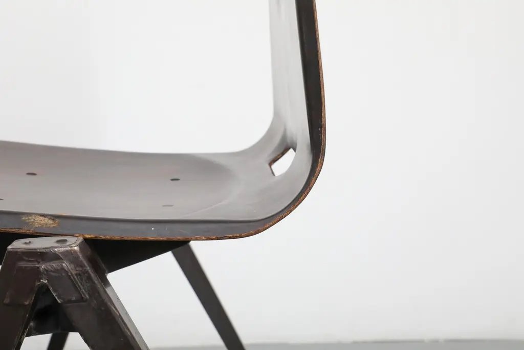 Prouve Style Wenge Toned Industrial Stacking Chairs With Compass Legs