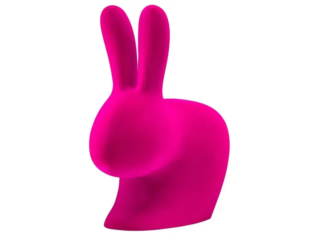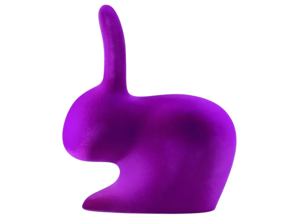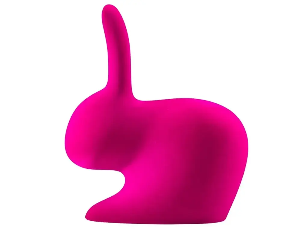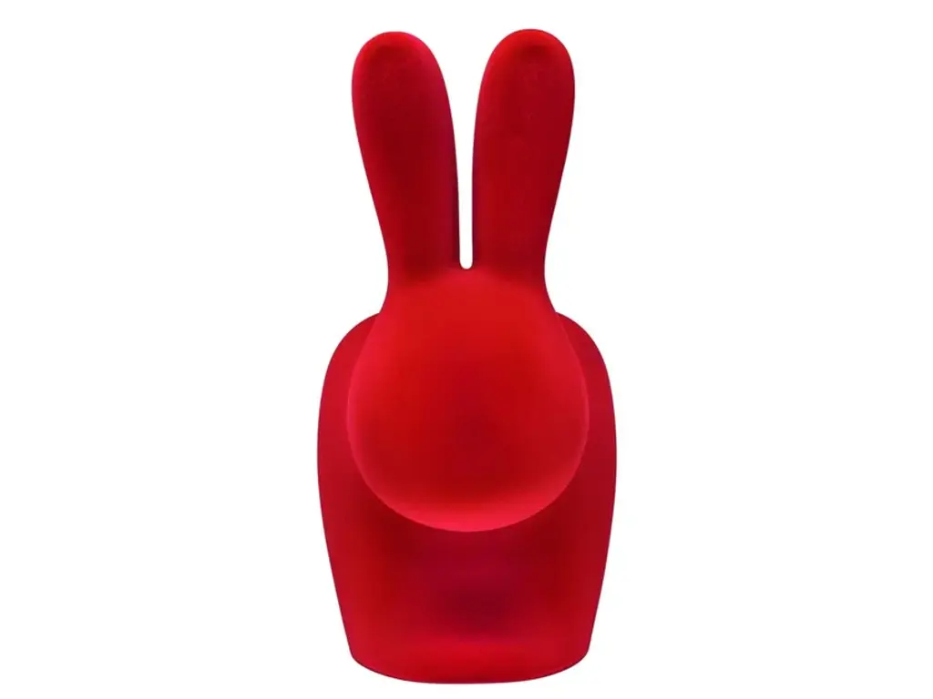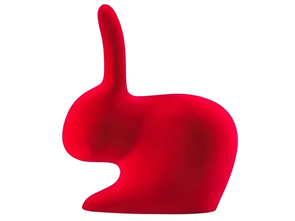 RABBIT CHAIR VELVET is a polyethylene chair designed by Stefano Giovannoni.Colors available: Dark Gold, Orange, Fuxia, Red, Purple, TurquoiseRabbit is one of Stefano Giovannoni’s hat tricks, which immediately became a pop icon, a symbol of love and fertility, which brings good luck and good wishes.The idea of the rabbit, a gentle, lovable and shy animal, comes from the association of its silhouette with the one of a seat, where the rabbit’s ears become the backrest of the chair.Designed originally in two versions, for adults and children, the Rabbit chair can be used to sit leaning against the ears or on the opposite side, riding it and resting the forearms on its ears. The two rabbits are also available in the LED light version suitable for both indoor and outdoor use.Most recently the family has seen the introduction of an XS size as well (22.5cm high) sold in three different versions: LED lamp, doorstopper and velvet finished bookend.