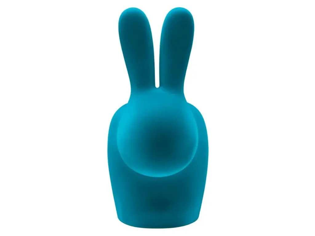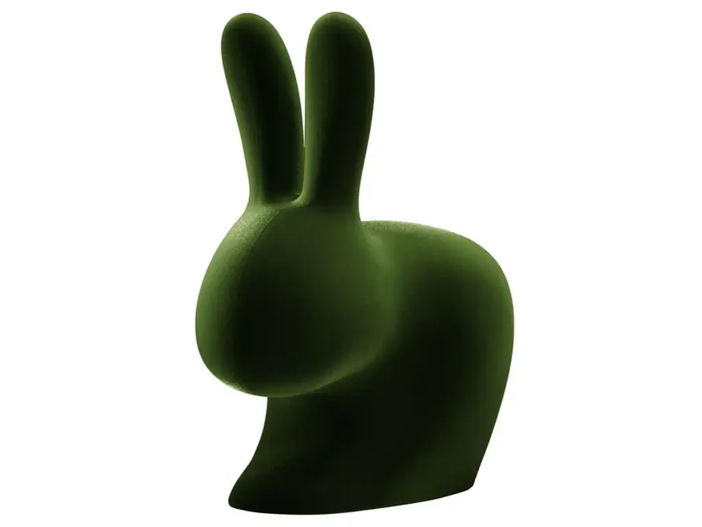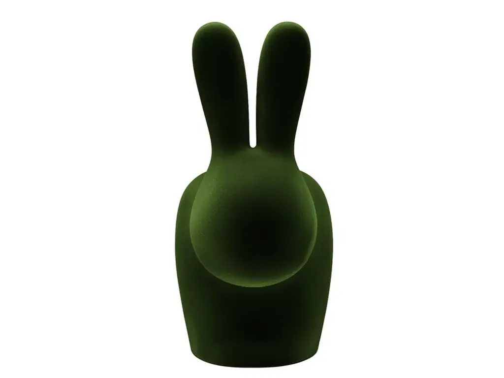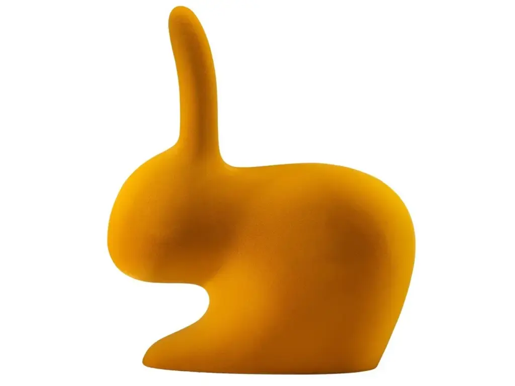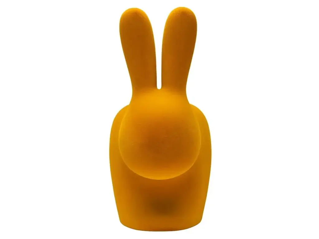 RABBIT CHAIR VELVET is a polyethylene chair designed by Stefano Giovannoni.Colors available: Dark Gold, Orange, Fuxia, Red, Purple, TurquoiseRabbit is one of Stefano Giovannoni’s hat tricks, which immediately became a pop icon, a symbol of love and fertility, which brings good luck and good wishes.The idea of the rabbit, a gentle, lovable and shy animal, comes from the association of its silhouette with the one of a seat, where the rabbit’s ears become the backrest of the chair.Designed originally in two versions, for adults and children, the Rabbit chair can be used to sit leaning against the ears or on the opposite side, riding it and resting the forearms on its ears. The two rabbits are also available in the LED light version suitable for both indoor and outdoor use.Most recently the family has seen the introduction of an XS size as well (22.5cm high) sold in three different versions: LED lamp, doorstopper and velvet finished bookend.
