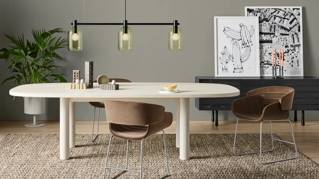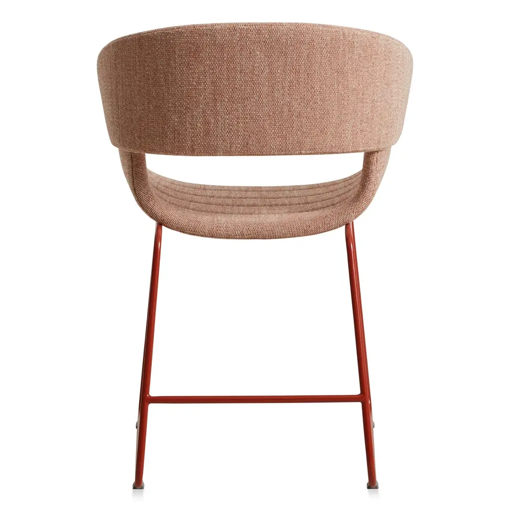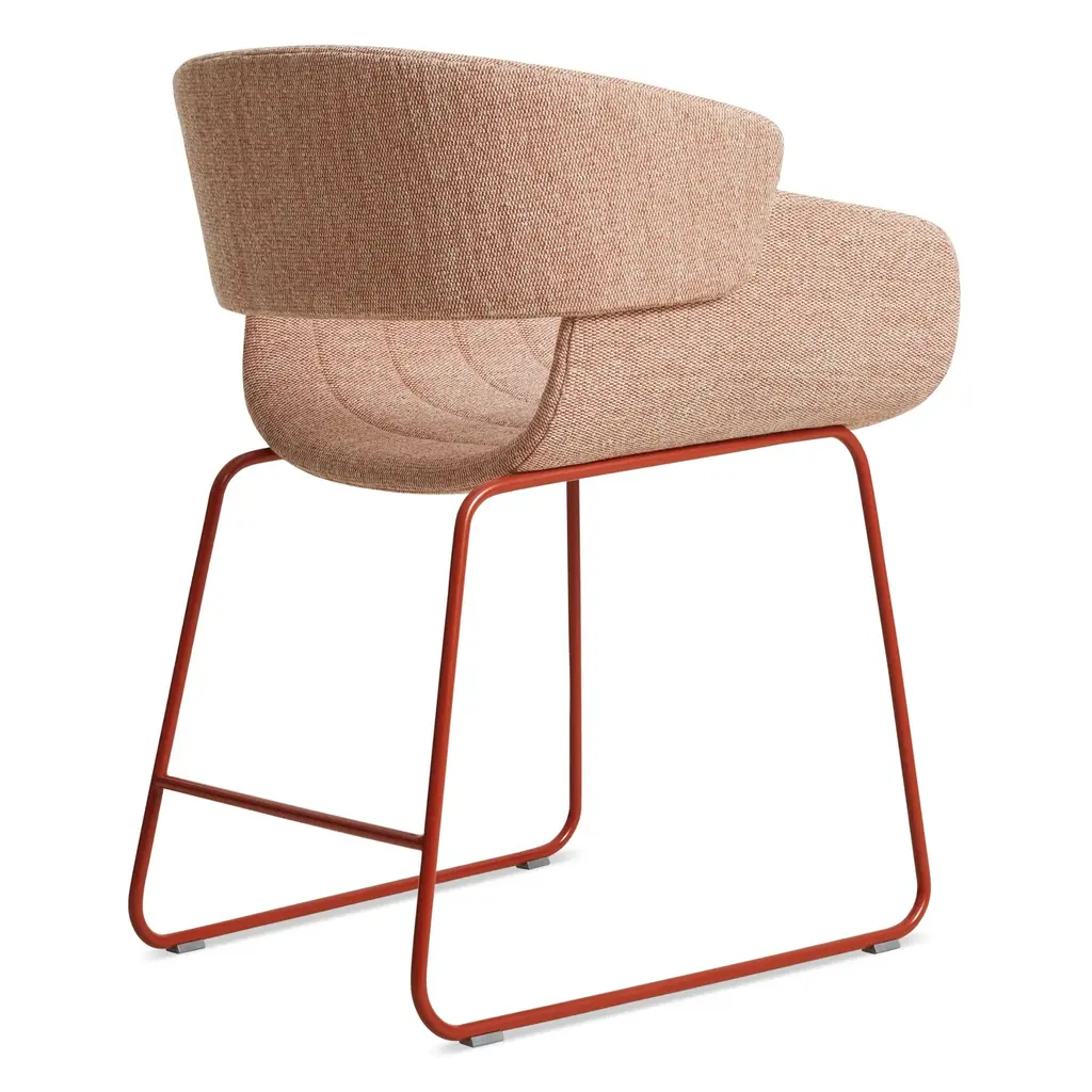 An upholstered seat and back work the curves and overlap just so to create a chair that invites you to sit down and stay awhile. The channel stitch detail may not improve the aerodynamics, but it sure does looks swell. With a color coordinated powder-coated steel sled base.
