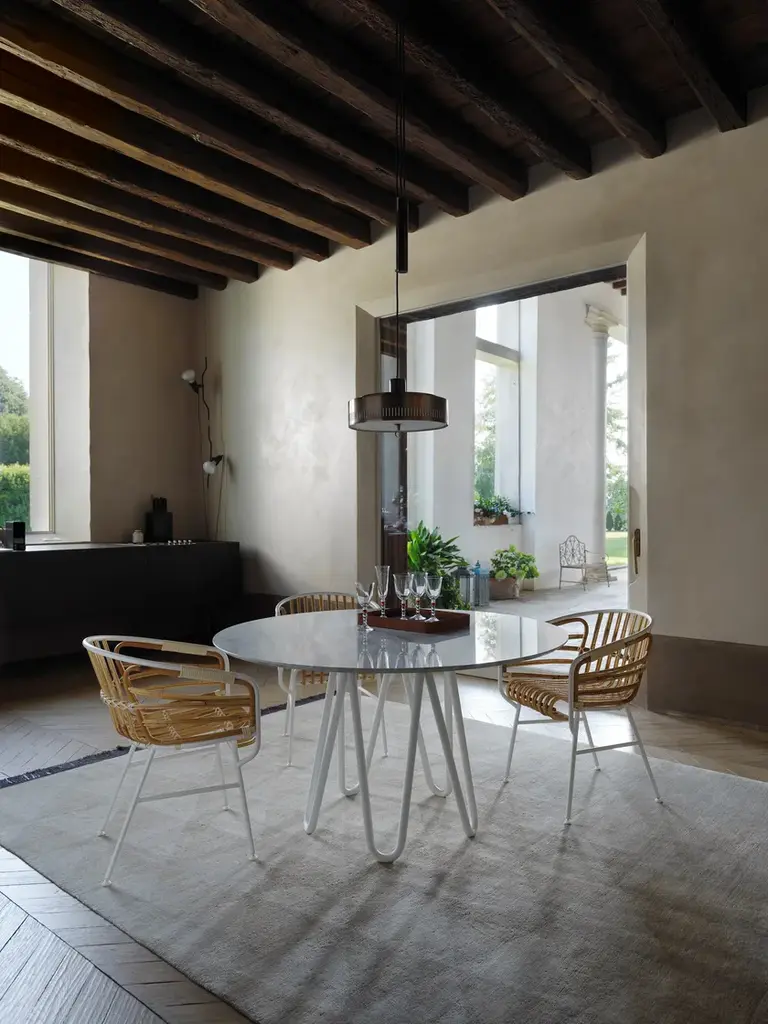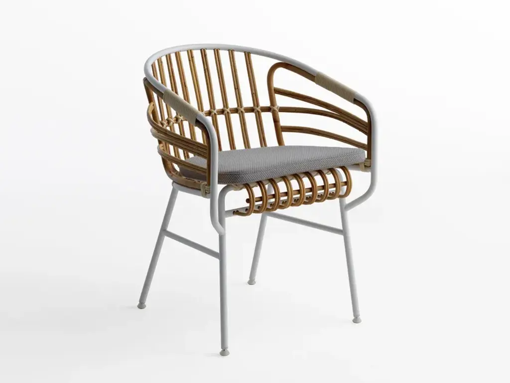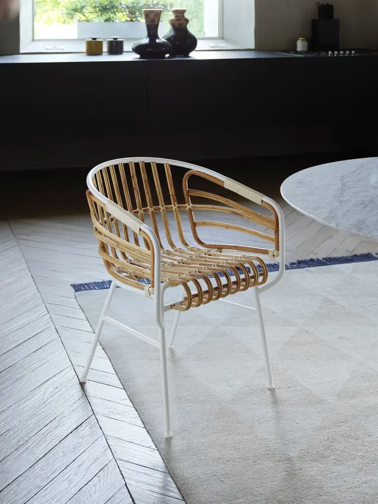 Raphia is the offspring of a research project into the use of materials and how they can be exploited as furnishings. It is the perfect convergence of modernity and tradition, of technology and craftsmanship. An oxymoron that brings together two of the spirits of production in Italy: the metal industry and the small timehonoured manufacturers of rattan and wicker products. The aim of the project is to lend a certain continuity to the tradition of crafting with rattan, one that stretches back to the beginning of the last century when the areas specialising in this craft saw schools and a culture revolving around this material thrive. Today, there remain very few firms which conserve the know-how of this trade, where manual skills and craftsmanship combine to insure that every creation is unique. Raphia embodies this history and tradition in a contemporary context, thanks to a harmonious balance between two materials: the metal structure is the base upon which the wicker and rattan are weaved to create the seating area. MATERIALS AND FINISHES Structure: embossed painted metal. Seat and back: natural rattan or painted fumè wicker.