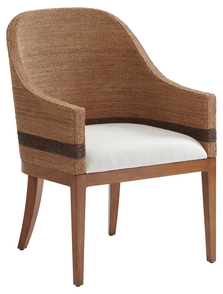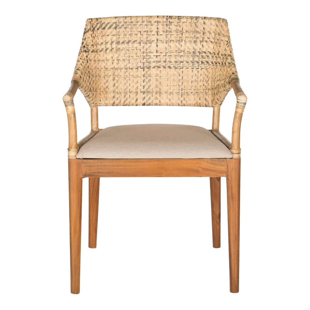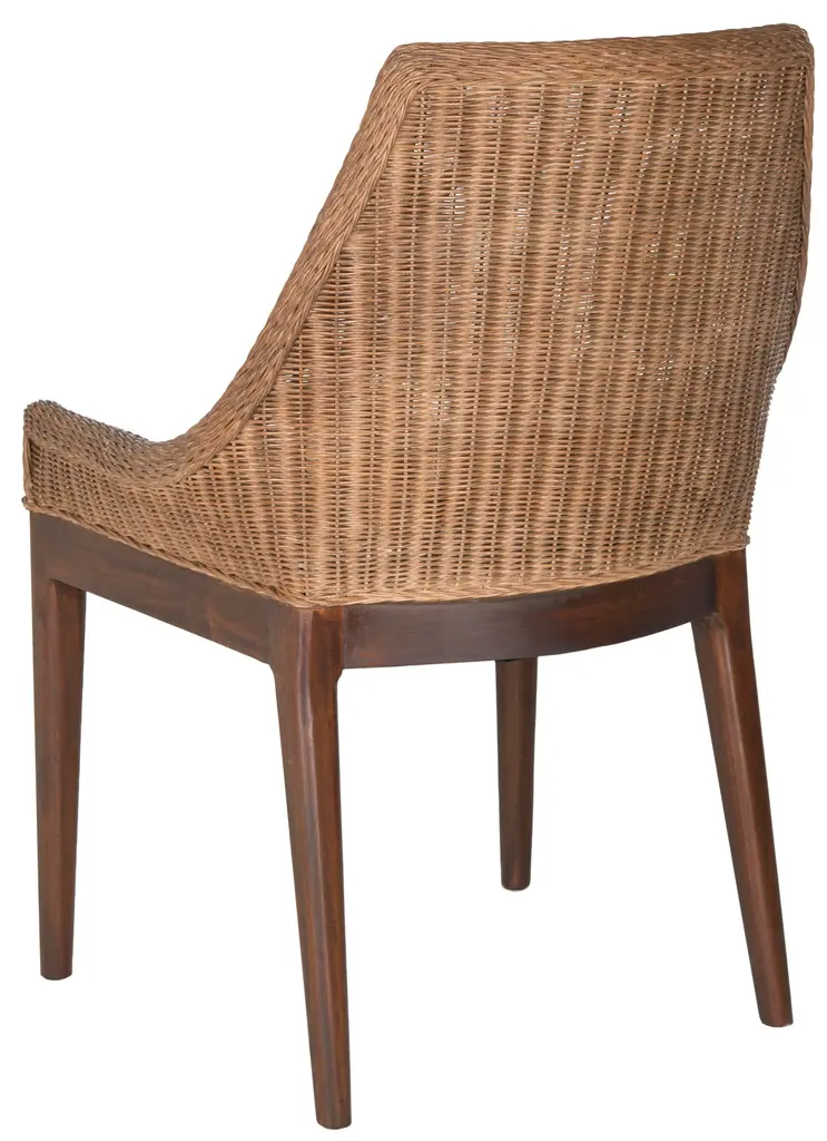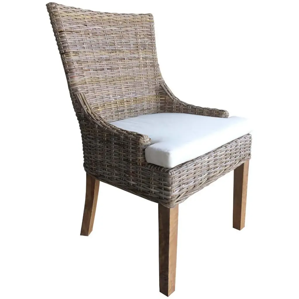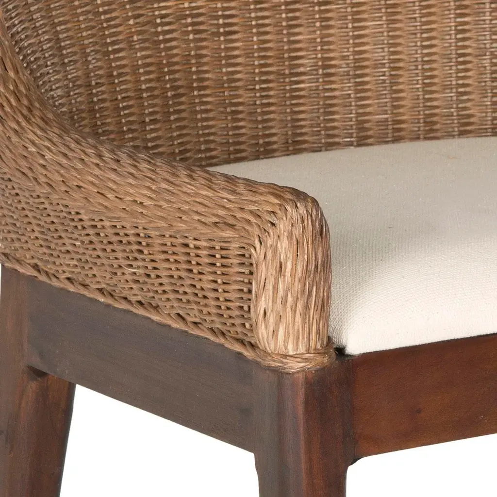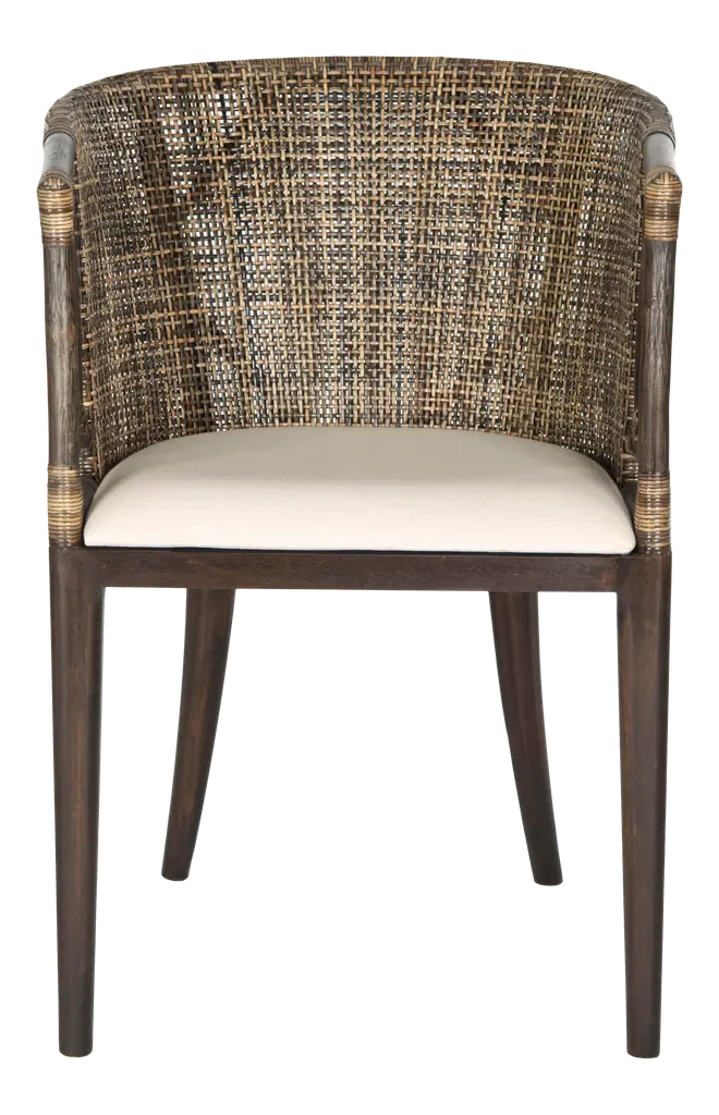 Park Avenue upgrade. the sloping chair combines classic transitional style with the natural beauty of finely woven rattan. Chic mahogany legs free tailored white upholstered cotton cushion ensure encounters over dinner or drinks. To prevent overall soiling, frequent vacuum light brushing is recommended. Cushions and pillows should be turned on a weekly basis. Down-filled cushions should be brushed rather than vacuumed. Spot clean, using a mild water-free solvent or dry cleaning product. Only a professional cleaner should undertake a complete overall cleaning. The use of steam or water-based cleaners may cause excessive shrinking or staining.