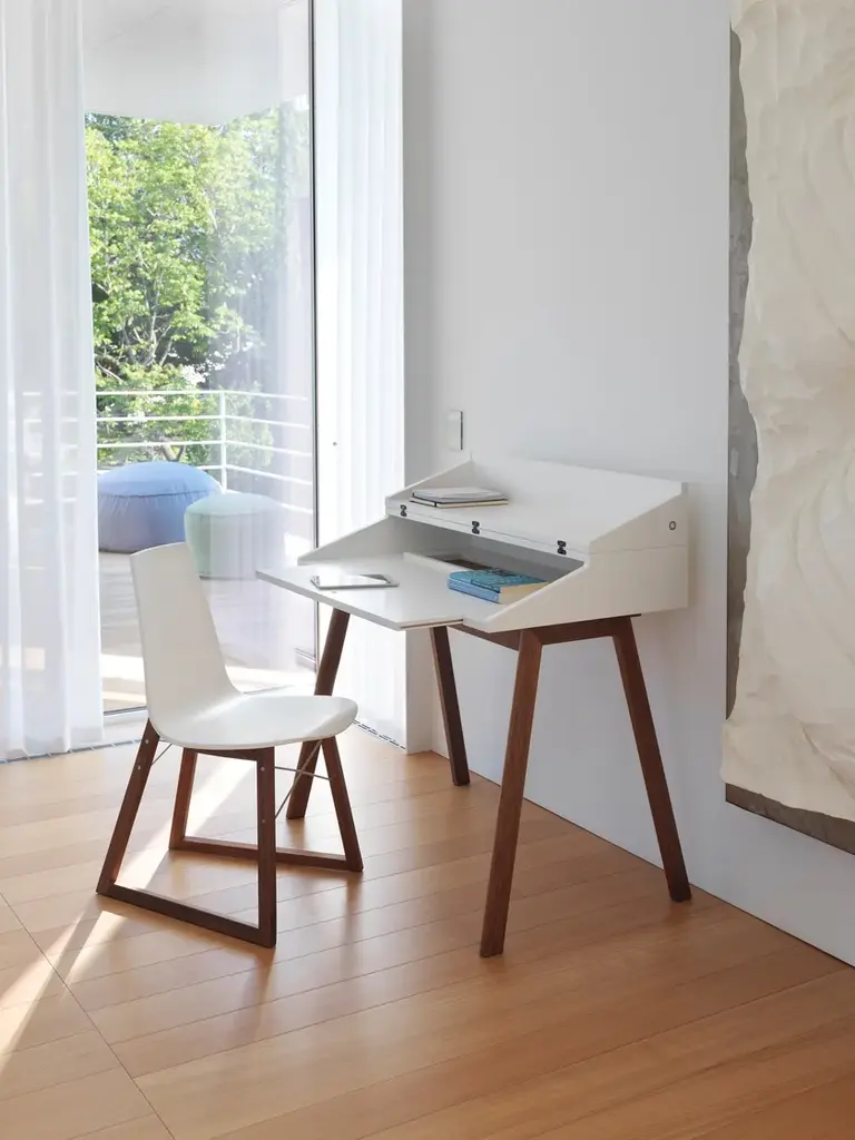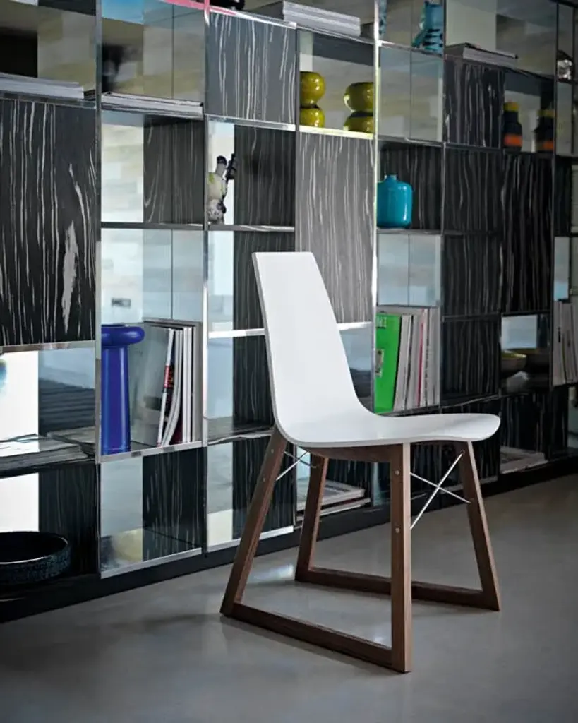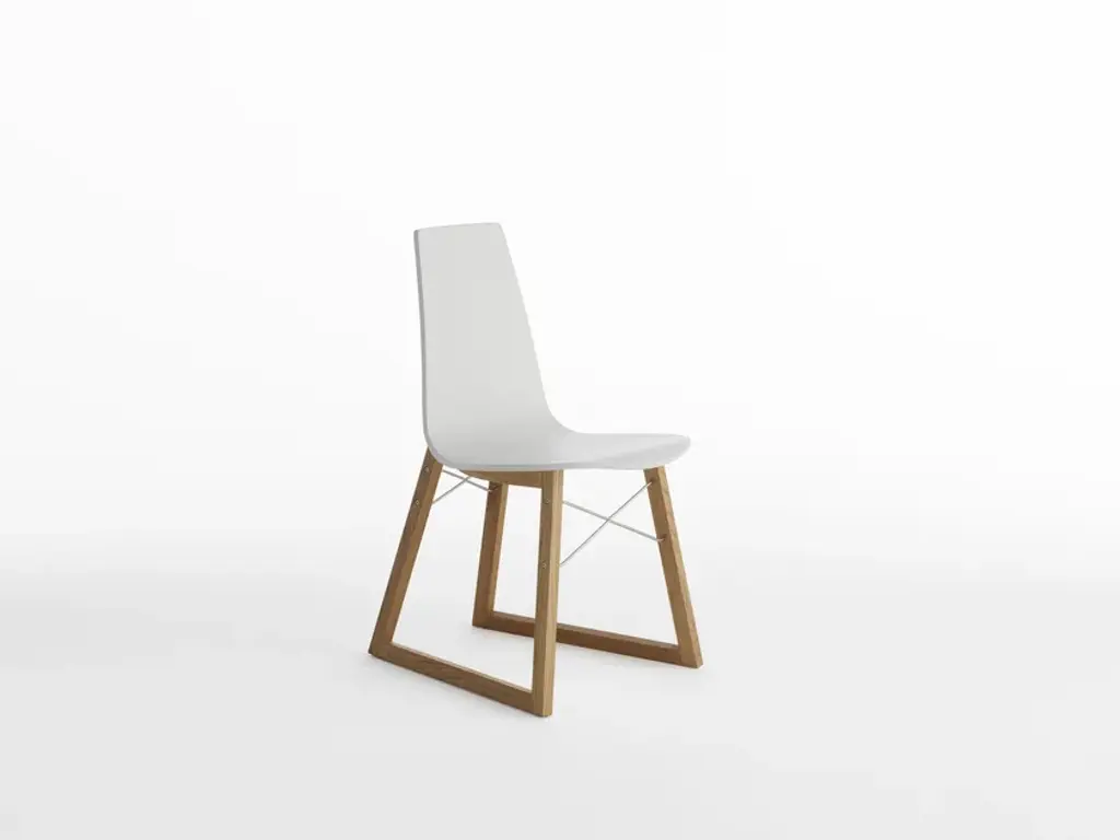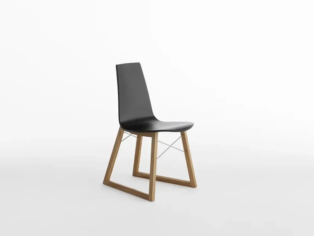 The name and the X that distinguish the front of this collection structure are a clear reference to Charles and Ray Eames. The comfortable curved plywood seat is supported by a sled made of wood or chrome rod, giving the Ray chair a strong aesthetic presence.Chair with curved plywood body, veneered or lacquered. Structure made from solid stained beech, walnut or chrome-plated steel bars. The bar version has chrome-plated steel cross-bars welded to each other and to the main bars. The wood version has chrome-plated steel cross-bars welded to each other and fixed on the structure with cylindrical head screws.FINISHBody: walnut, blackwhite wood, white, black, silver, yellow, graphite, gray, mocha, red, green, gold lacqueredStructure: chromed metal, whitened beech, mocha beech, walnutDIMENSIONS (LxDxH)cm 44x50x85 - 17.3” x 19.7” x 33.5”cm 44x56x80 - 17.3” x 22” x 31.5”