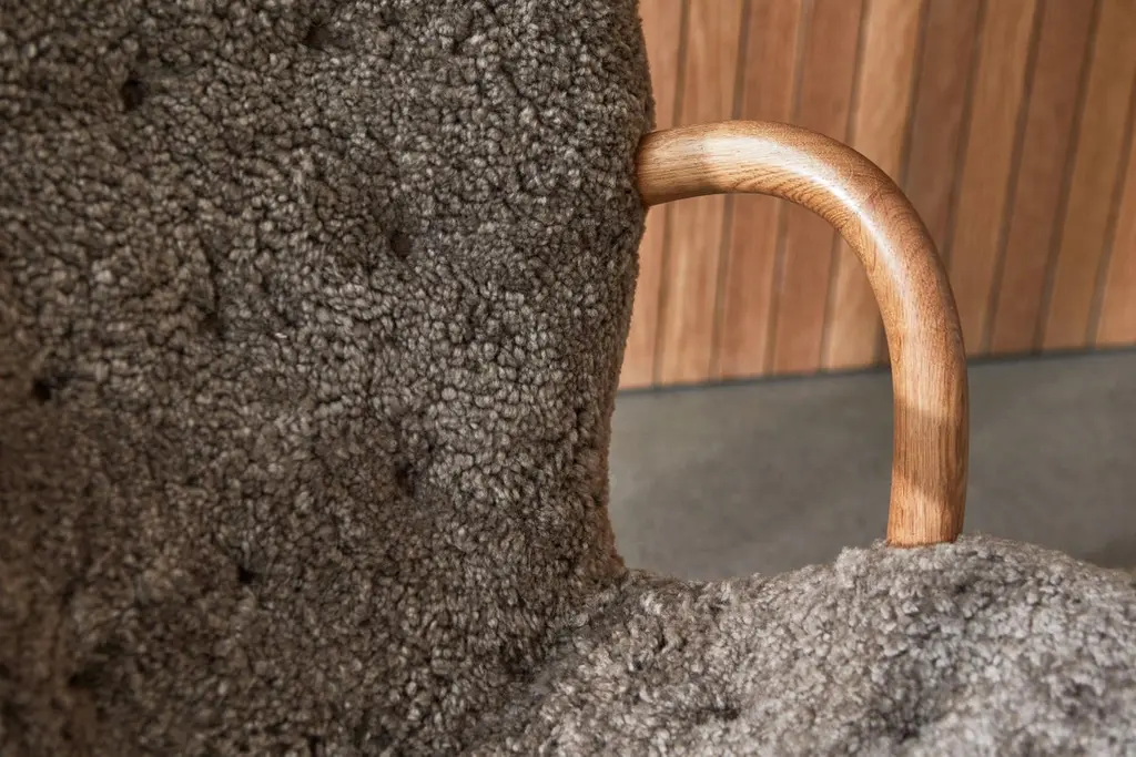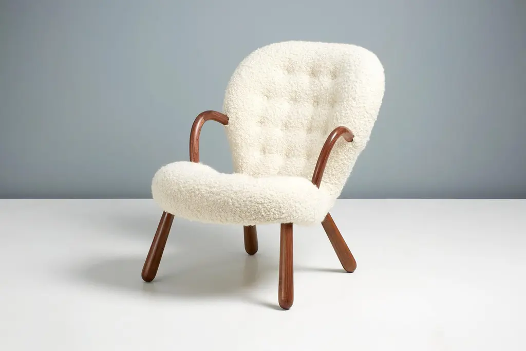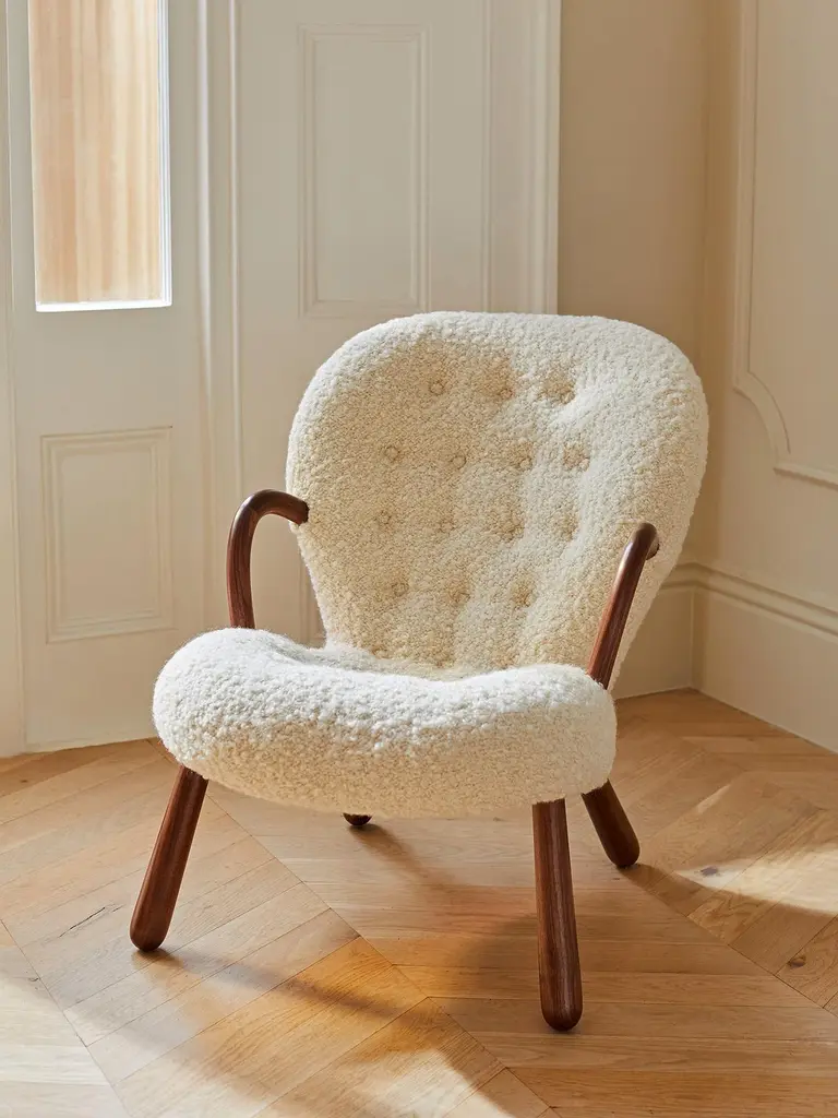 Official Re-Edition of the iconic Clam Chair by Arnold Madsen.Dagmar in collaboration with the estate of Arnold Madsen is proud to re-launch the Clam Chair - one of the most cherished and sought after Scandinavian furniture designs of the 20th century.Example shown: Pierre Frey Opio Boucle + Oiled walnut.The Clam Chair was first designed in 1944 in Copenhagen by Danish upholsterer Arnold Madsen. In 1945 Arnold founded the furniture company Madsen & Schubell together with the cabinetmaker Henry Schubell in order to produce this unique chair that became known as the Muslingstol or Clam chair due to its’ unique shape. Arnold & Henry achieved great commercial success with the Clam chair in Denmark and then in 1953 signed the exclusive rights to Norwegian manufacturers Vik & Blindheim who continued production in Norway until the 1960s. Over the years the Clam chair has become one of the most misattributed and copied designs of the 20th Century. But now, thanks to extensive recent research the history of the Clam has finally been corrected to show Arnold Madsen as the one true designer. Dagmar is proud to relaunch this iconic Scandinavian design in conjunction with the estate of Arnold Madsen for 2022 as part of our new Heritage Collection. This new production remains true to the original chair and Arnold's vision for the design. It features a solid beech wood frame and arms and legs made from either solid oak or walnut in a range of finishes. The Clam chair is available in a wide range of upholstery and wood finishes and is made exclusively by Dagmar.Height: 82cm (32.3”)Depth: 80cm (31.5”)Width: 65cm (25.6”)Seat Height: 42cm (16.5")