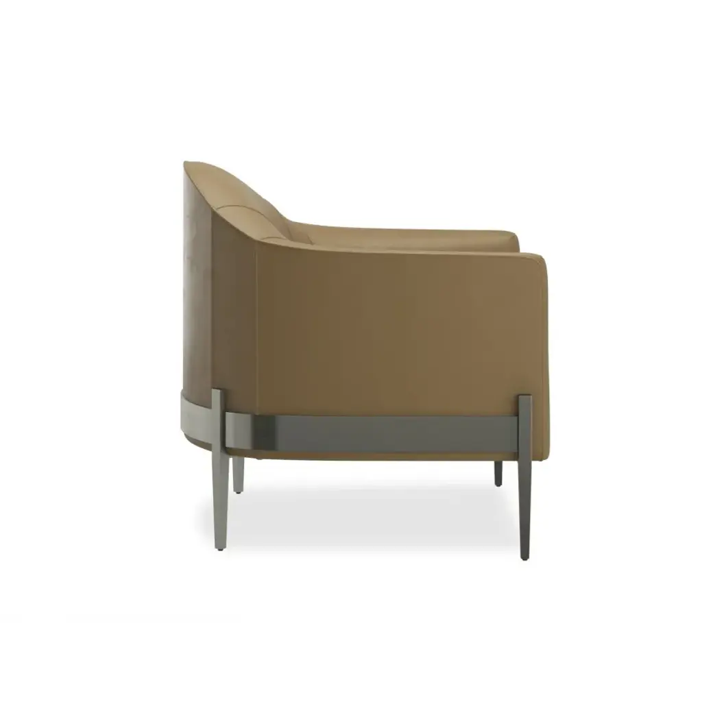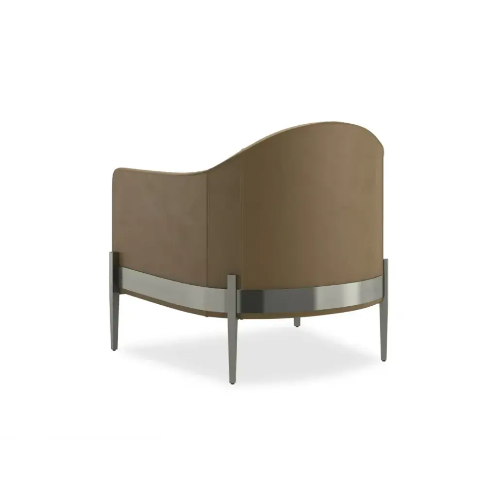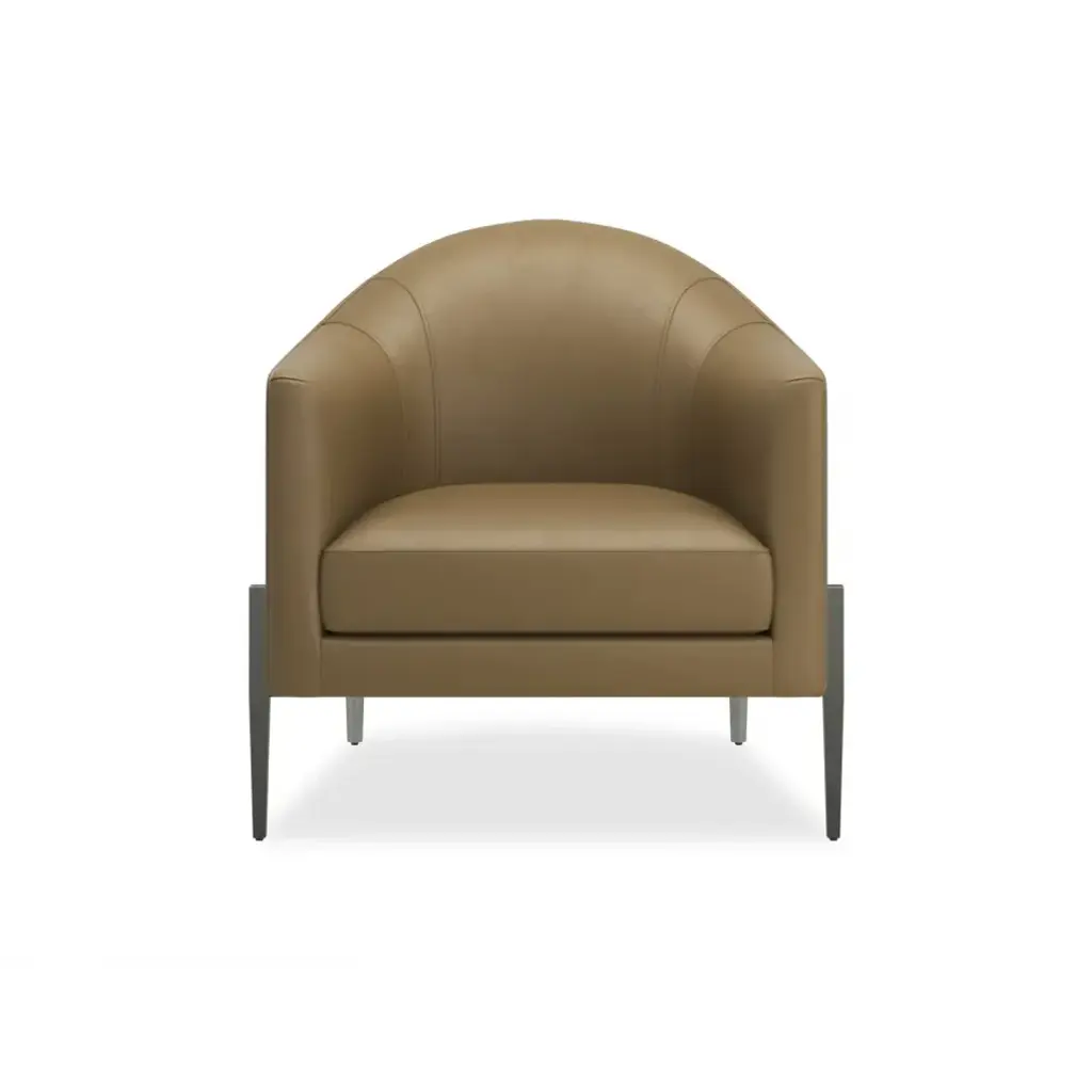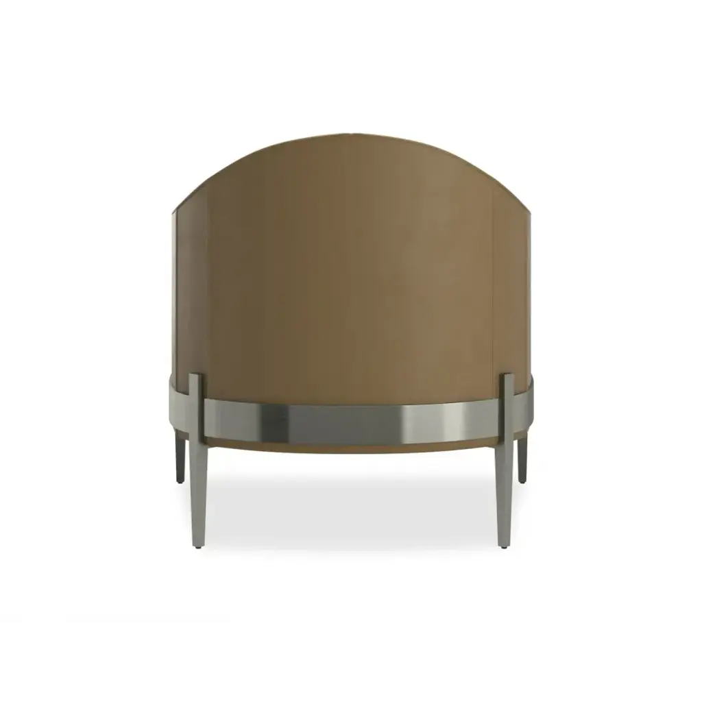 A charismatic modern barrel chair offers smart styling in soft camel pebbled leather with a Smoked Stainless metal base and tapered legs. Generously scaled, the intriguing mix of materials are a whimsical play on a classic cask design. Place this modern marvel anywhere you want a bit of WOW or put two together by the fireplace for a modern conversation area.