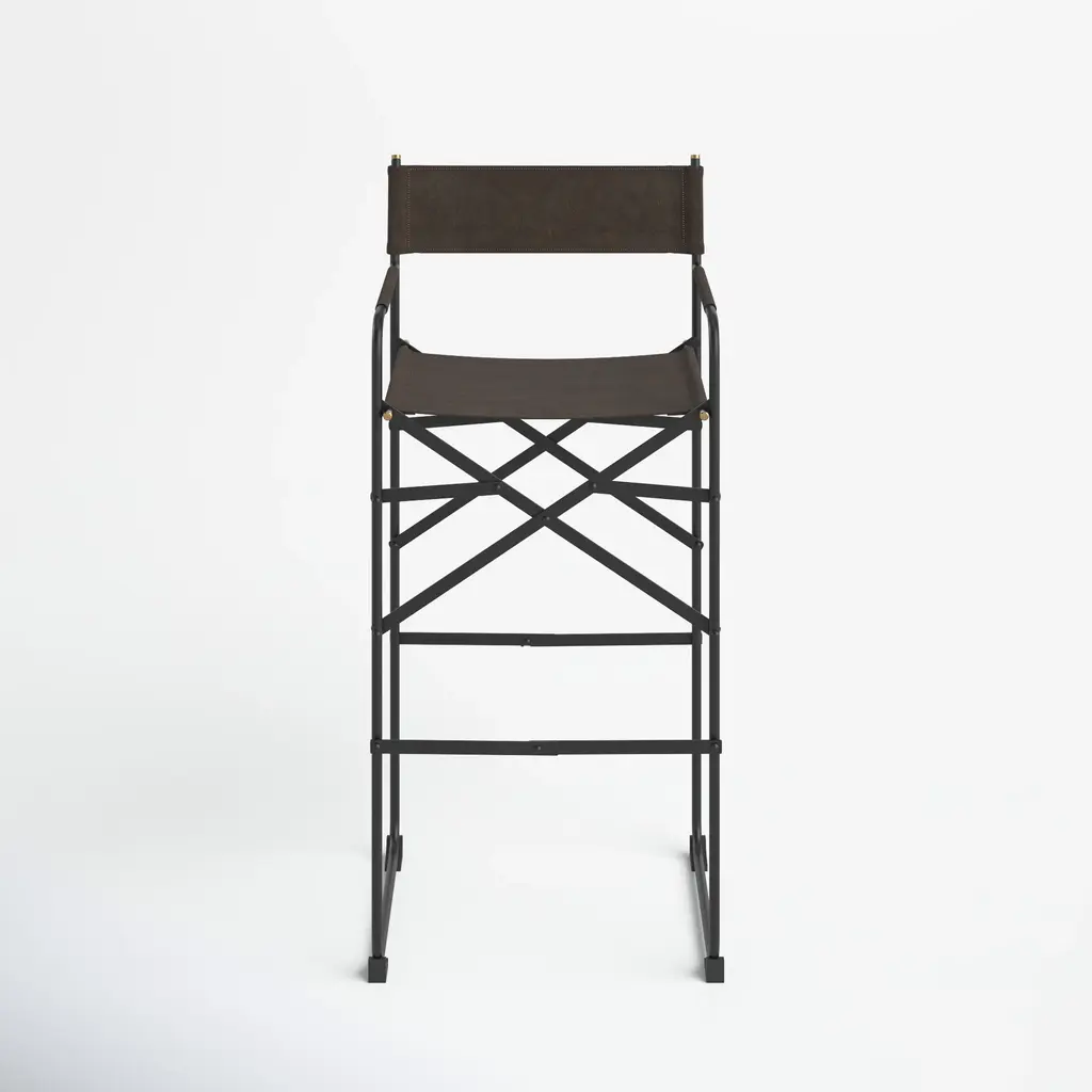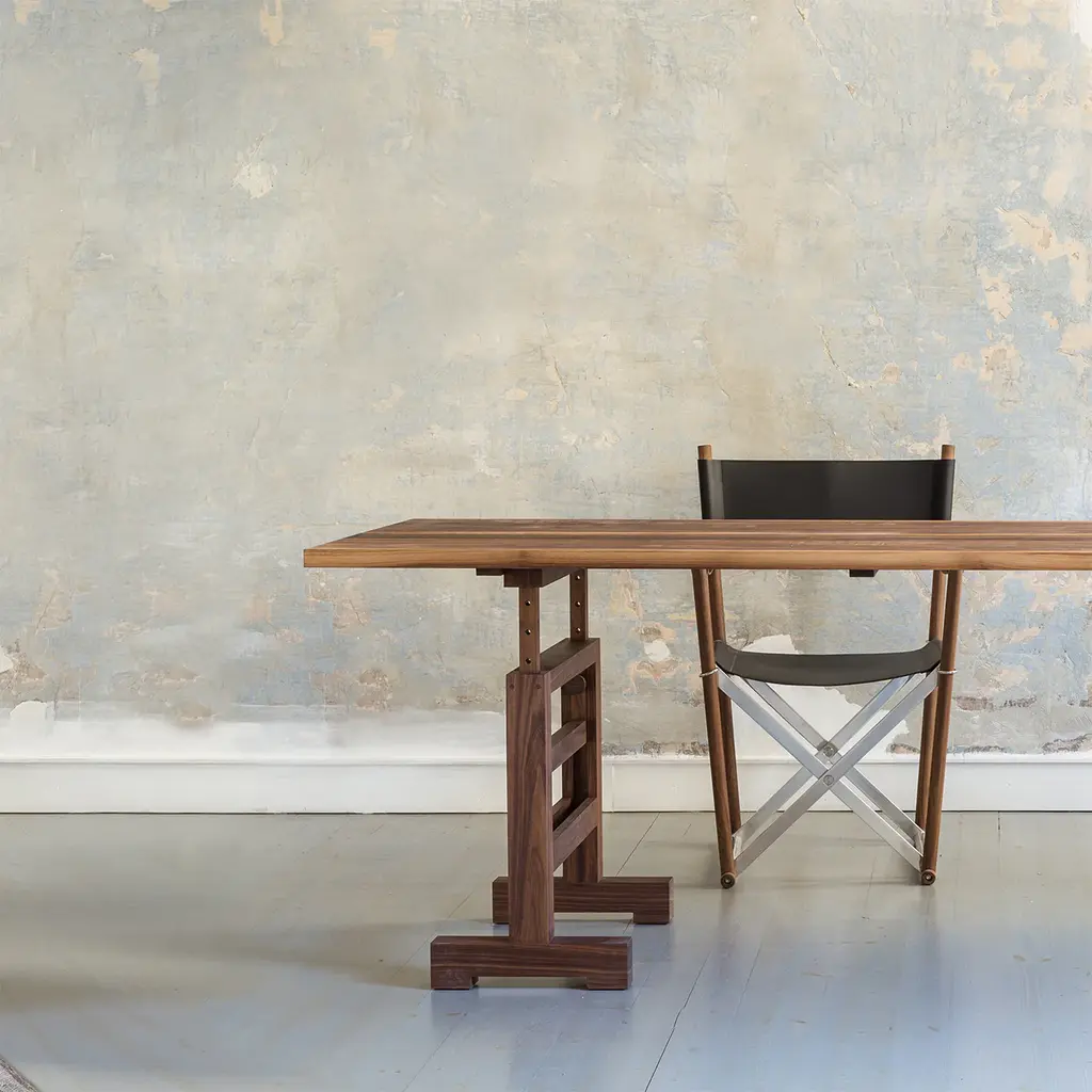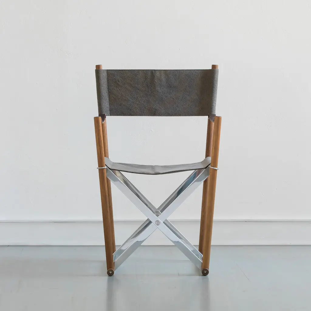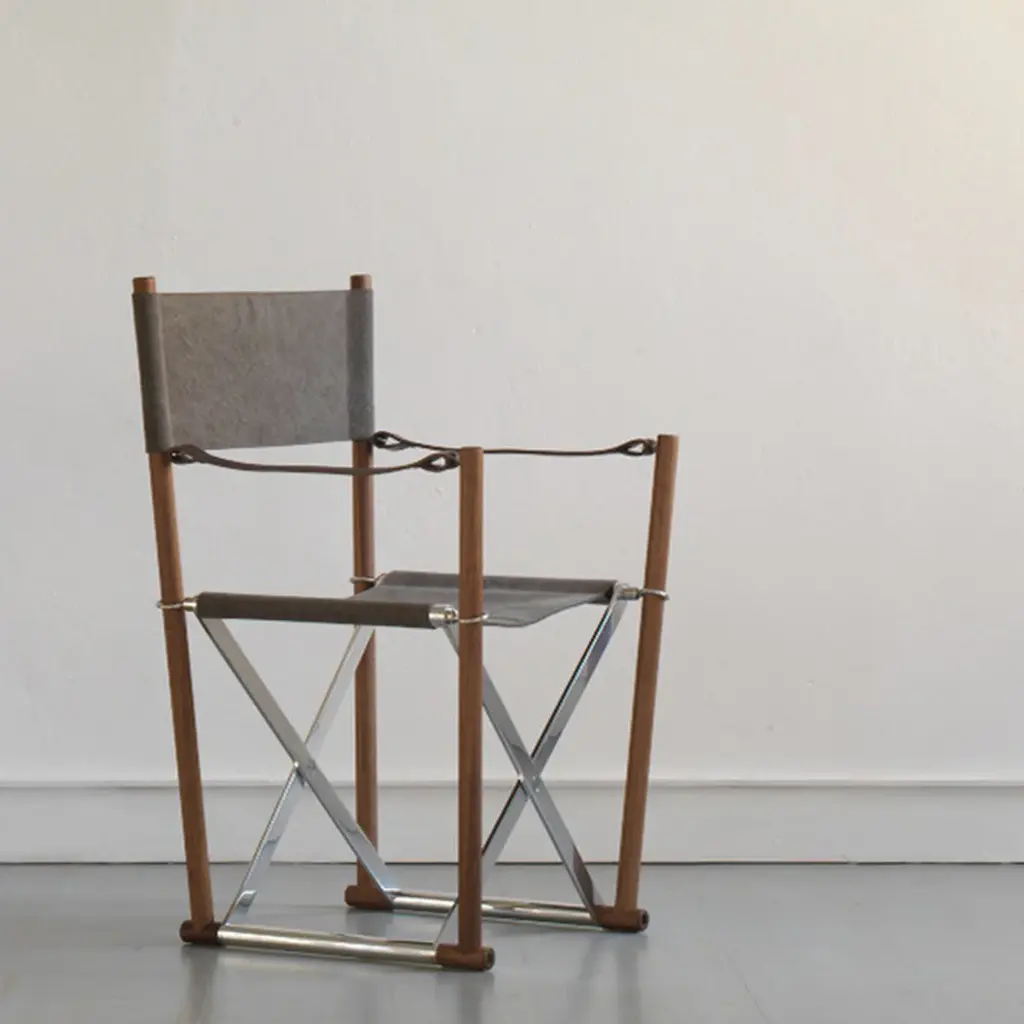 This is a modern take on the classic Director's Chair. The structure of the chair is of solid iroko or rosewood, whereas the seat and back are 100% cotton. The armrests are full-grain or distressed leather. The pivots are in stainless steel, while the joints, rods and crossbars are in polished aluminum. Suitable for outside use, only if not directly exposed to rain.