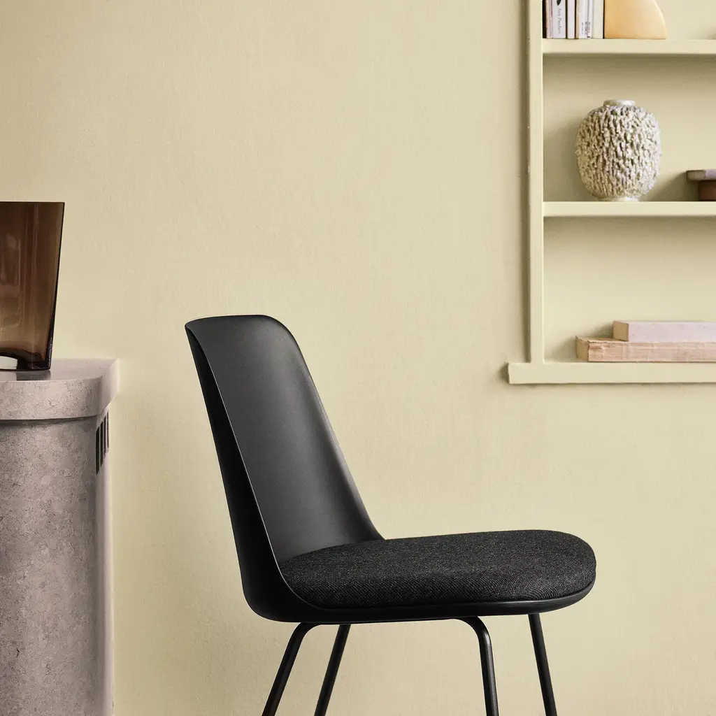 Continuing &Tradition's eco-friendly Rely series, HW7 boasts an custom seat cushion to go with its shell crafted from 100% recycled plastic. Designed by Hee Welling, the molded form and inherent ergonomics embody his signature fusion of practicality and extended comfort. The chair is available in a range of winning colors with steel-tube legs in black or bronze powder coat and a range of upholstery fabrics and leather.