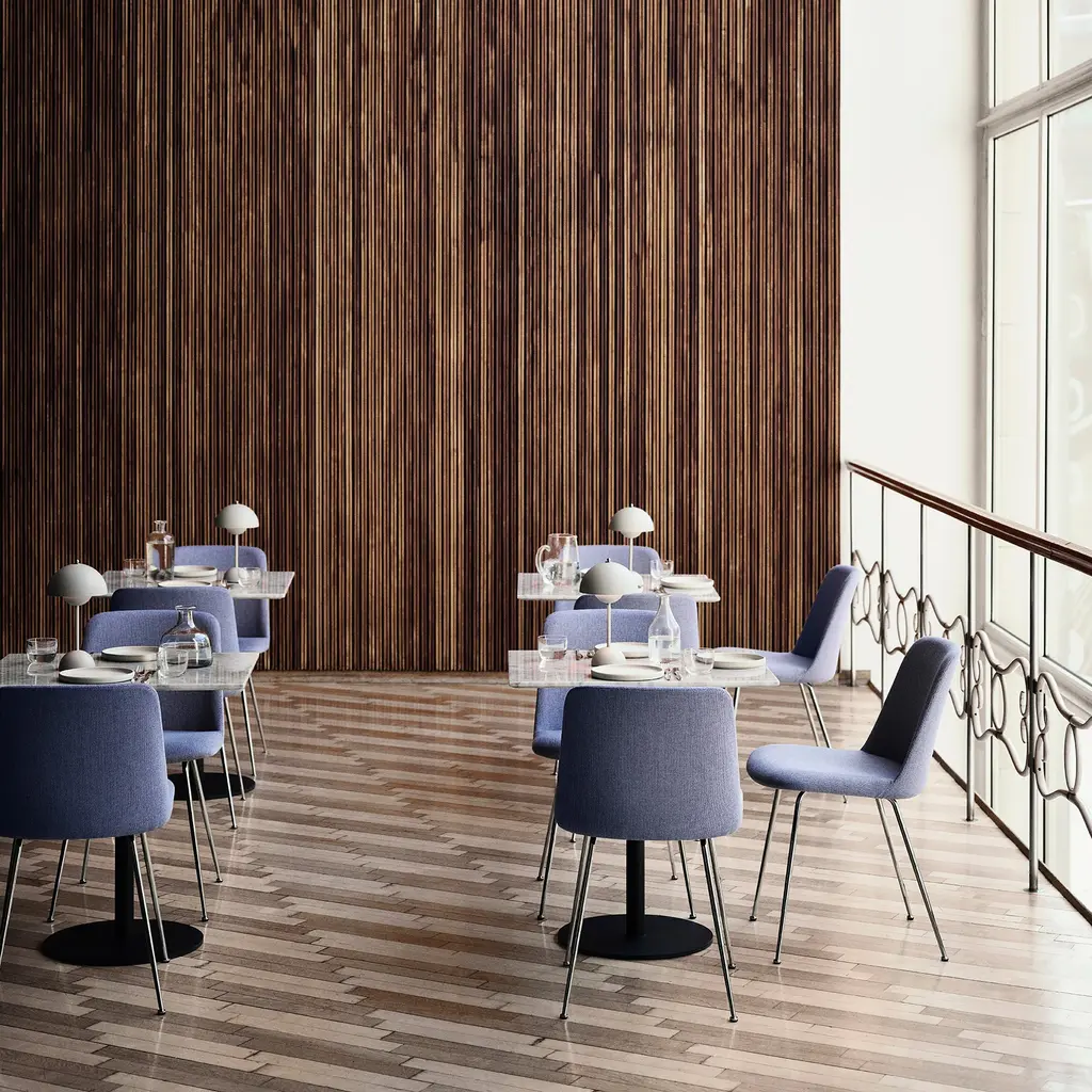 Copenhagen-based &Tradition's pathbreaking molded shell chair made from 100 percent recycled plastic also comes in a custom-upholstered model with a sturdy steel tube base. With its contours clad in HR foam covered with fine fabric or buttery leather upholstery, Rely from Danish designer Hee Welling recasts the touchstone Scandinavian shell chair in a version that combines extended comfort with eco-friendly bonafides. To complement the chosen chair covering, the tubular base is available in a black powder-coat, bronzed or chrome option.