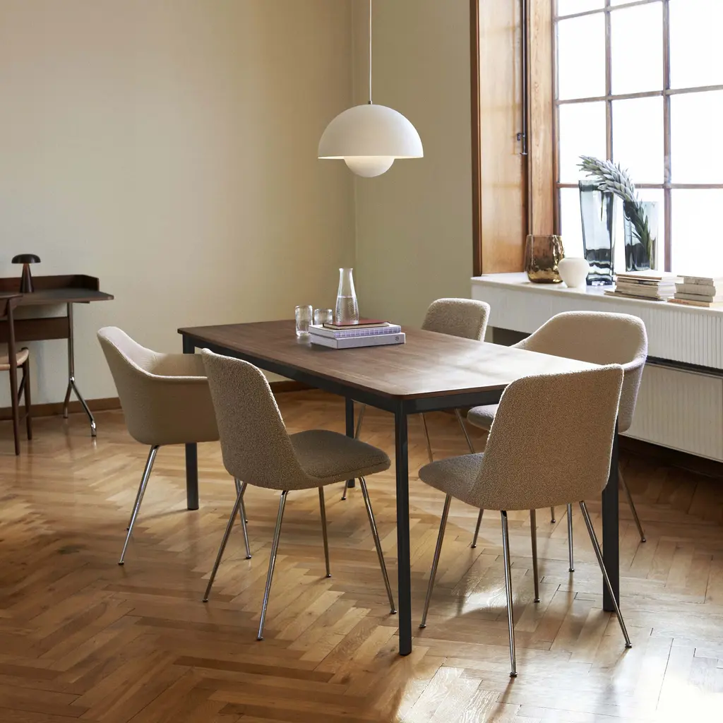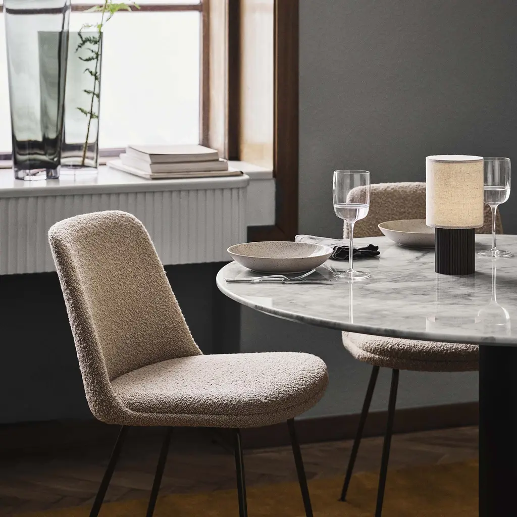 Copenhagen’s &Tradition offers its innovative shell chair made from 100 percent recycled plastic in a completely upholstered version with a matching seat cushion on a sturdy steel tube base. Sheathed in premium fabric or leather over HR foam, Rely maintains its distinctive silhouette while offering an additional measure of comfort. Danish designer Hee Welling’s timely revamp of a Scandinavian classic comes with the option of the tubular base in a black powder-coat, bronzed or chrome finish.