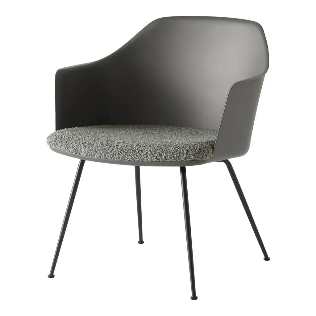 Featuring the same minimalist design cues as the rest of the Rely collection, &Tradition offers a roomy lounge chair version with an upholstered seat cushion. Designer Hee Welling recasts the Nordic molded shell with a 21st century take in recycled plastic with versatility to place at a dining table, deskside or simply on its own. In a range of desirable polypropylene hues with splayed steel-tube legs in black or bronzed options, the chair offers customization with leather or textile over HR foam for the seat cushion.