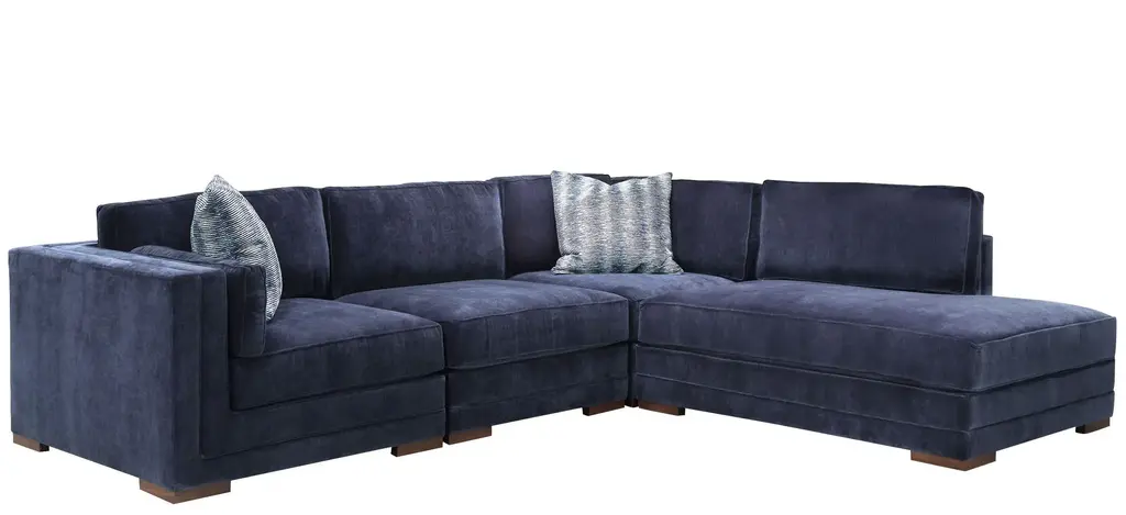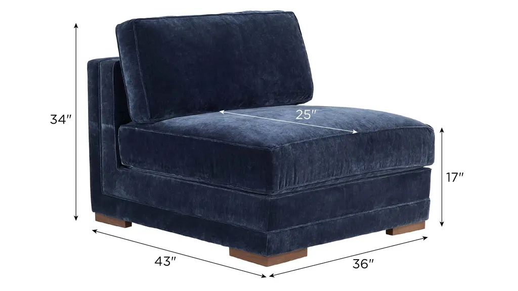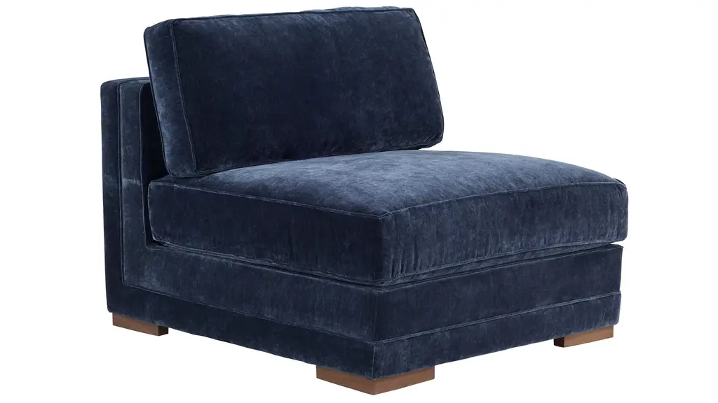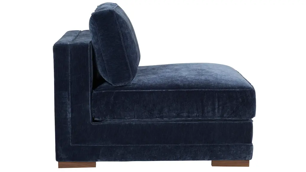 Imagine coming home to the soothing softness and super spacious comfort of the Remmi Armless Chair. In rich indigo chenille, this piece's low profile and bold squared lines are emphasized by inverse welt detailing up the arms and around the back. Loose back and seat cushions give it versatility to the max. Fashion forward and enduring, the Remmi promises to be a family favorite for years to come.