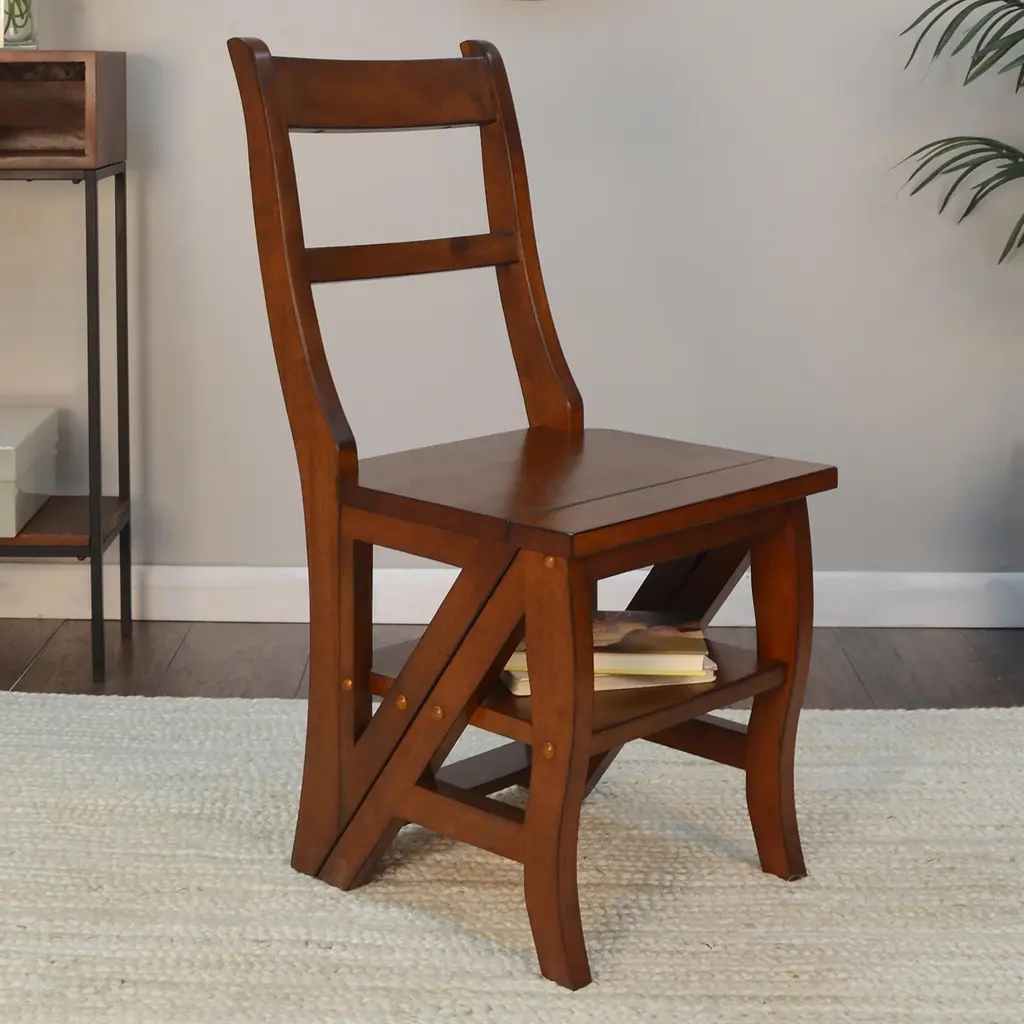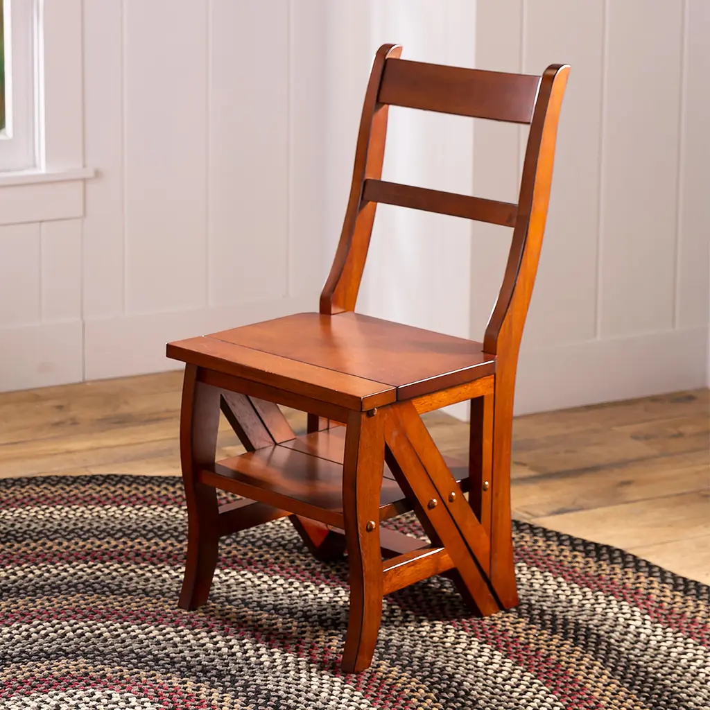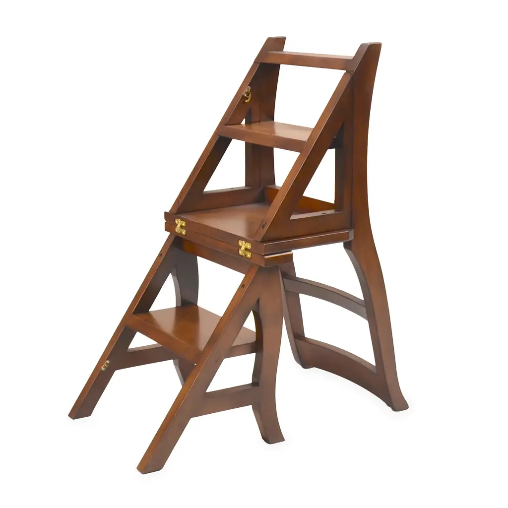 Amaze your guests with the unique transformation of this handsome reproduction of a Benjamin Franklin design. Classically styled with multi-functionality, it goes from a chair to a handy step ladder in a snap. Simply undo the hinge, flip over the top half and get easy access to higher cabinets or shelves. Perfect for every home, this beautiful chair/ladder combo is made from solid select parawood known for its strength and handsome grain. The piece is finished with a multi-step chestnut finish for a look that blends with any decor. As attractive as it is practical, this clever chair will certainly be a conversation starter! Every home should have one, and it makes a great gift.