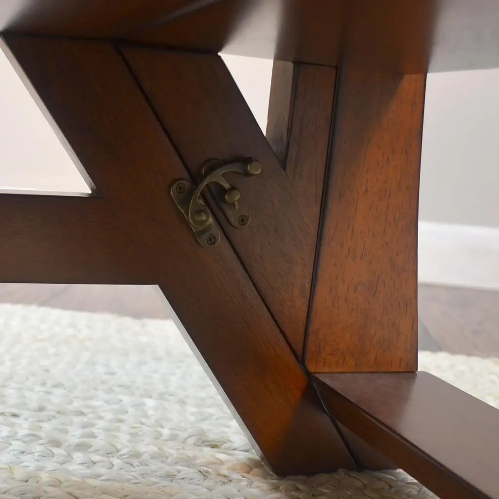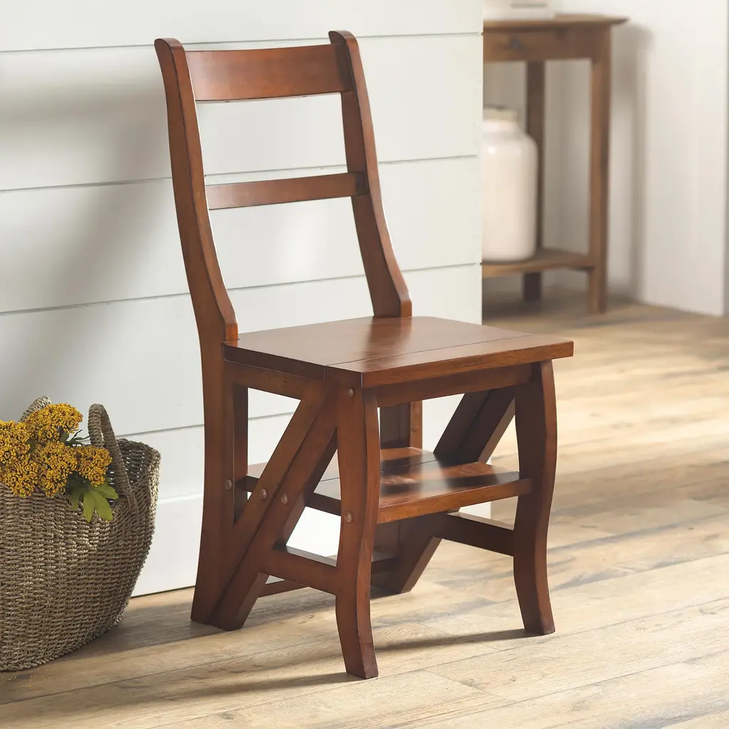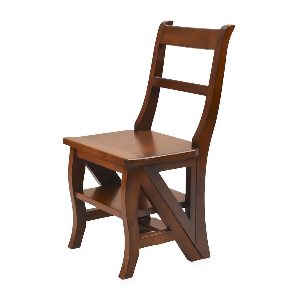 Amaze your guests with the unique transformation of this handsome reproduction of a Benjamin Franklin design. Classically styled with multi-functionality, it goes from a chair to a handy step ladder in a snap. Simply undo the hinge, flip over the top half and get easy access to higher cabinets or shelves. Perfect for every home, this beautiful chair/ladder combo is made from solid select parawood known for its strength and handsome grain. The piece is finished with a multi-step chestnut finish for a look that blends with any decor. As attractive as it is practical, this clever chair will certainly be a conversation starter! Every home should have one, and it makes a great gift.