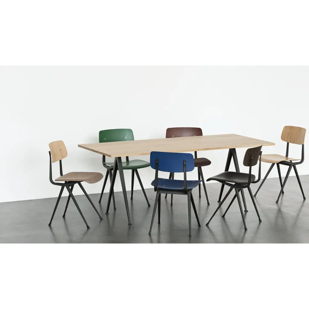 The Result chair, designed by Friso Kramer and Wim Rietveld for Ahrend in the 1950s, has been relaunched by HAY in collaboration with Ahrend. A simplistic combination of sleek steel frame and curved plywood seat and back, Result was regarded in the 50s as a masterpiece in the innovative use of sheet steel, and it has maintained its fresh appearance until today. Thanks to its light and functionalist design, Result used to be a popular chair in Scandinavian schools, and it has been widely used in both public and private contexts. Framer and Rietveld created the Result chair as a pair for the Pyramid table, which makes a perfect match for the chair. Result is available in several different combinations of base colors and wood finishes. In 2021, HAY renewed the surface treatments of its wood furniture by replacing the paints and lacquers with more environmentally friendly, water-based alternatives. This chair is of newer production and has been finished with a water-based lacquer.