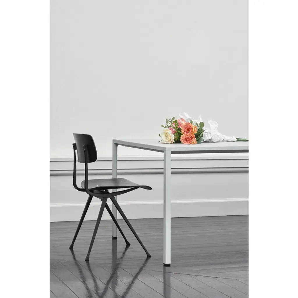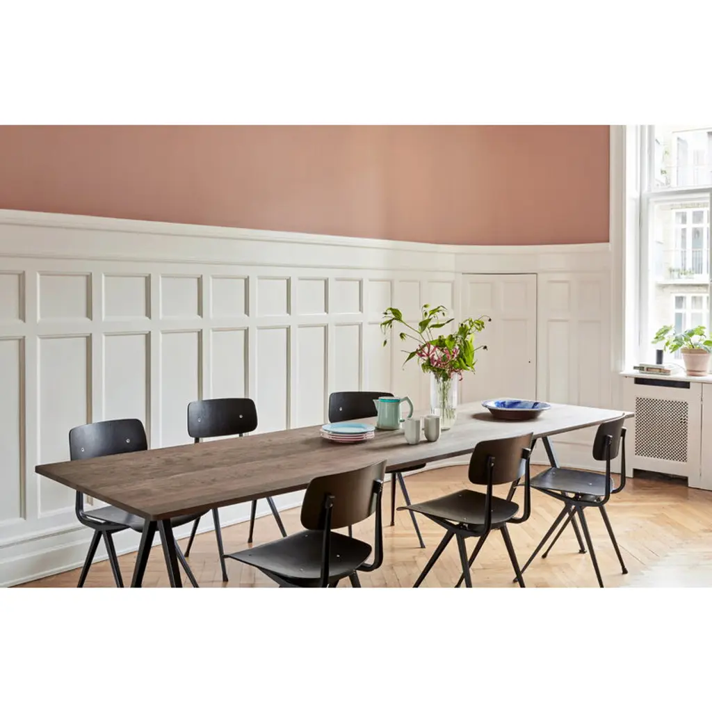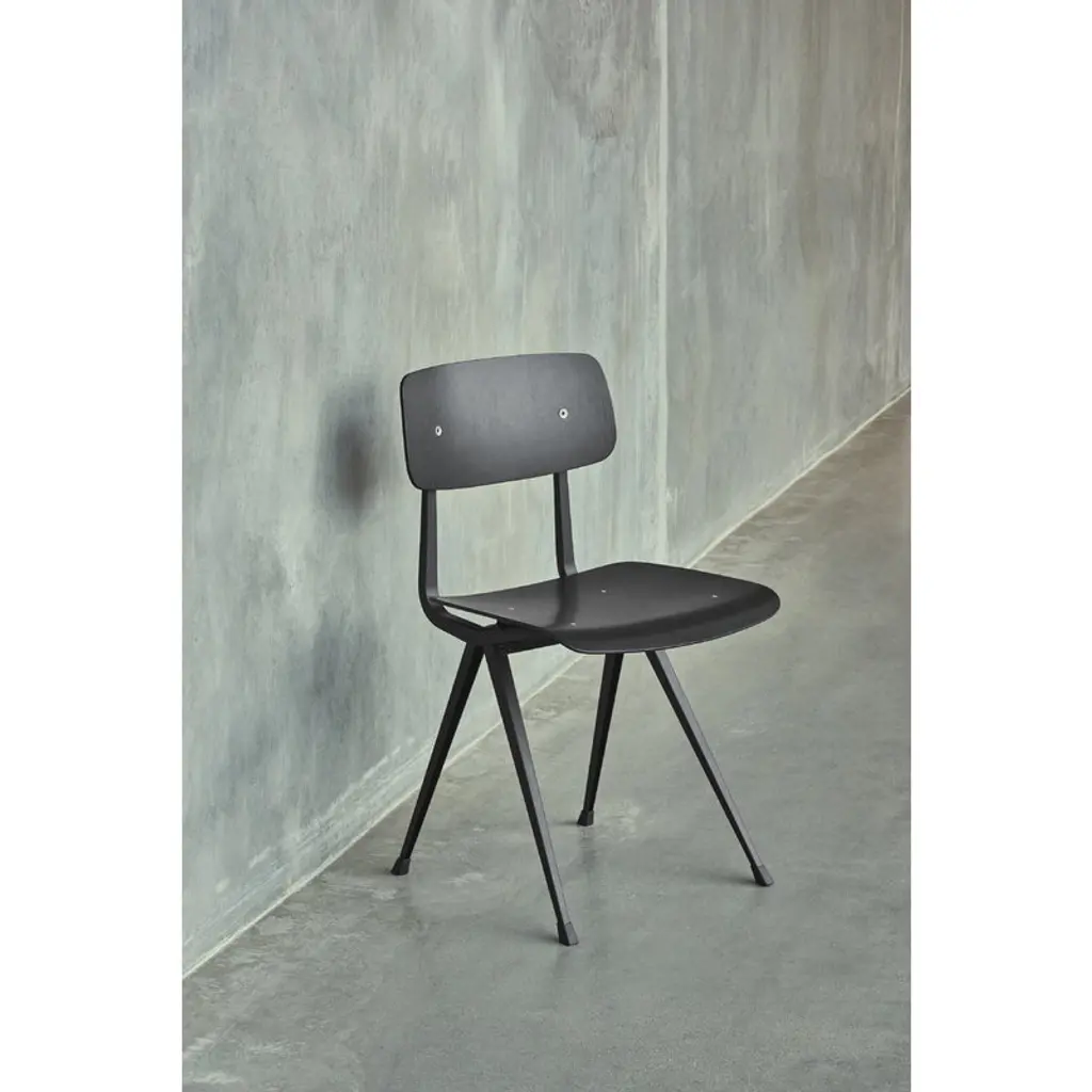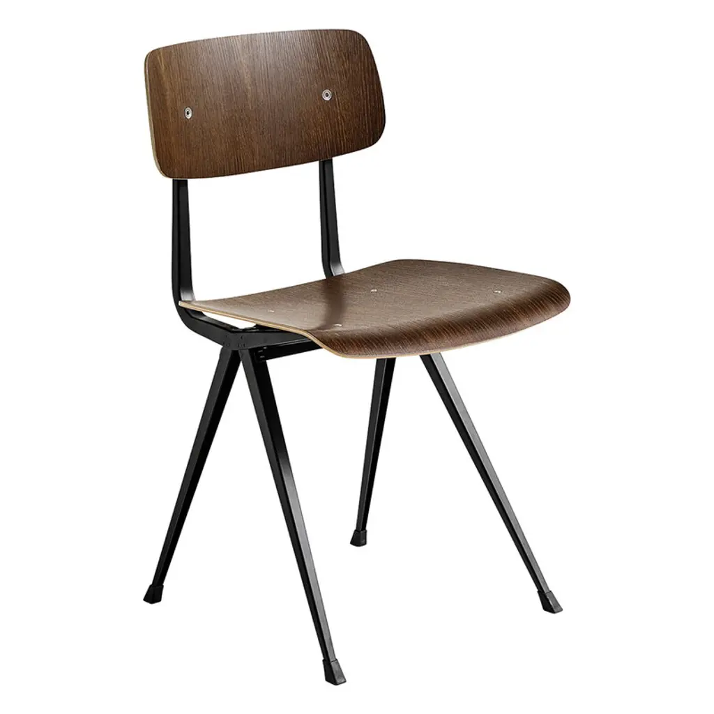 The Result chair, designed by Friso Kramer and Wim Rietveld for Ahrend in the 1950s, has been relaunched by HAY in collaboration with Ahrend. A simplistic combination of sleek steel frame and curved plywood seat and back, Result was regarded in the 50s as a masterpiece in the innovative use of sheet steel, and it has maintained its fresh appearance until today. Thanks to its light and functionalist design, Result used to be a popular chair in Scandinavian schools, and it has been widely used in both public and private contexts. Framer and Rietveld created the Result chair as a pair for the Pyramid table, which makes a perfect match for the chair. Result is available in several different combinations of base colors and wood finishes. In 2021, HAY renewed the surface treatments of its wood furniture by replacing the paints and lacquers with more environmentally friendly, water-based alternatives. This chair is of newer production and has been finished with a water-based lacquer.