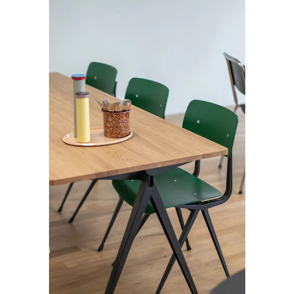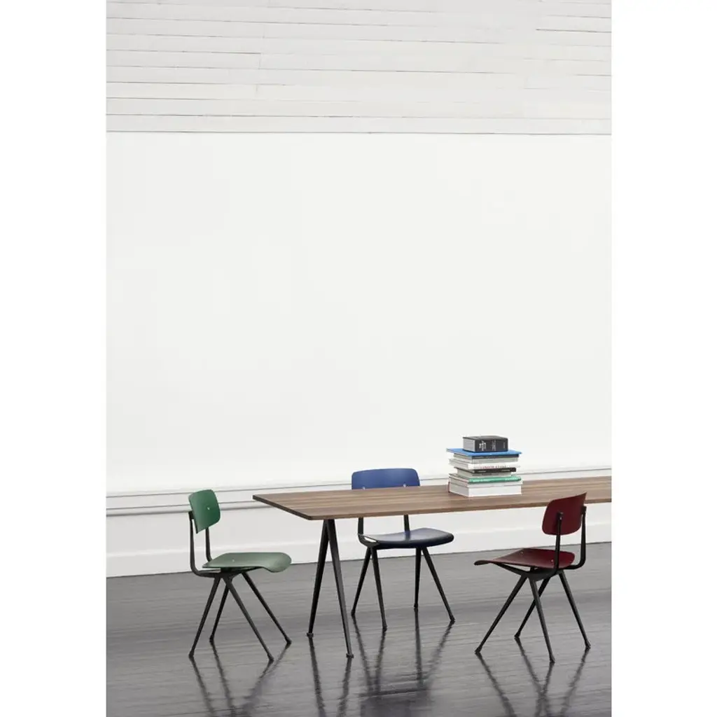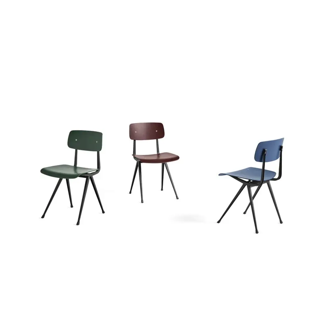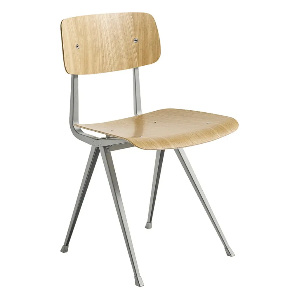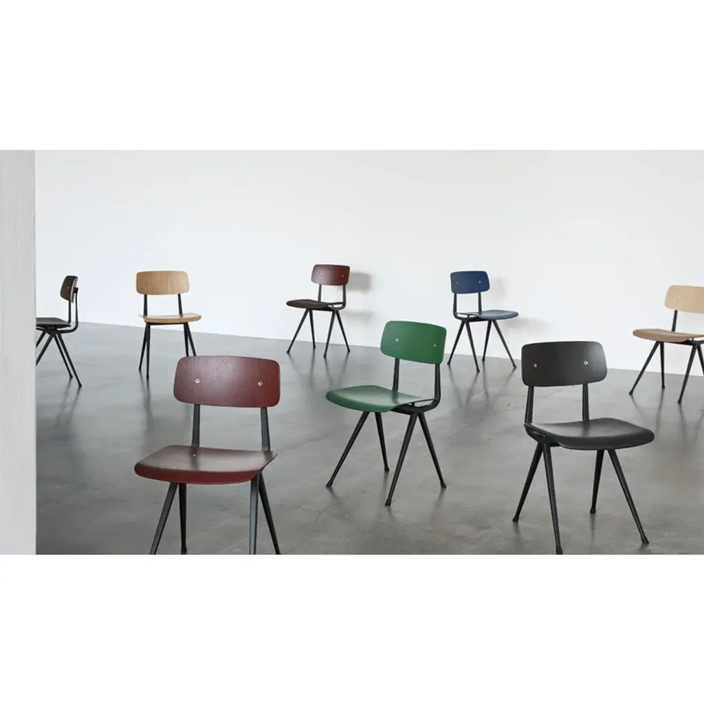 The Result chair, designed by Friso Kramer and Wim Rietveld for Ahrend in the 1950s, has been relaunched by HAY in collaboration with Ahrend. A simplistic combination of sleek steel frame and curved plywood seat and back, Result was regarded in the 50s as a masterpiece in the innovative use of sheet steel, and it has maintained its fresh appearance until today. Thanks to its light and functionalist design, Result used to be a popular chair in Scandinavian schools, and it has been widely used in both public and private contexts. Framer and Rietveld created the Result chair as a pair for the Pyramid table, which makes a perfect match for the chair. Result is available in several different combinations of base colors and wood finishes. In 2021, HAY renewed the surface treatments of its wood furniture by replacing the paints and lacquers with more environmentally friendly, water-based alternatives. This chair is of newer production and has been finished with a water-based lacquer.
