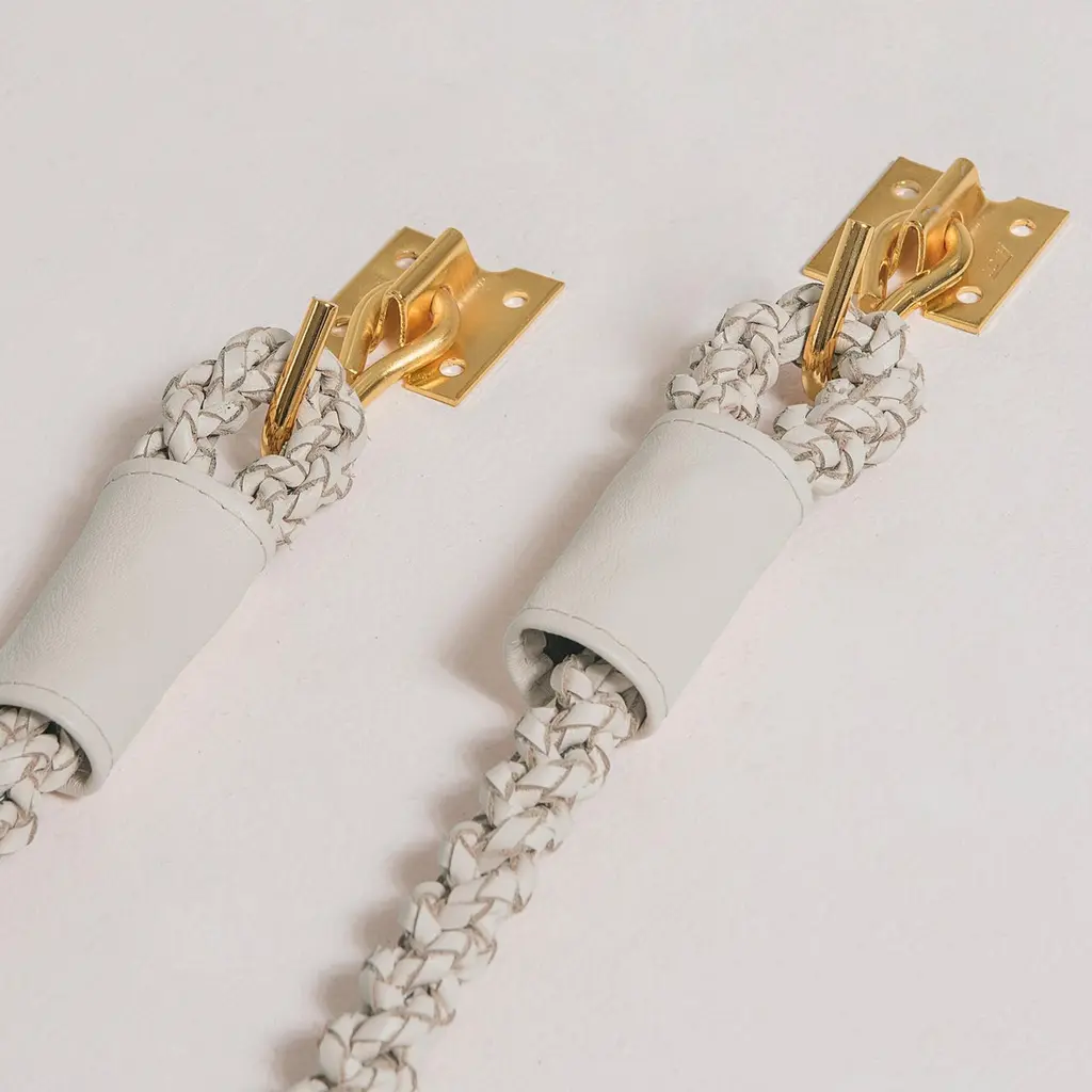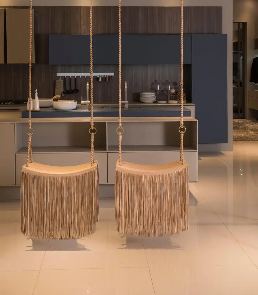 The project starts from leather threads, valuing the manual work of various craft techniques, such as braids, cords, chains and fringes.The chains were represented in three-dimensional shape with leather braids and internal steel wire. The fringes, a detail that is in vogue in fashion, and that brings a visual effect of flight in the movement of the swing, from the basic technique of the customized leather cord.The result is a sophisticated design piece, an indoor swing. Created as a unique work of art, by being hand braided.The seat is upholstered with light foam on the surface and has an elegant texture effect.All metallic finishes are gilded.Supports weight up to: 100KgAccompanies support to secure to the ceiling with 8 screws for installation.This piece was launched at the 2016 ICFF fair, then at the Hampton Designer Show House, and Design Weeks in Milan, Rome, Paris, Stockholm and São Paulo.