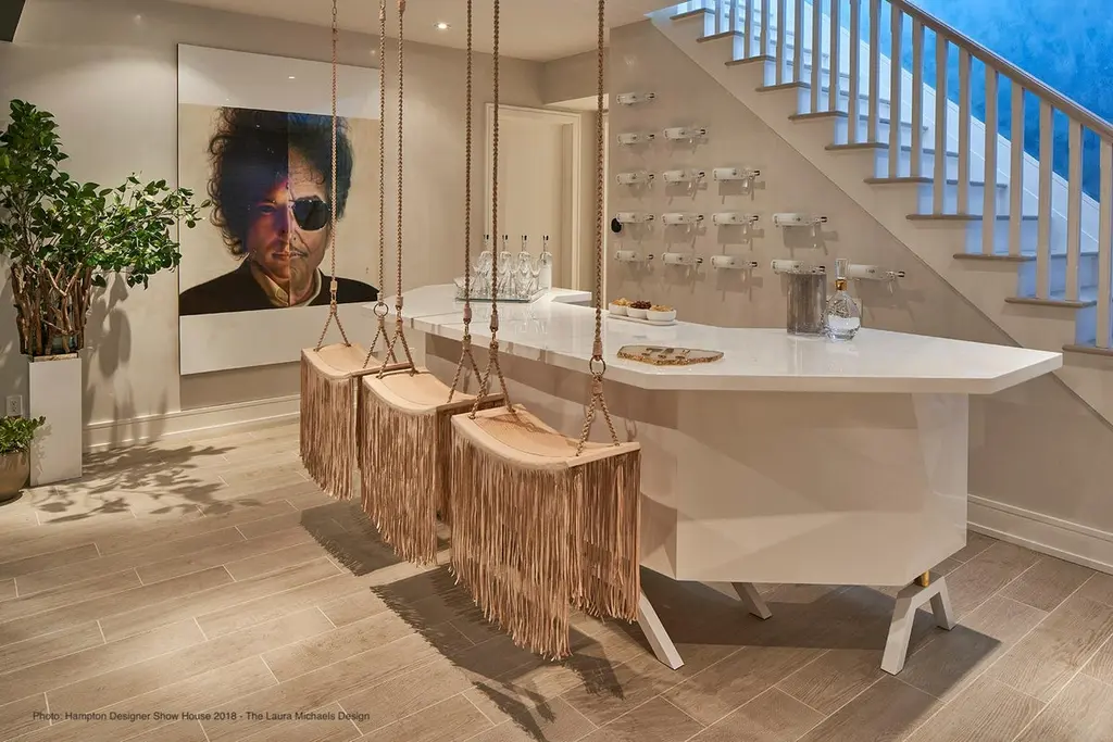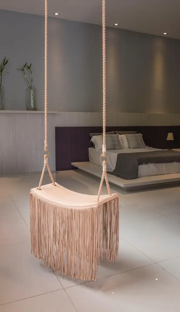 The project starts from leather threads, valuing the manual work of various craft techniques, such as braids, cords, chains and fringes.The chains were represented in three-dimensional shape with leather braids and internal steel wire. The fringes, a detail that is in vogue in fashion, and that brings a visual effect of flight in the movement of the swing, from the basic technique of the customized leather cord. The result is a sophisticated design piece, an indoor swing. Created as a unique work of art, by being hand braided.The seat is upholstered with light foam on the surface and has an elegant texture effect.All metallic finishes are gilded.Supports weight up to: 100KgAccompanies support to secure to the ceiling with 8 screws for installation.This piece was launched at the 2016 ICFF fair, then at the Hampton Designer Show House, and Design Weeks in Milan, Rome, Paris, Stockholm and São Paulo.
