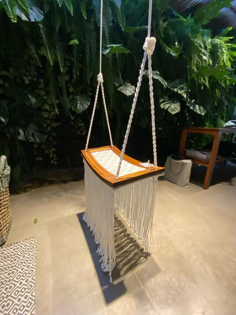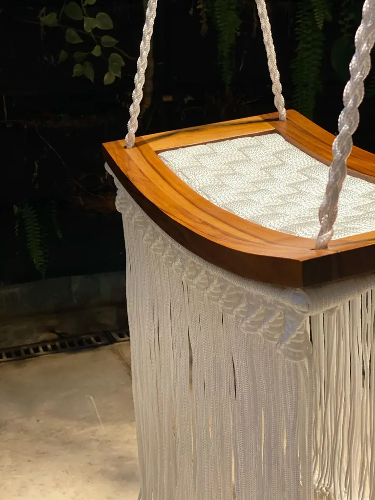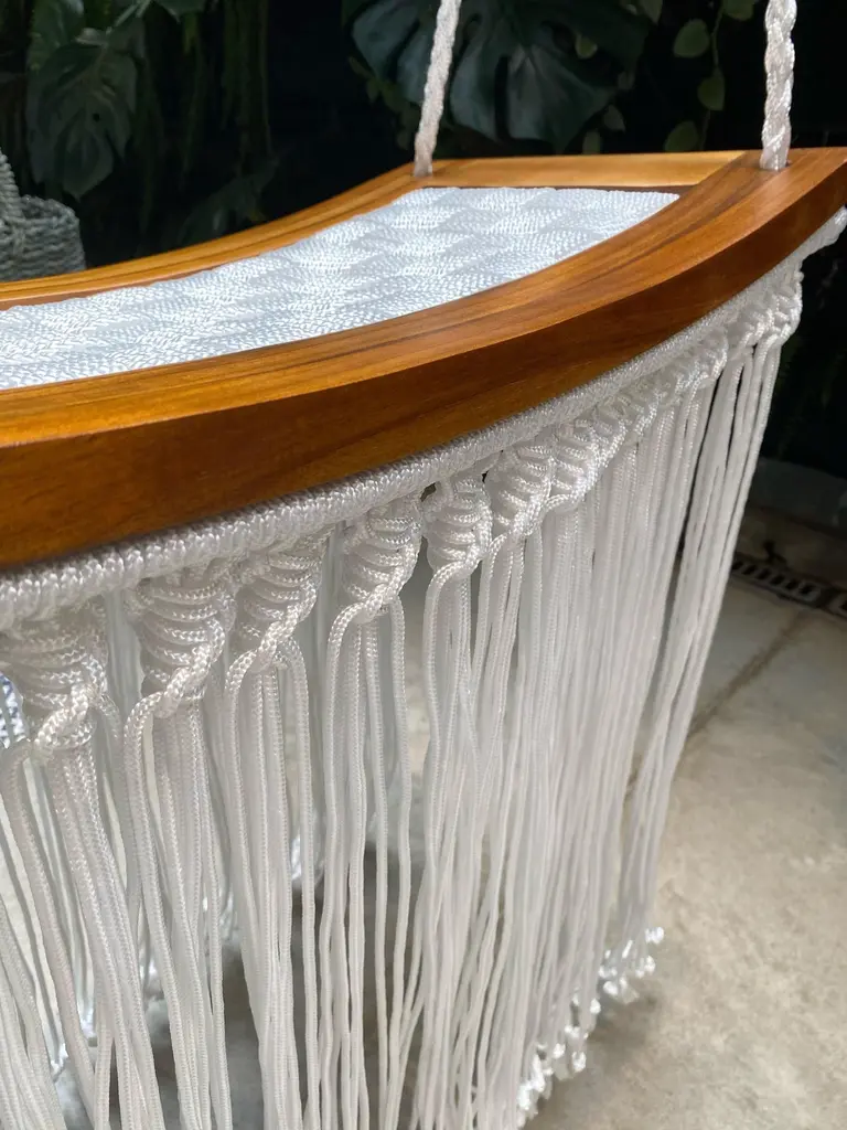The Revoar swing is made entirely by hand with nautical macrame rope. The appreciation of manual work results in a sophisticated and exclusive design piece. The chains were represented in a three-dimensional form with rope braids. (Braided in 10 mm nautical rope).Color can be customized. See all available nautical rope options.The seat was framed with natural teak wood (reforested Brazilian wood) and aluminium. It's finished with long fringes that provide a beautiful visual effect when the swing is in motion. - Swing comes with a rope for fixing to a ceiling height of up to 3 meters;- For fixing, it comes with 2 ends of 9 mm rope, 2 meters long;Can be used indoors and outdoors areas.Supports up to 120 Kg.The manual work guarantees a feeling of well-being and comfort in the decoration. See all of our available design pieces on our storefront.
