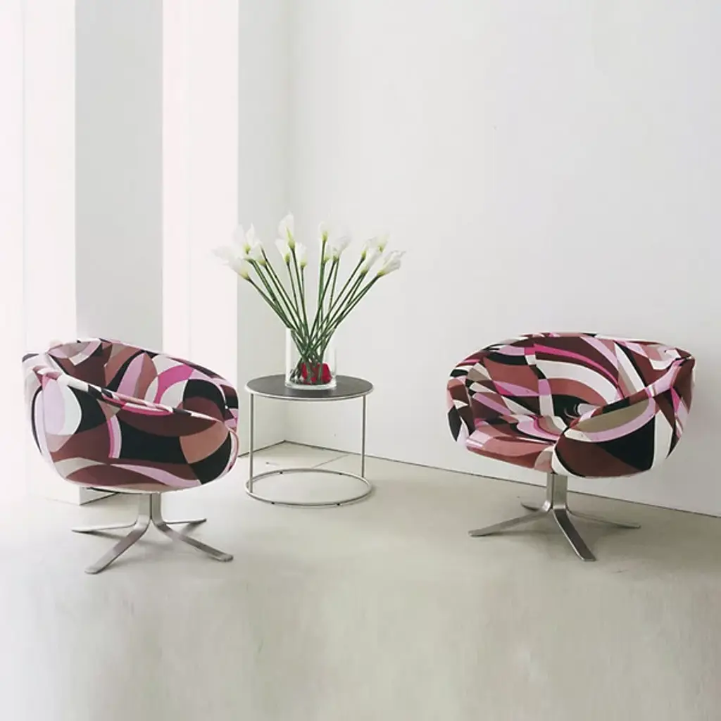 The Rive Droite Chair from Cappellini is a captivating design offering enriched by abstract surface patterns. An open, expressive creation from veteran designer Patrick Norguet, known for fusing high fashion with daring design, this is no exception, ascending from a four-legged base of satin-textured stainless steel. Each leg is a curving single strip that sweeps up to form a cohesive column, bracing a shell-style seat with a vent and wraparound arms fashioned from poplar plywood covered with soft yet supportive polyurethane, and sheathed in a dramatically patterned textile surface that captivates the eye and enhances its surroundings.