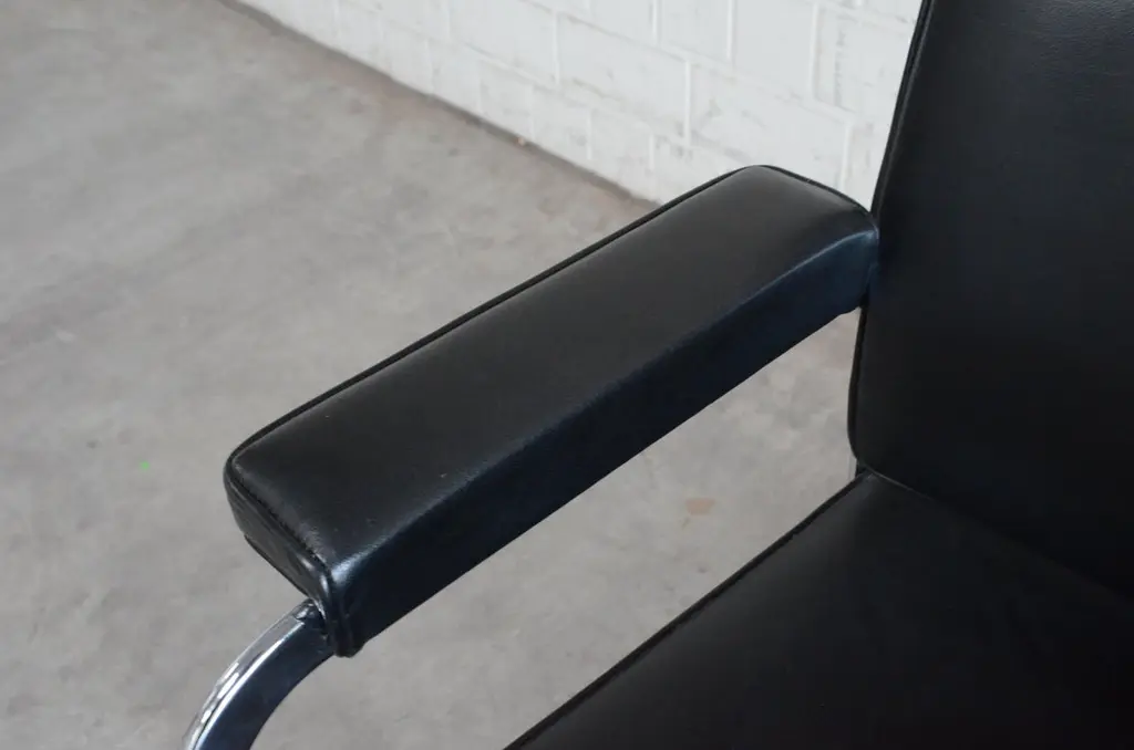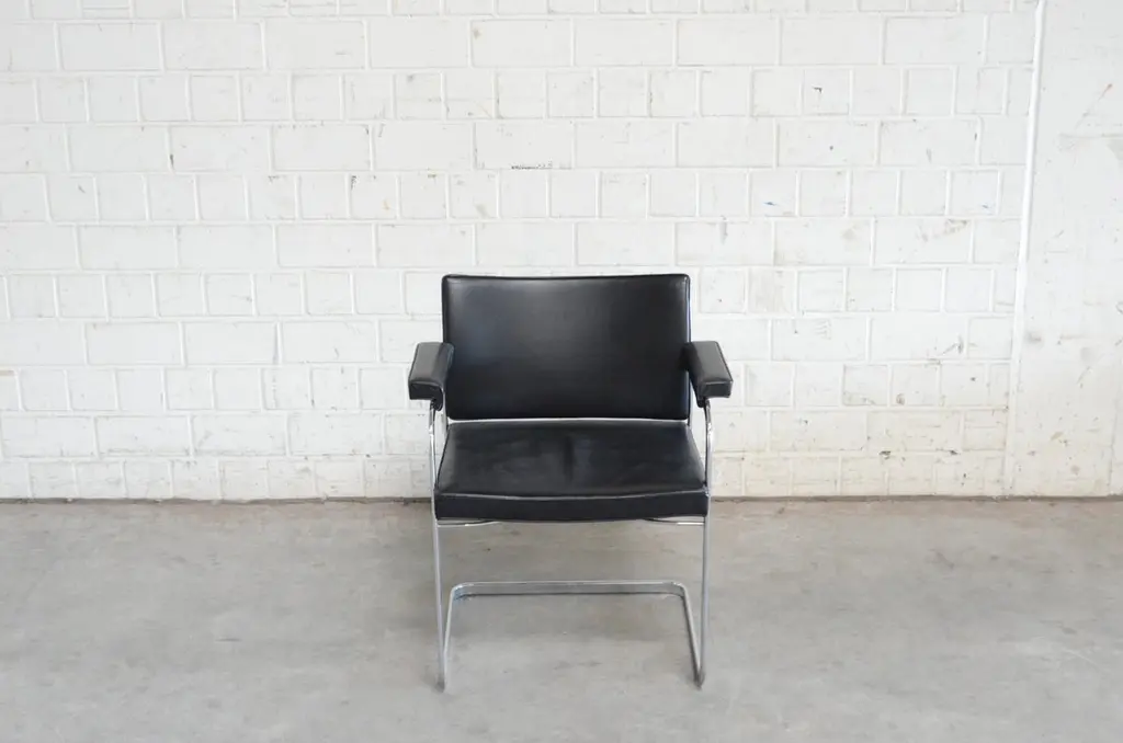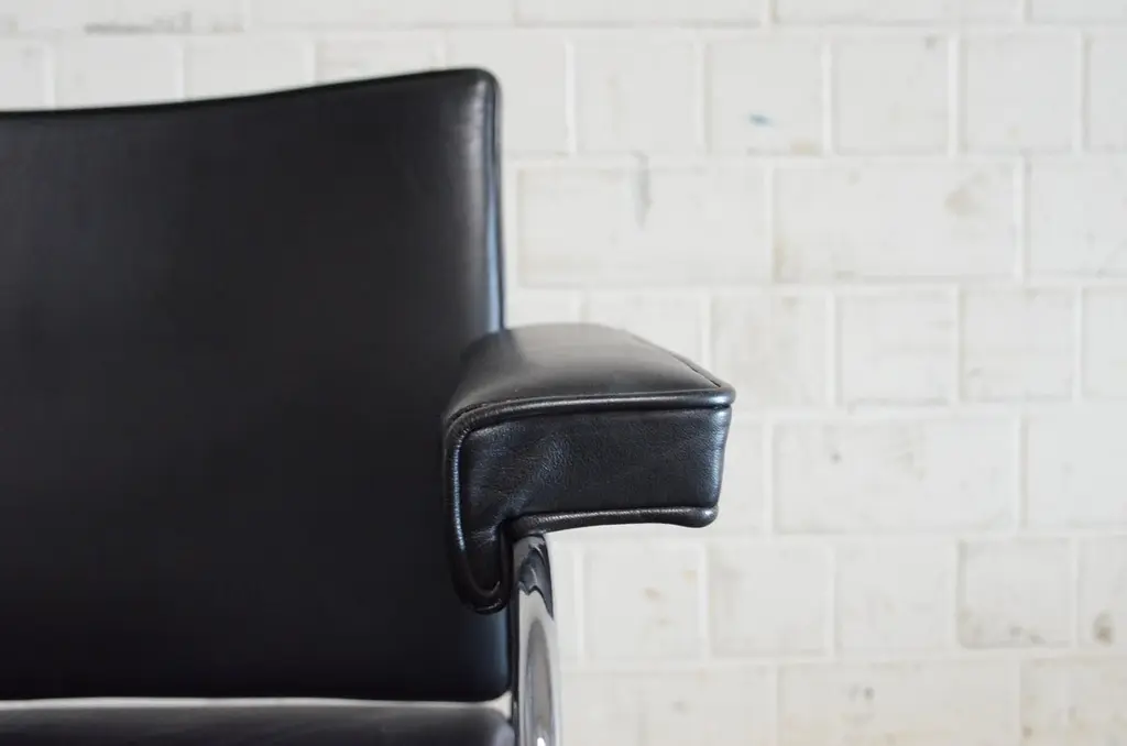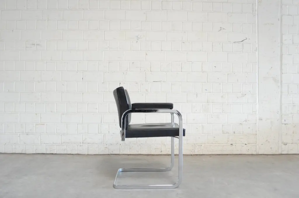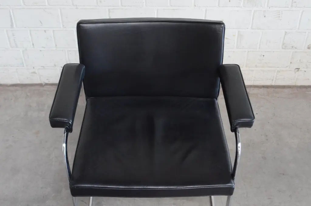 Robert Haussmann RH 305 armchair design of 1957 and manufactured by De Sede.Black semianiline leather and a chrome steel frame.This is a classic Swiss design chair.Great condition.Price for 1 chairWe have 2 chairs in store.