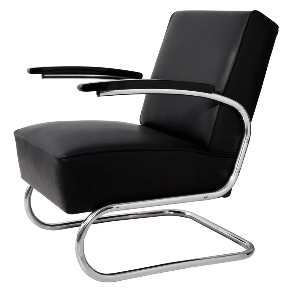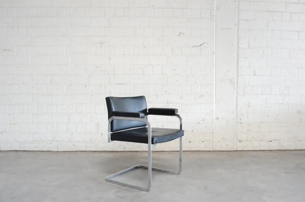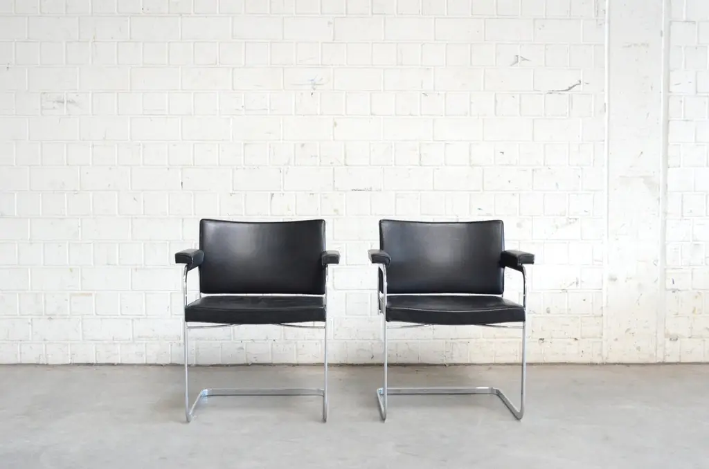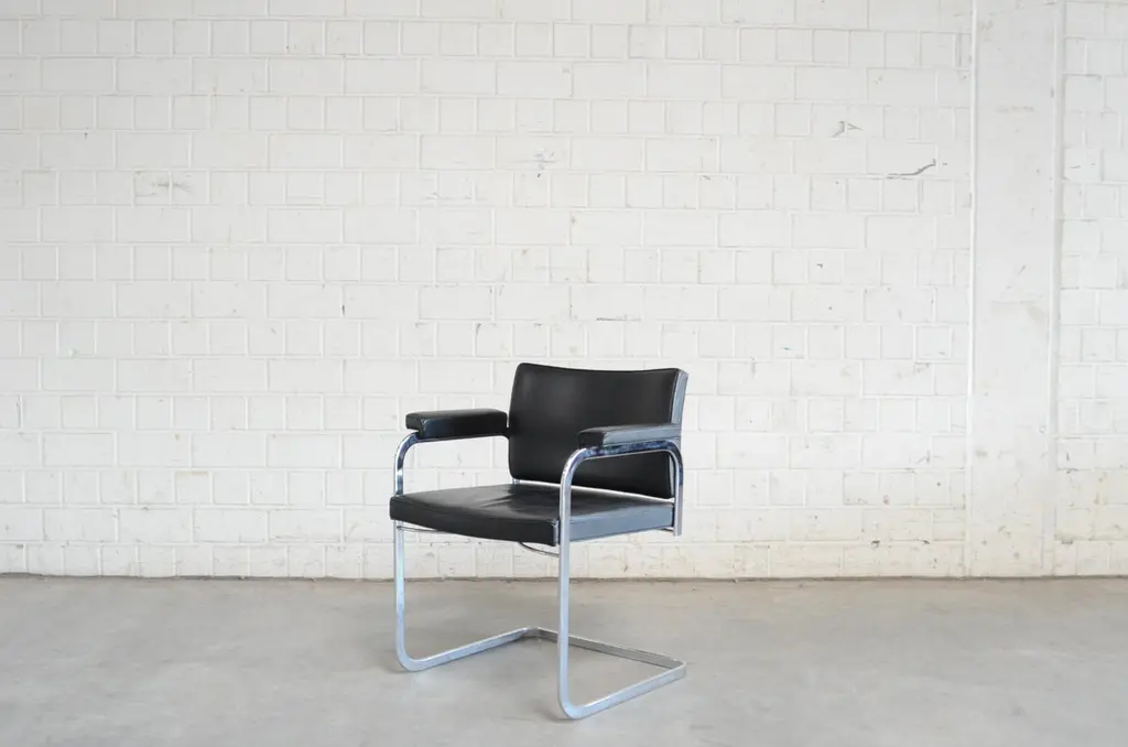 Robert Haussmann RH 305 armchair design of 1957 and manufactured by De Sede.Black semianiline leather and a chrome steel frame.This is a classic Swiss design chair.Great condition.Price for 1 chairWe have 2 chairs in store.