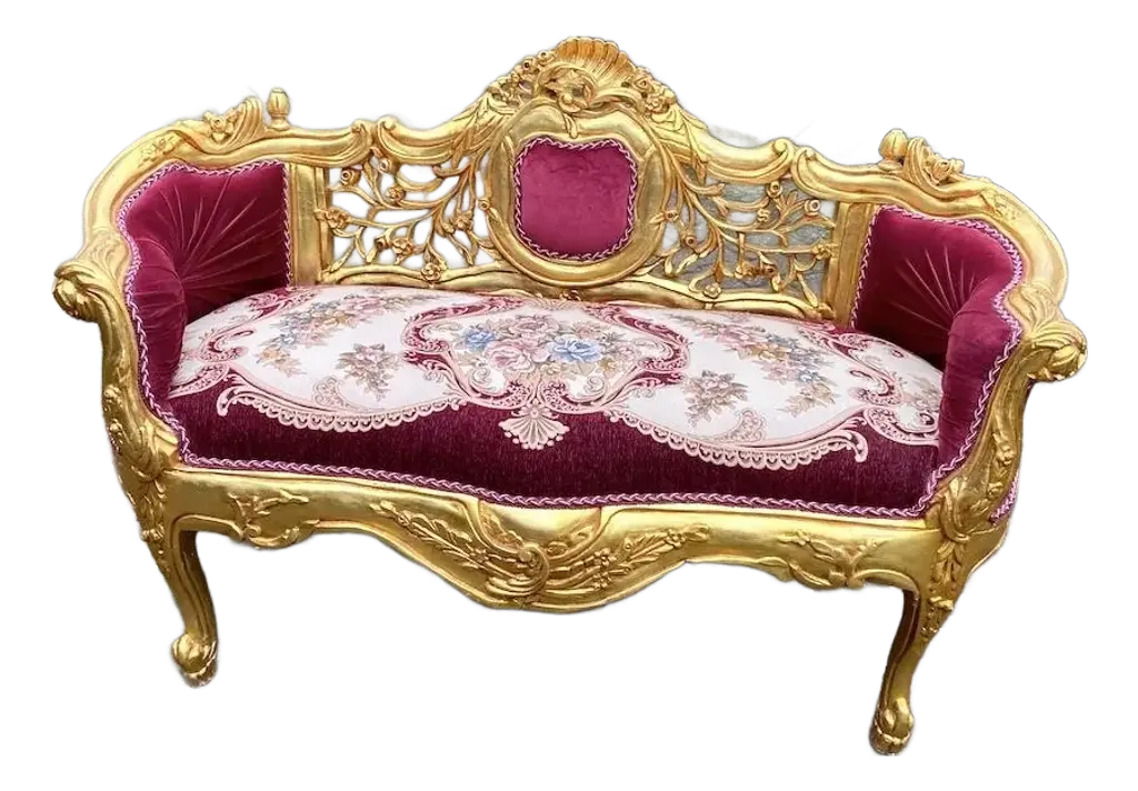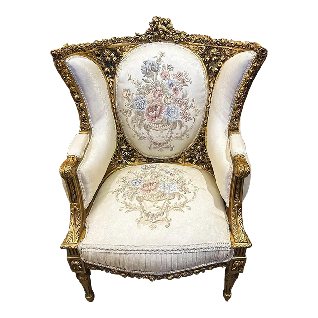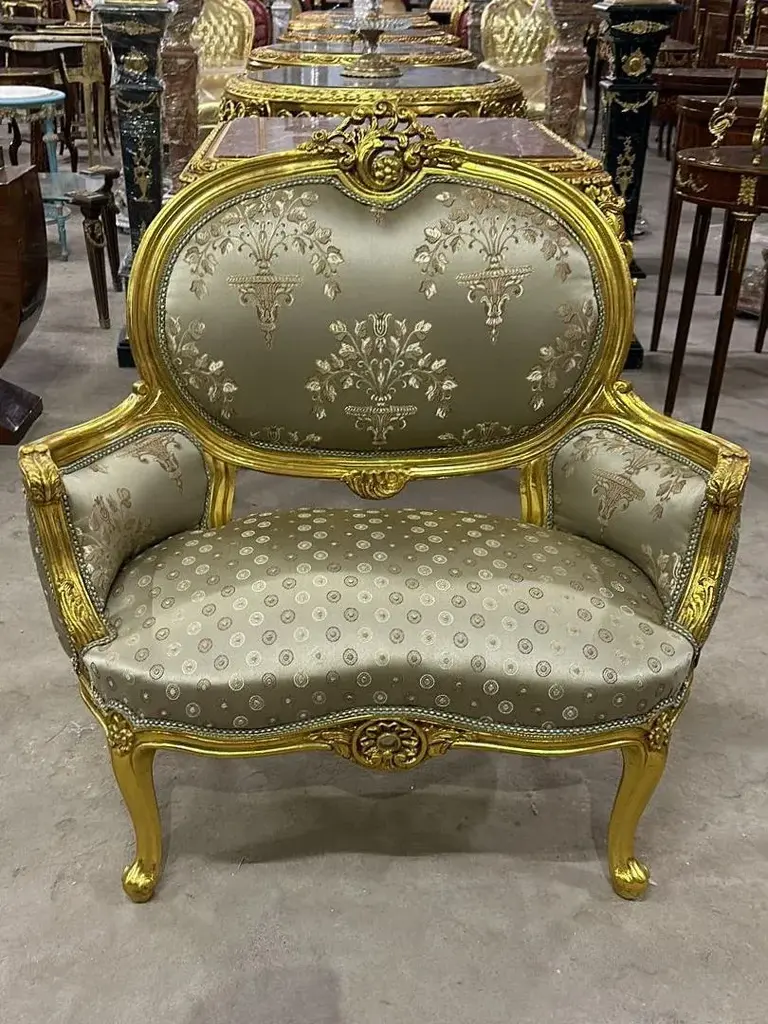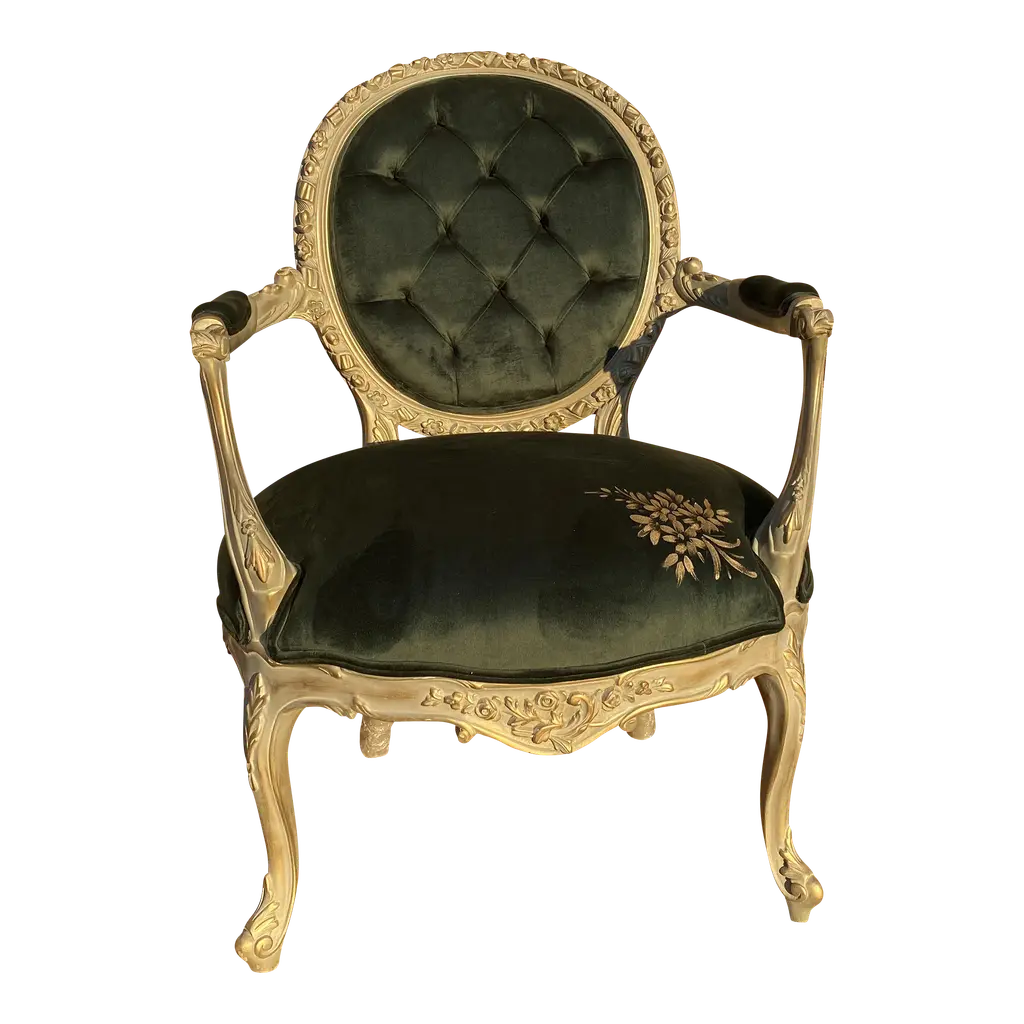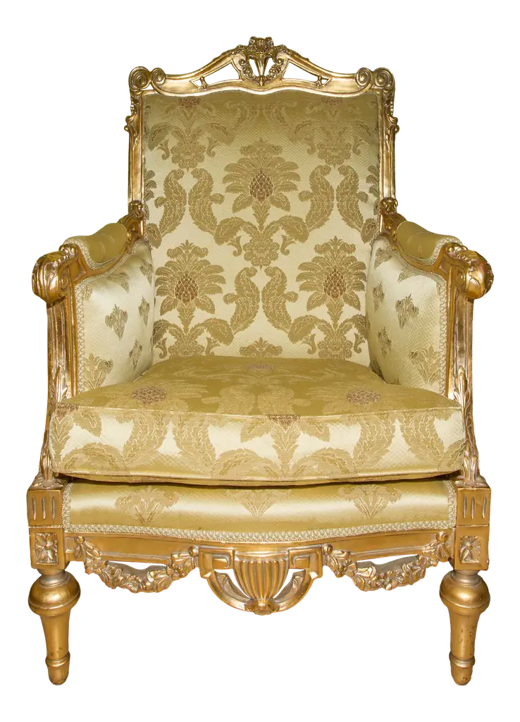 In love with these chairs. Fully refinished in gold leaf and reupholstered using a high end designer green damask fabric. These beautiful chair is in stock. Feel like royalty with this large French Rococo style chair. Most of our curated items have arrived to Miami, FL and are ready to ship. However, some items like this one are in route from overseas an extra 8-12 weeks for delivery.