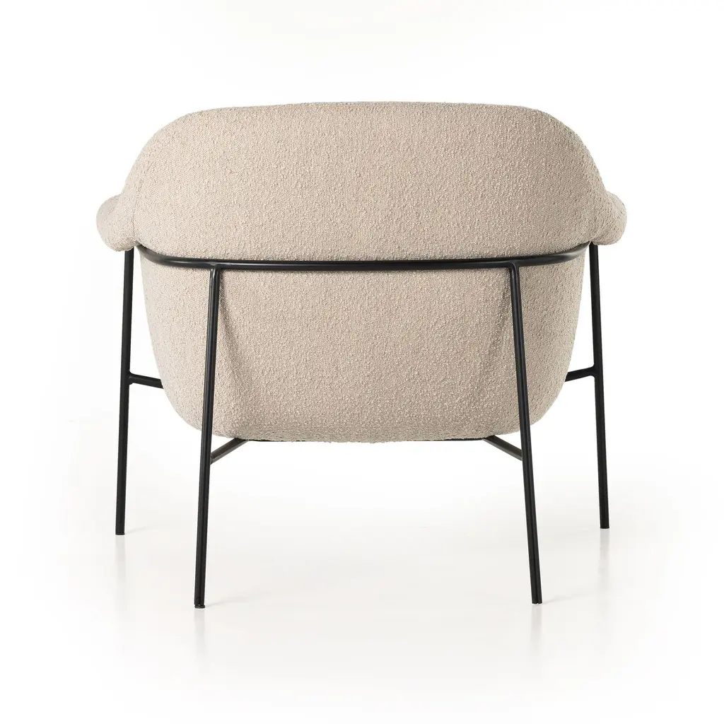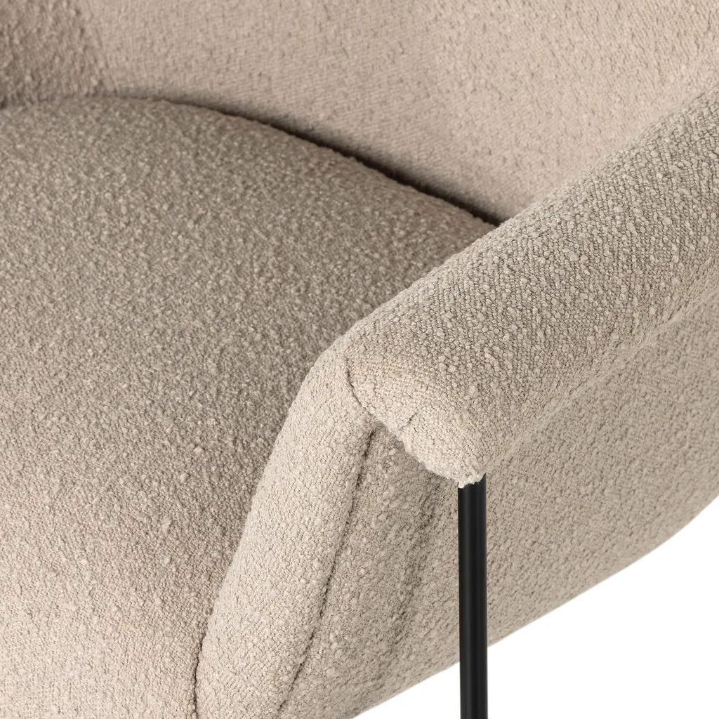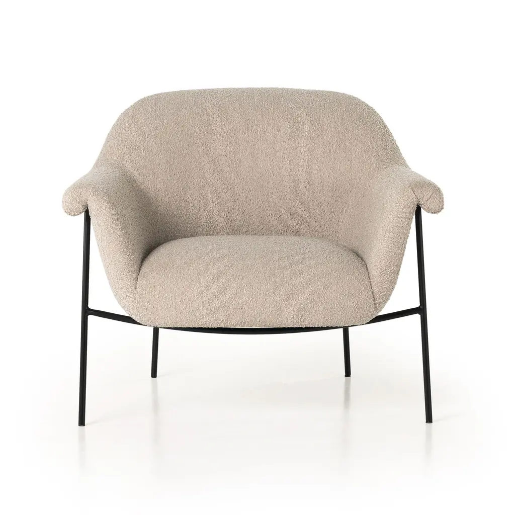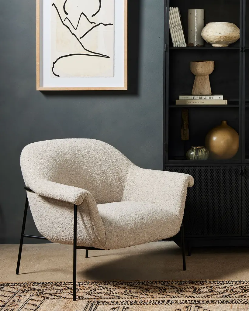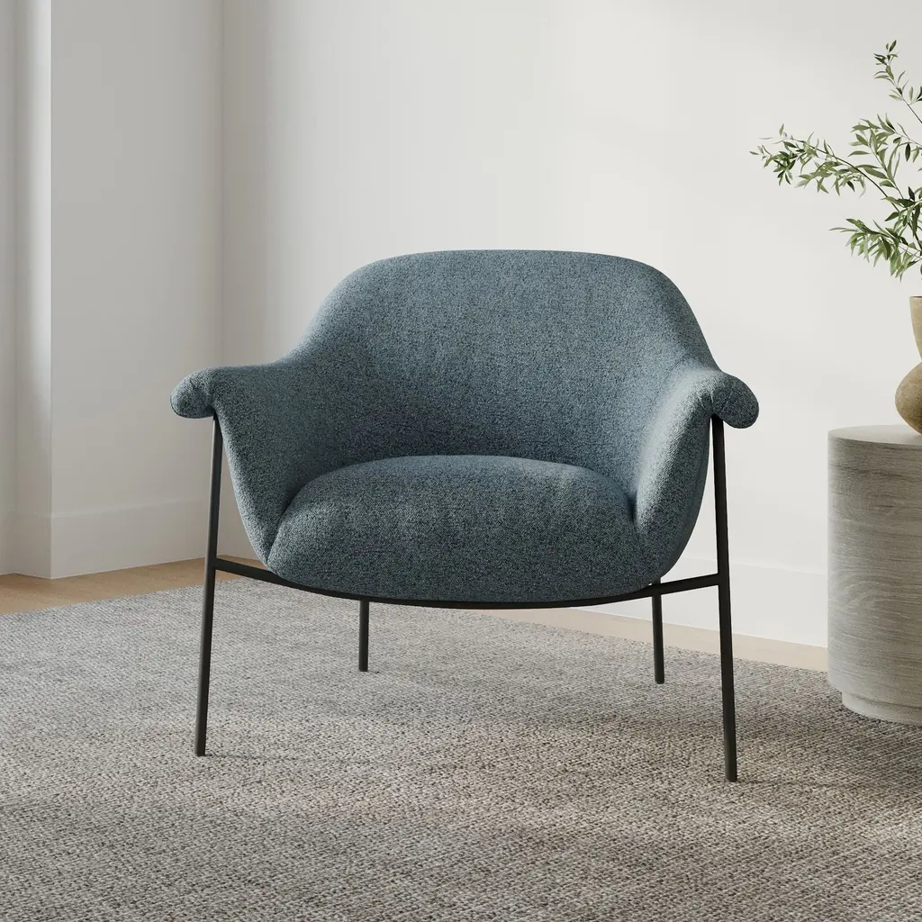 Rounded arms flow gracefully into the frame. Lofted iron legs for a light and airy feel. Mixed materials add double the dimension. Kiln-dried frame makes it extra durable.