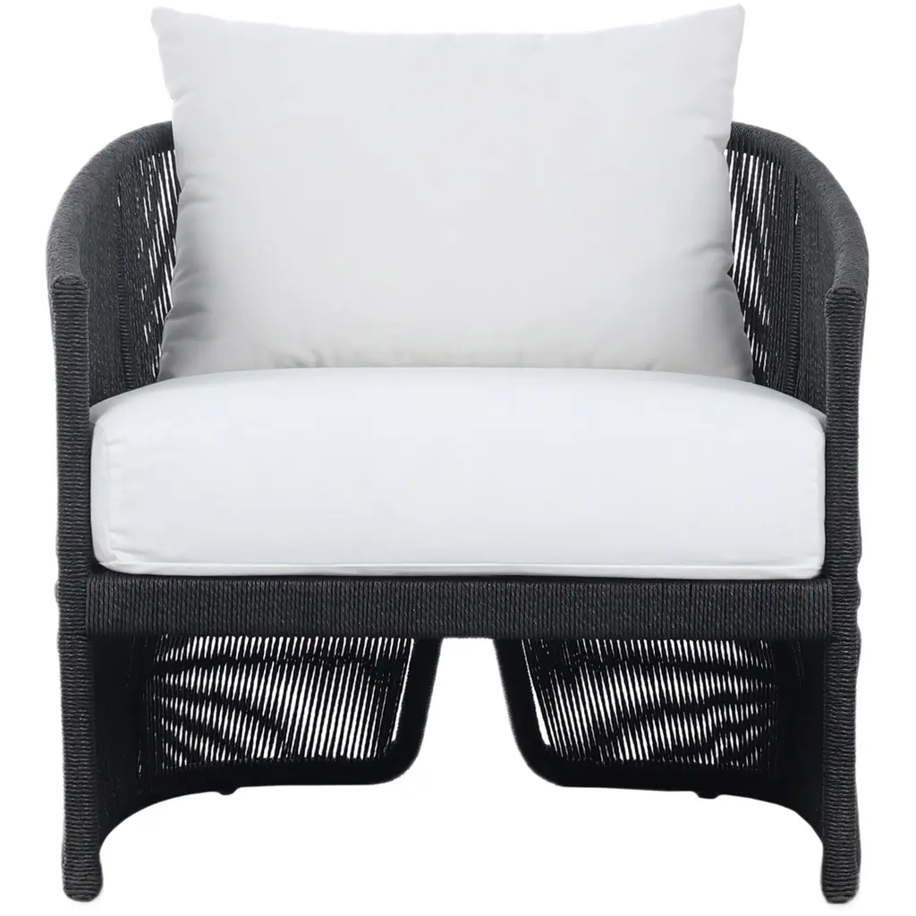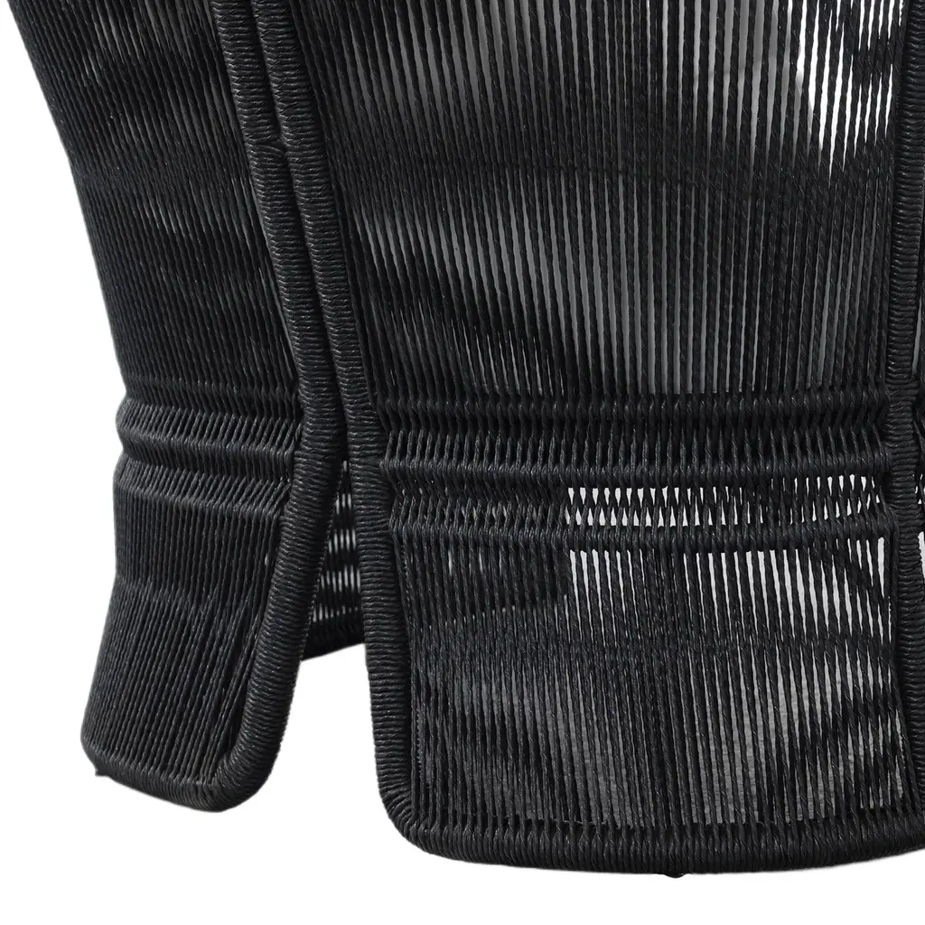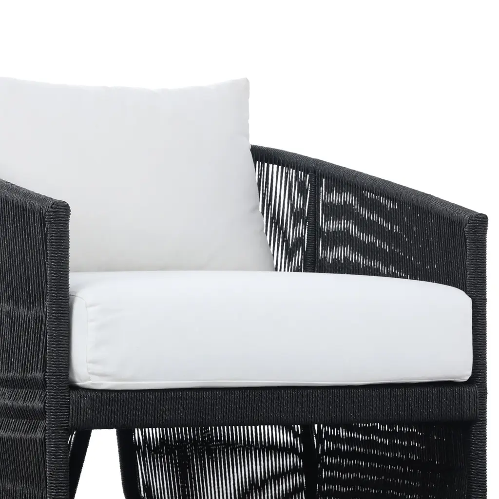 The Rosehaven Outdoor Chair is a stunning spot for outdoor lounging. Its linear rope-based design is beautifully woven and paired with clean curves, creating an elegant aesthetic. The chair features an angular cutout detail on the back, ensuring it looks stunning from all angles. The back and seat cushions are UV-resistant, water-repellent, and quick-drying, making it perfect for outdoor use. For longevity, cover or store indoors during inclement weather and when not in use.