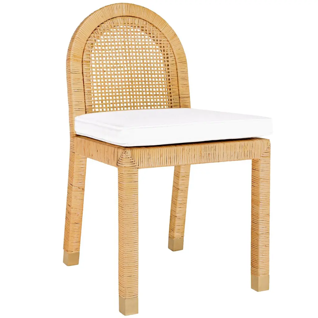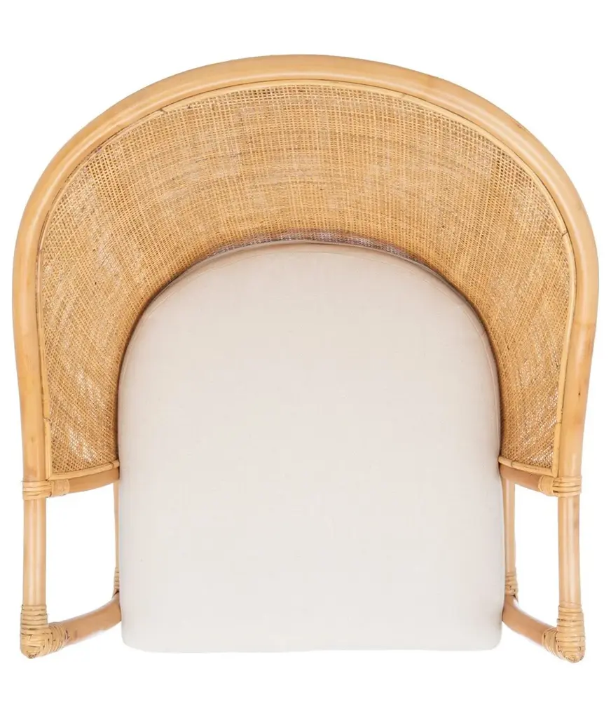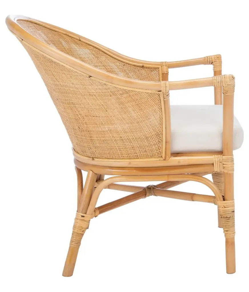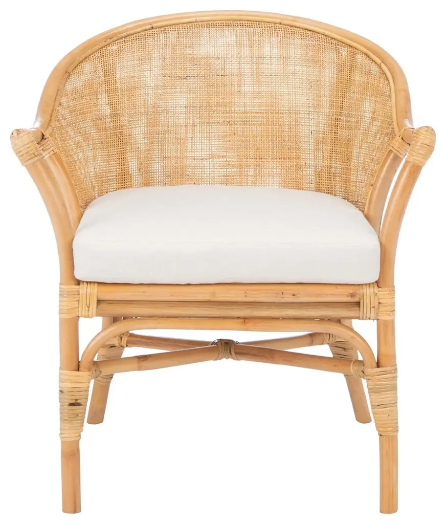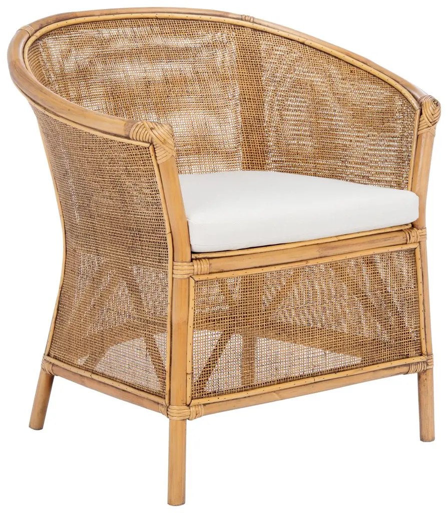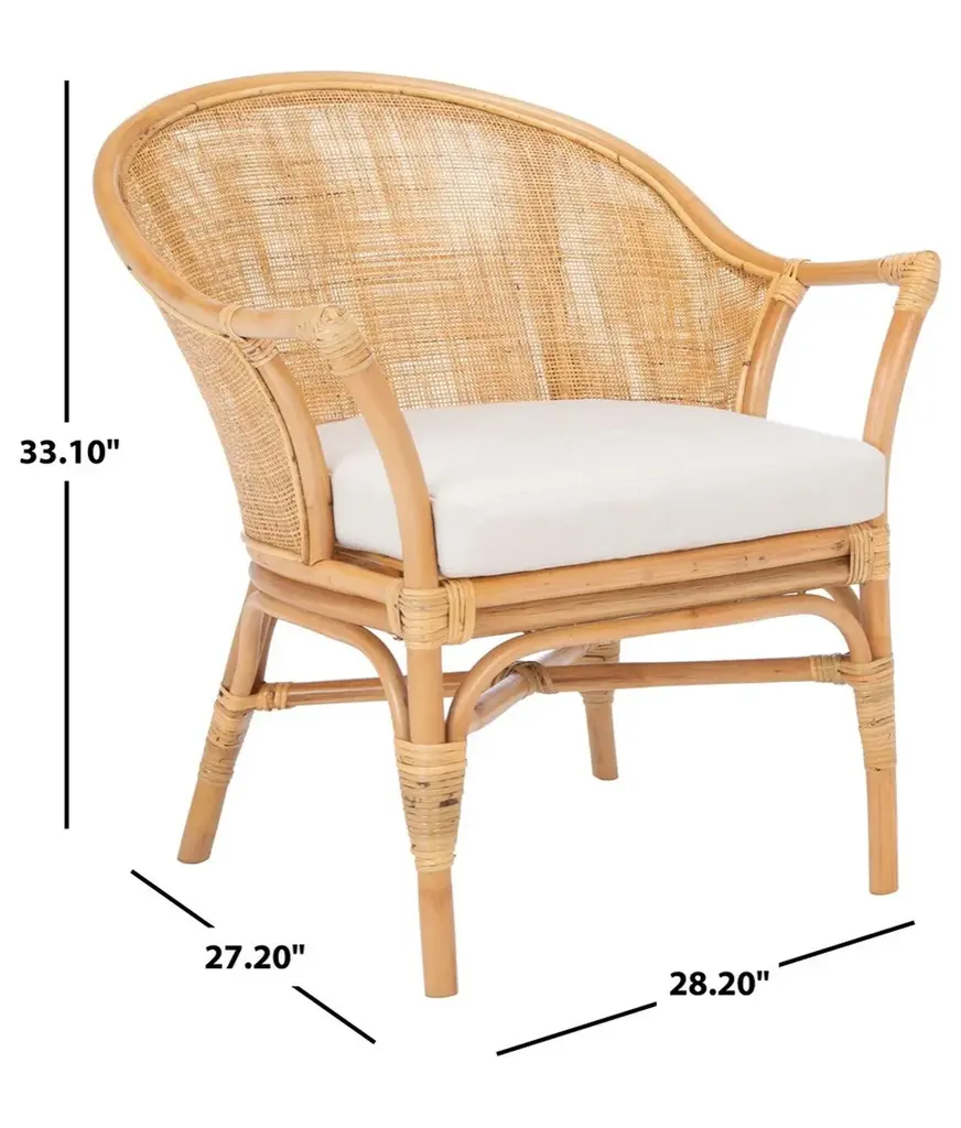 Transform your living space into a tropical island paradise with this Dustin Accent Chair. Designed after iconic seaside resort decor, Dustin awakens any room's aesthetic with its flowing silhouette, natural rattan, sculpted bamboo style legs, and plush white cushion, ensuring long lasting relaxation.Frame: Rattan / LinenSeat Dimensions: 18.9" x 19.69" x 17.72" (W x D x H)Arm Rest Height: 27.95"Leg Height: 13.39"Weight Capacity: 275 lbs