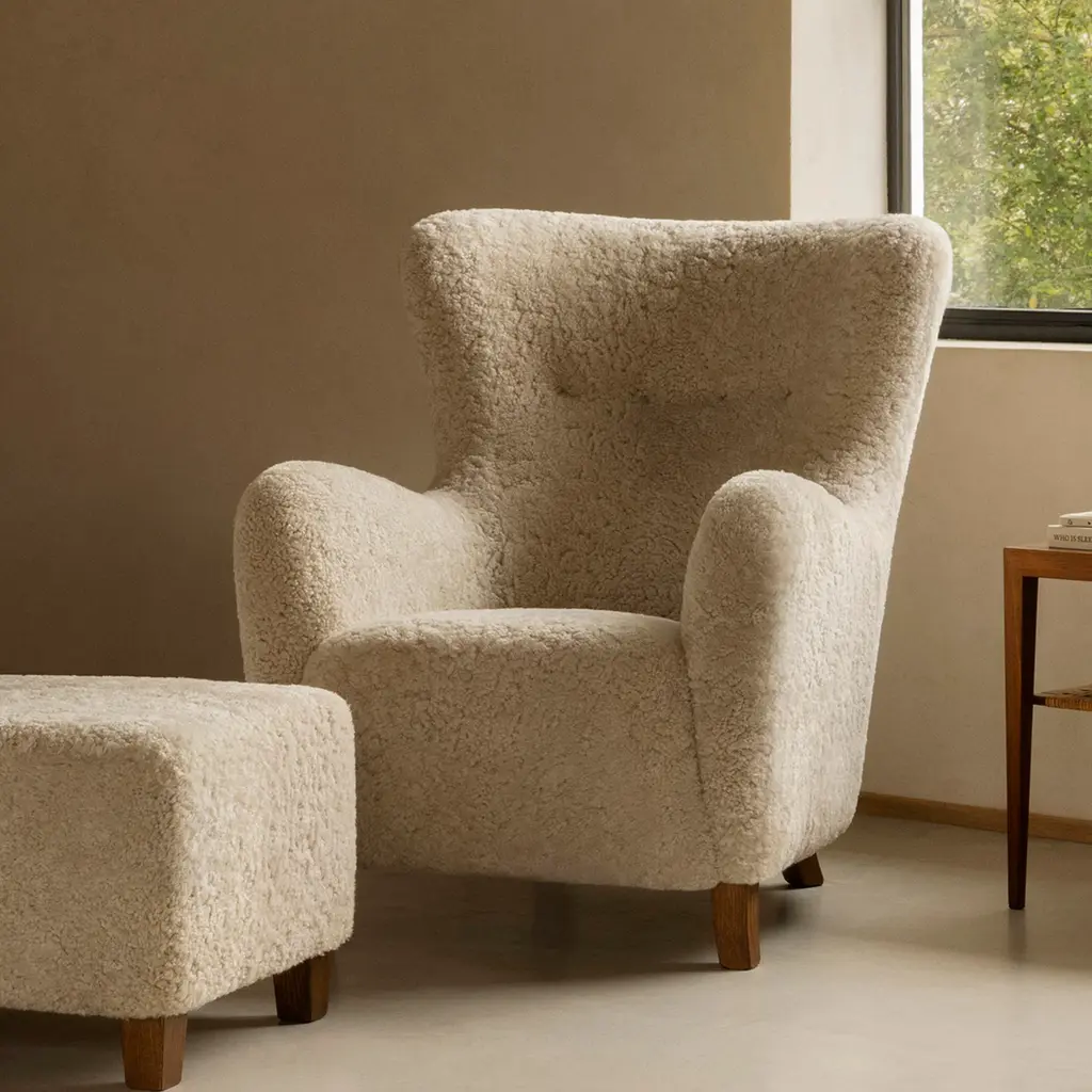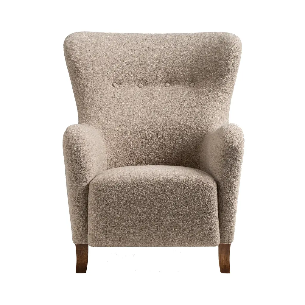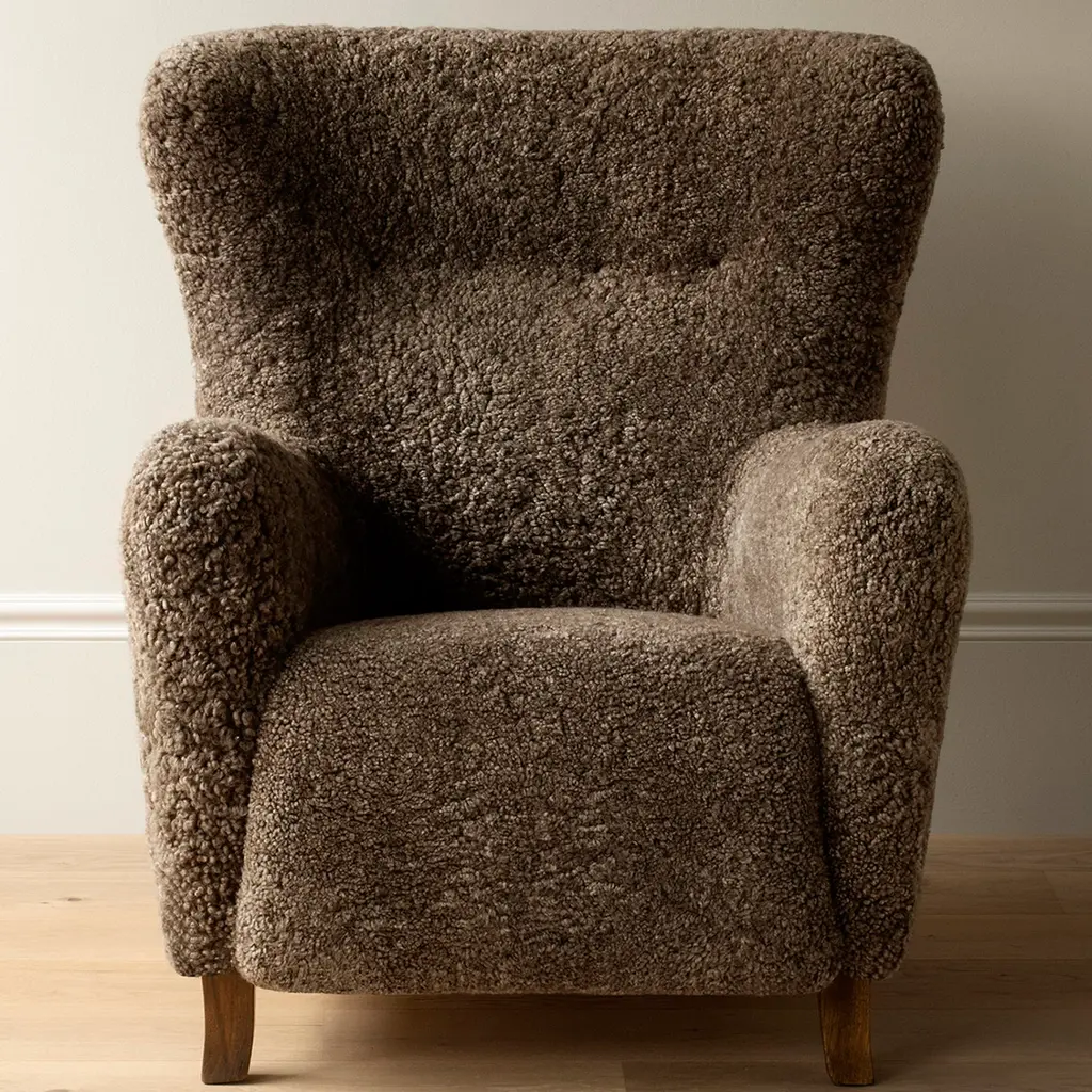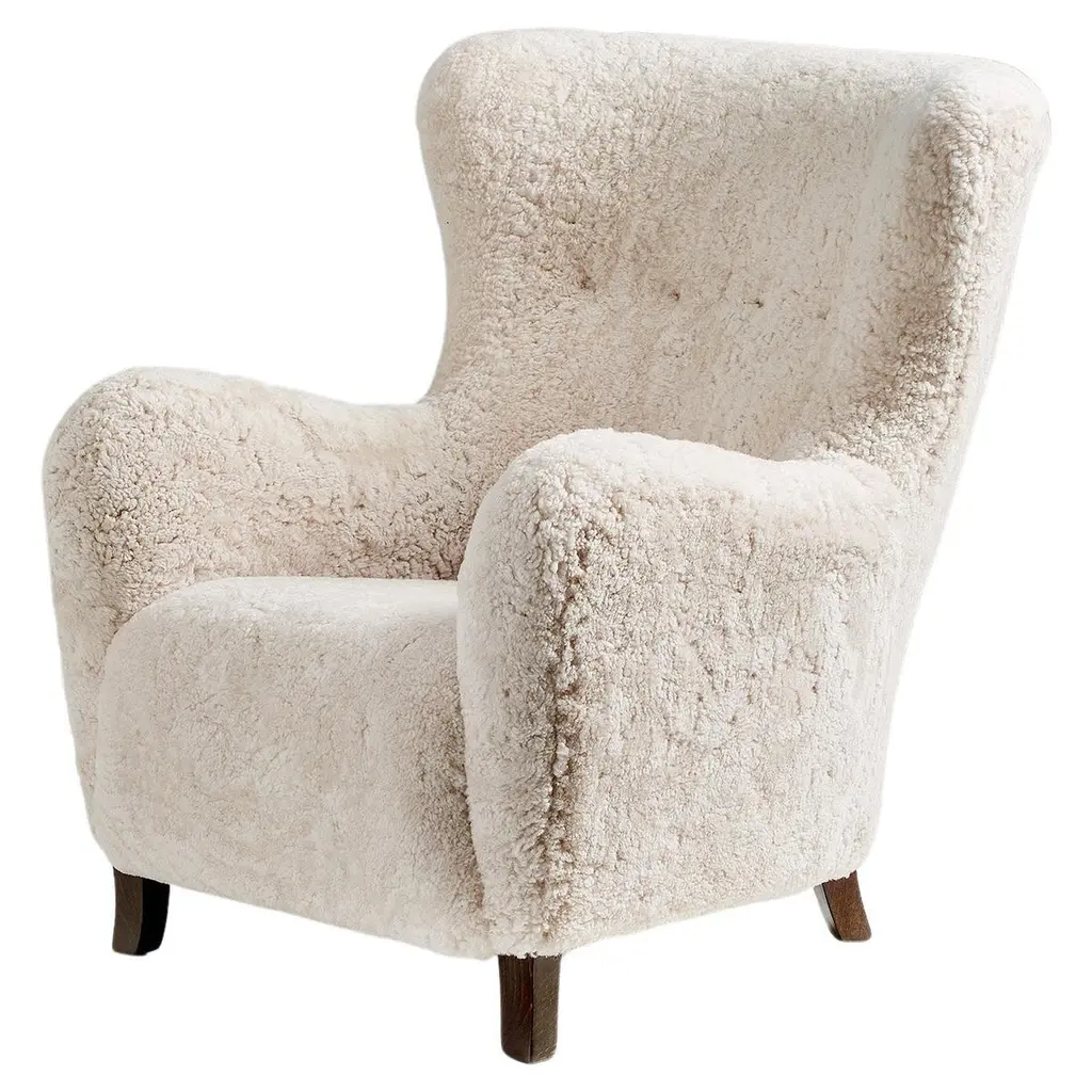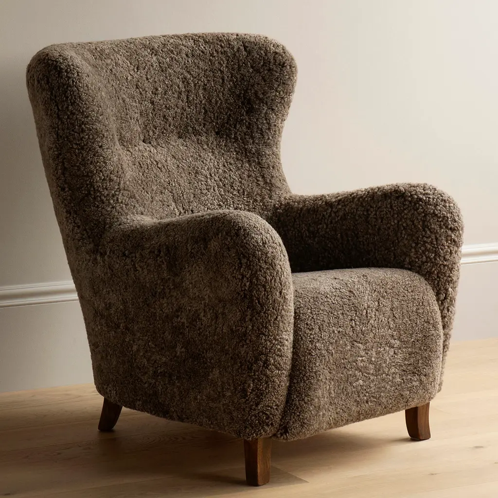 The Sampo Chair reimagines a 1940s design by Christian Sorensen. Known for its flowing, organic silhouette, the chair embodies the early Danish Modern style while offering contemporary comfort. Upholstered in luxurious materials such as genuine sheepskin or plush fabrics, the chair features a solid beech wood frame and a fully sprung seat for lasting durability. Dagmar's workshop offers customization with various fabric options and leg finishes in oak or walnut, providing versatility to suit different interiors
