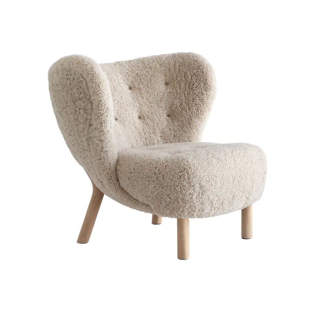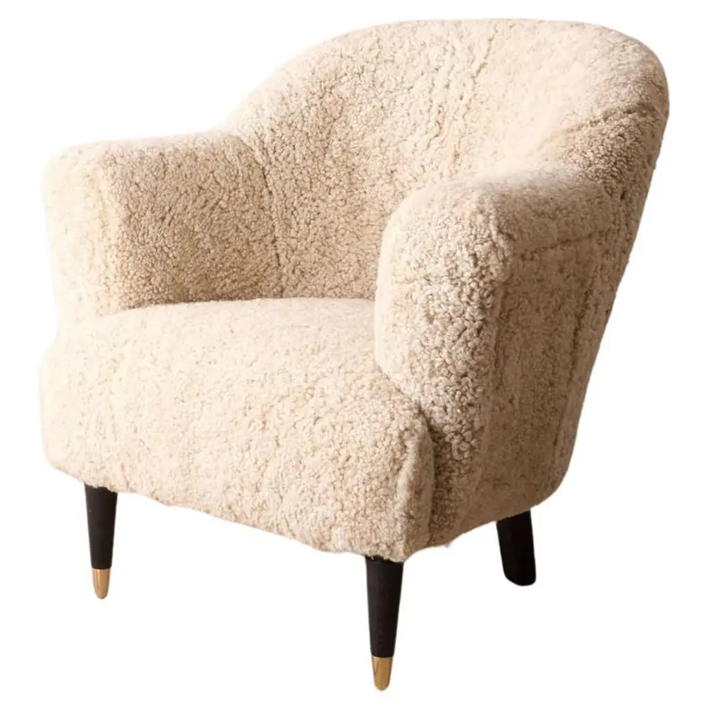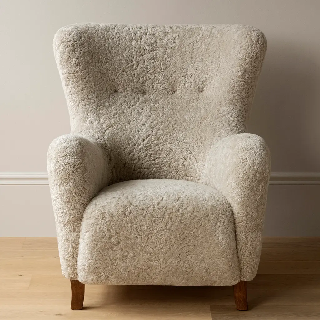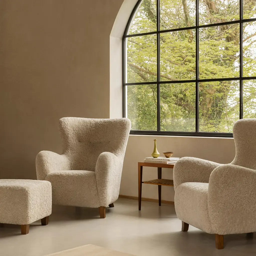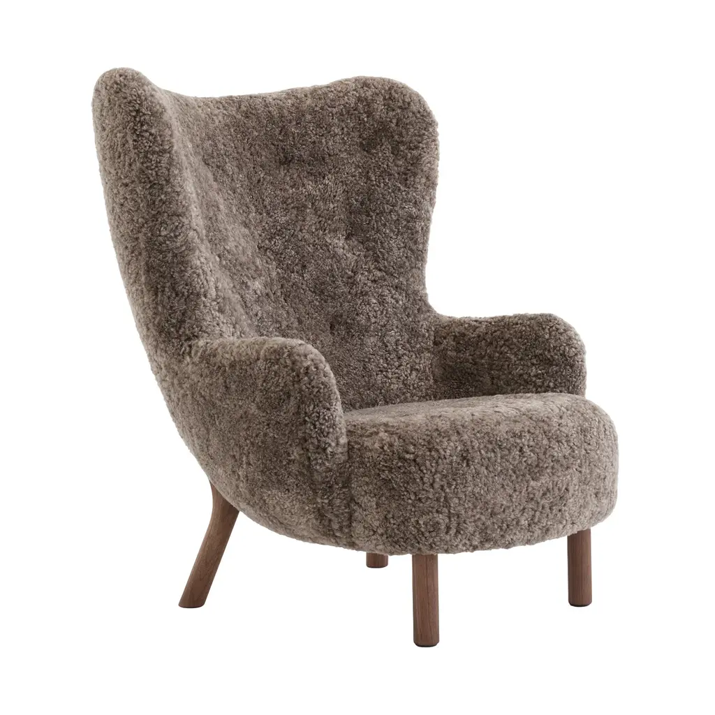 The Sampo Chair reimagines a 1940s design by Christian Sorensen. Known for its flowing, organic silhouette, the chair embodies the early Danish Modern style while offering contemporary comfort. Upholstered in luxurious materials such as genuine sheepskin or plush fabrics, the chair features a solid beech wood frame and a fully sprung seat for lasting durability. Dagmar's workshop offers customization with various fabric options and leg finishes in oak or walnut, providing versatility to suit different interiors