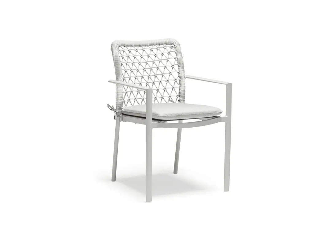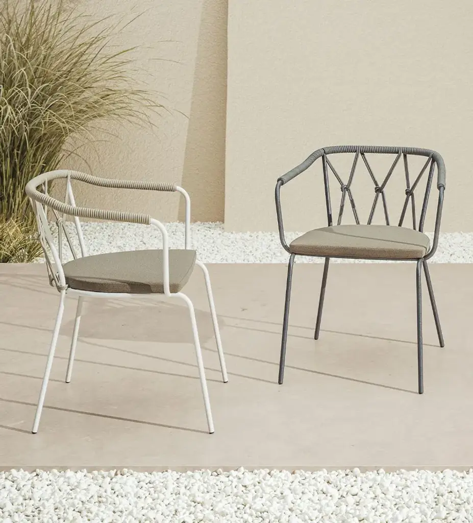 The Outdoor Scala collection is designed to offer a total living in continuity with nature and it is characterised by sinuous lines that follow the natural progression of the environments that hosts them.Inspired by the traditional chairs with metal and rope frame, Marco Piva has designed an elegant and light seat, a suspended architecture of great modernity.