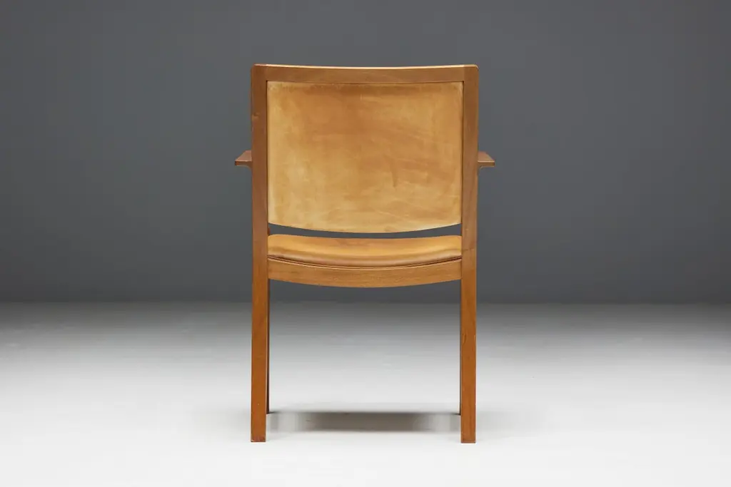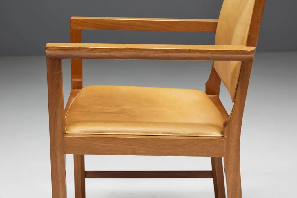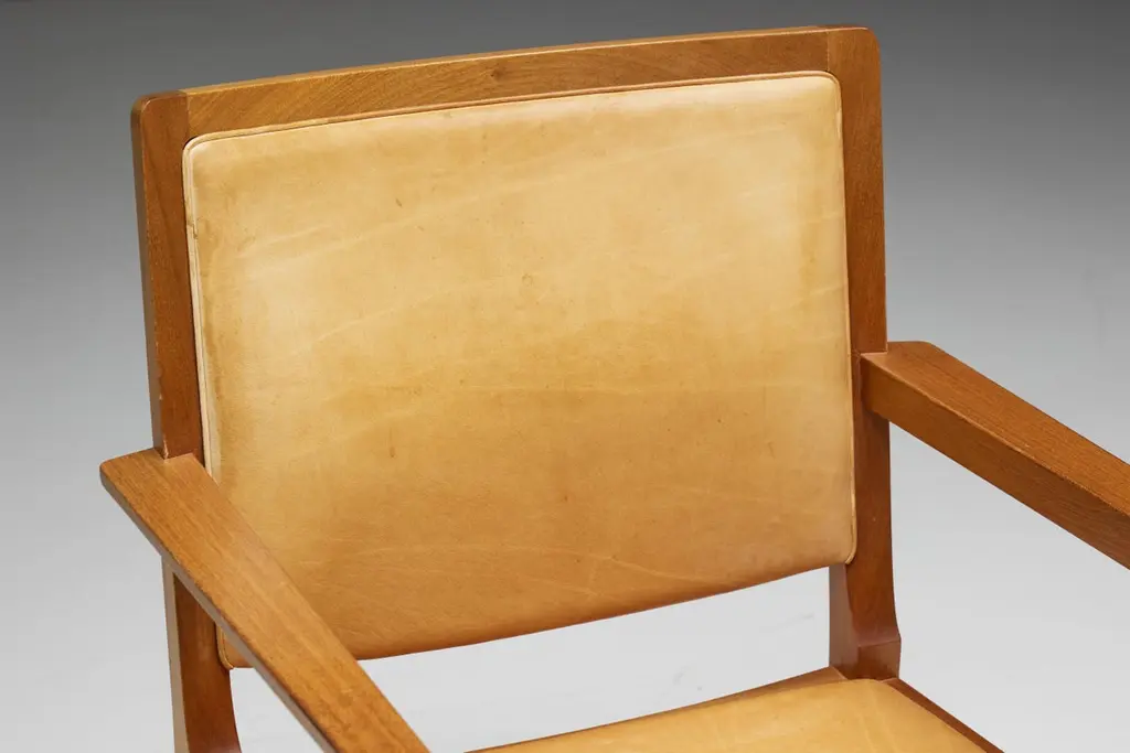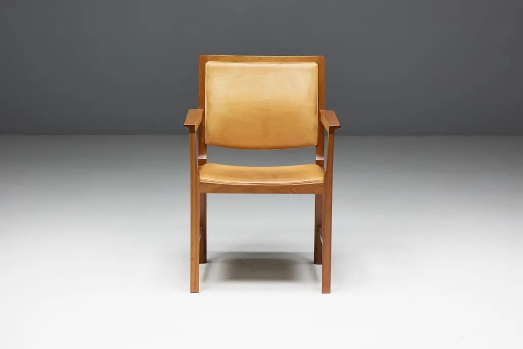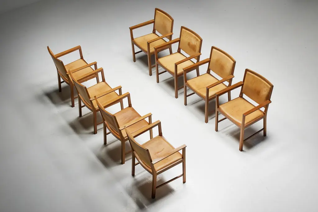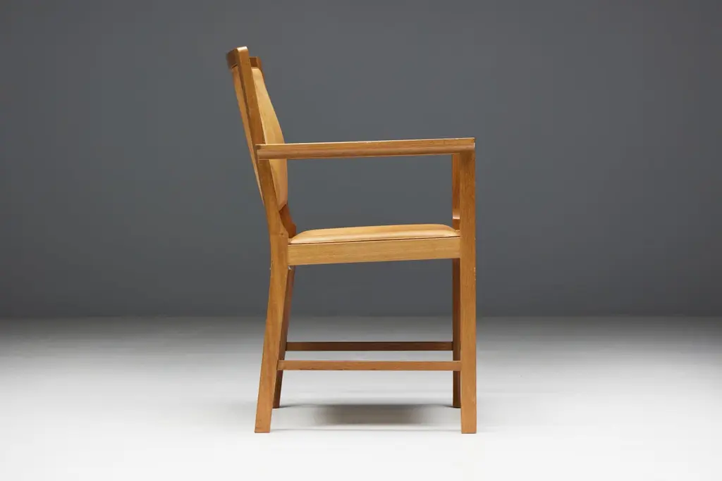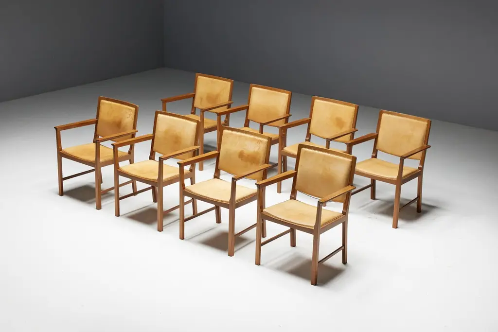 Scandinavian conference chairs crafted from a harmonious blend of natural leather and wood. Each chair features luxurious patinated natural leather upholstery and a sleek wooden frame. With nine pieces available and priced per piece, these chairs offer both timeless elegance and superior comfort.