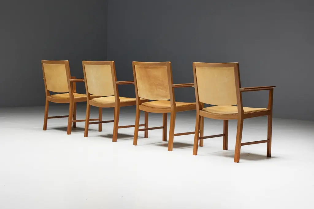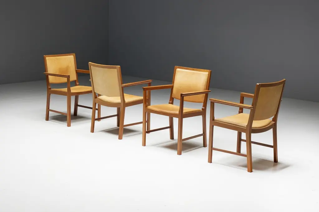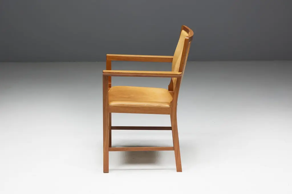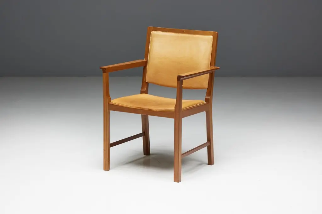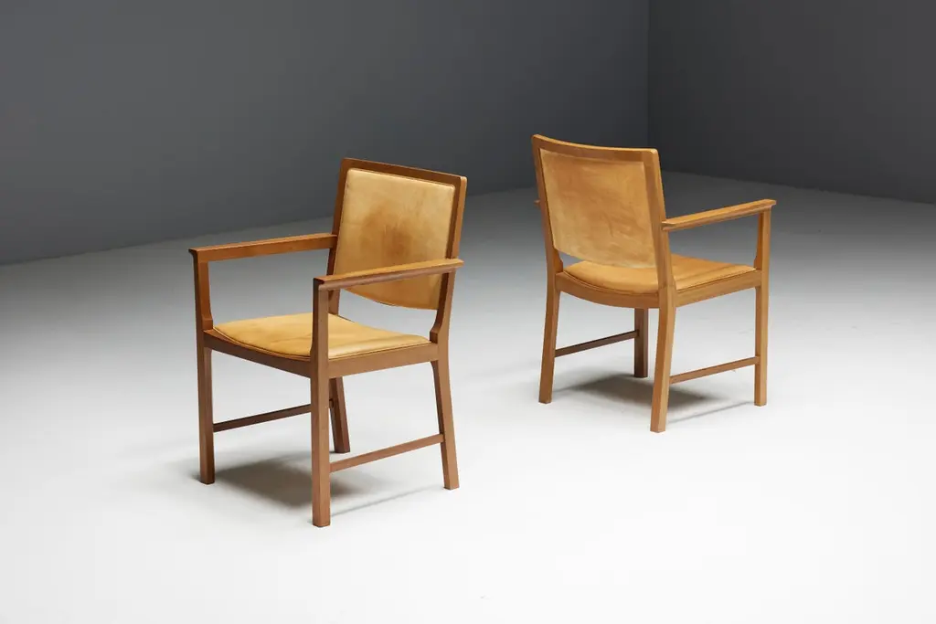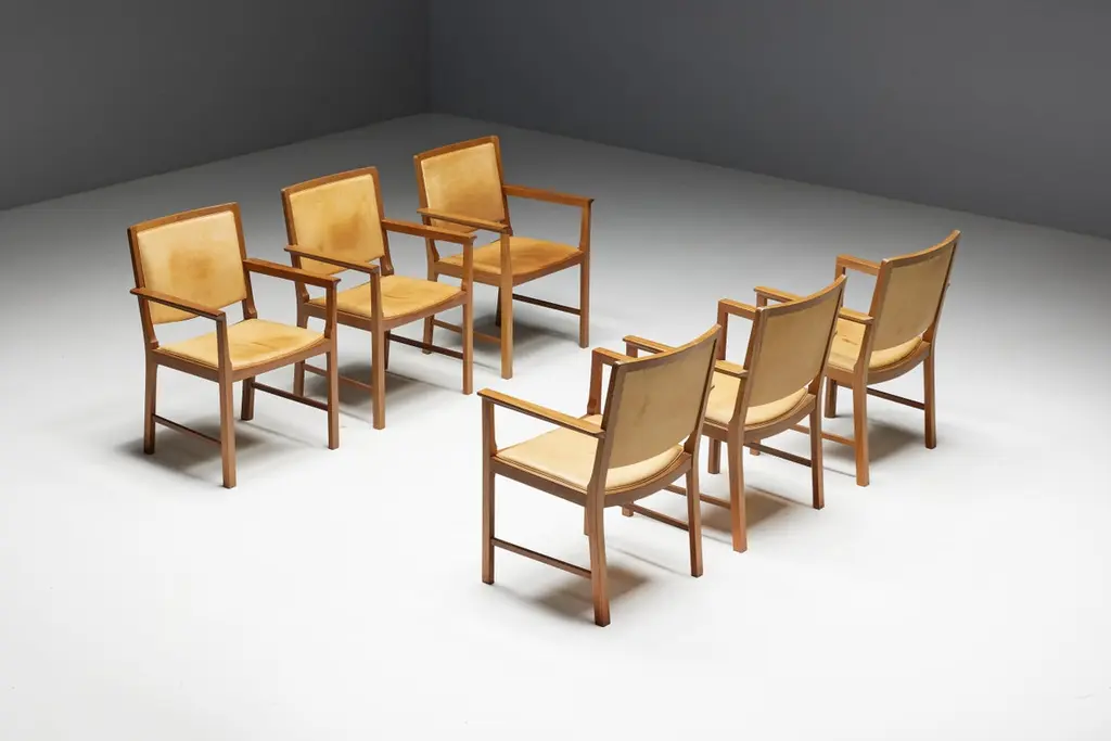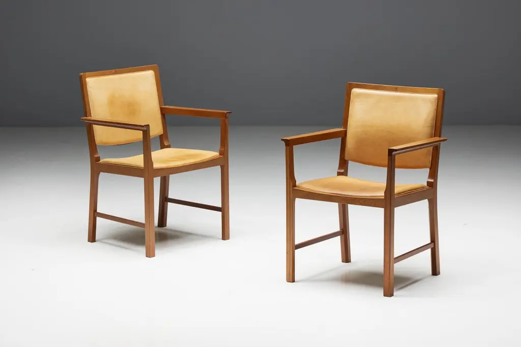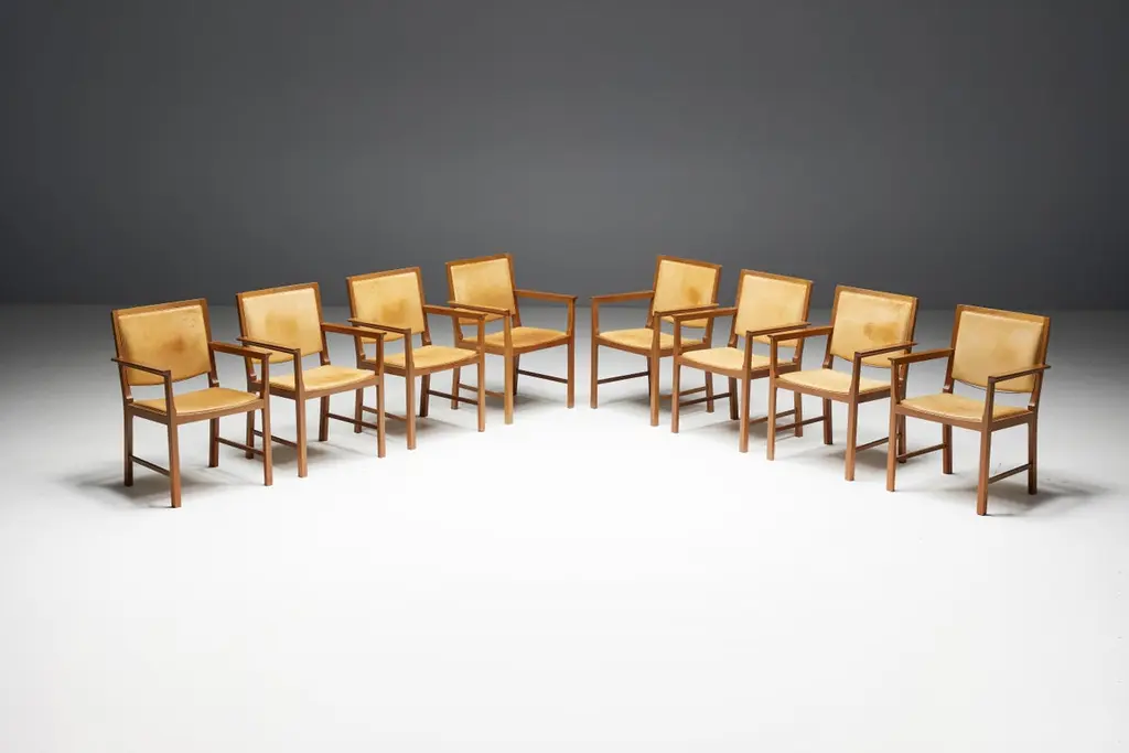 Scandinavian conference chairs crafted from a harmonious blend of natural leather and wood. Each chair features luxurious patinated natural leather upholstery and a sleek wooden frame. With nine pieces available and priced per piece, these chairs offer both timeless elegance and superior comfort.