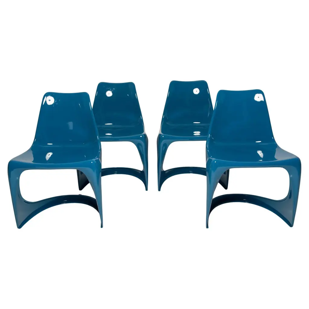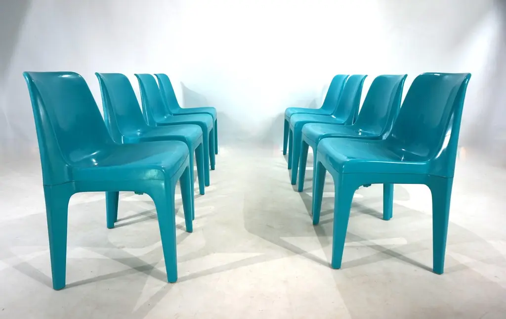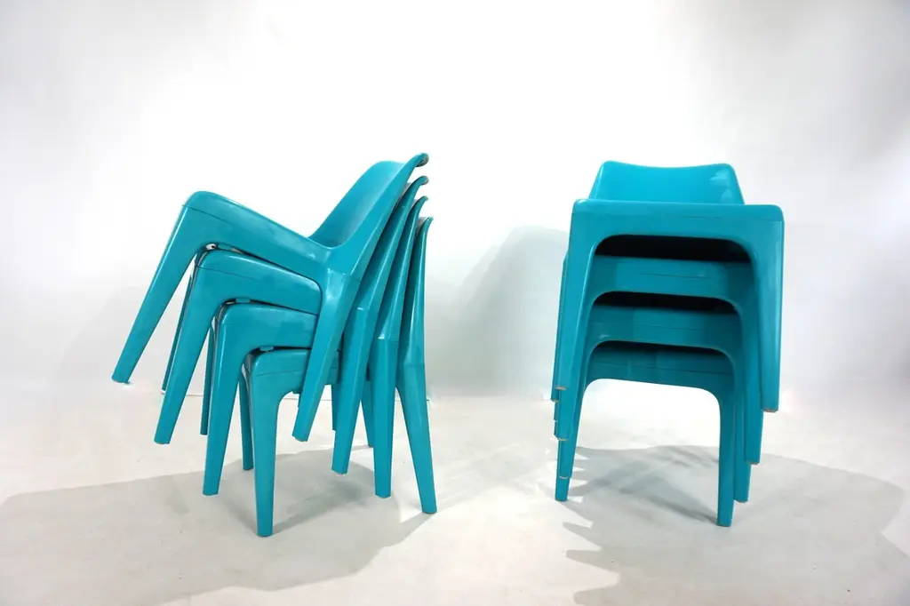Eight Space Age chairs, all in very good condition with slight signs of wear. With their futuristic side lines, the chairs embody the Space Age chair of the 1970s. The chairs are assembled from two plastic parts and are extremely stable. Combined with the stackability of the chairs, these chairs are ideal for use in a restaurant, bar, or coffee shop. The stunning turquoise color of the chairs draws the viewer's attention.The German seating manufacturer Schröder&Henzelmann from Vlotho produced these chairs in the late 1960s and early 1970s. These were one of the last models from the manufacturer, as they ceased production in the 1970s. German Space Age par excellence.Price per chair