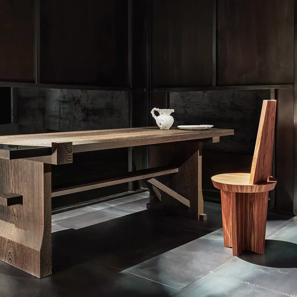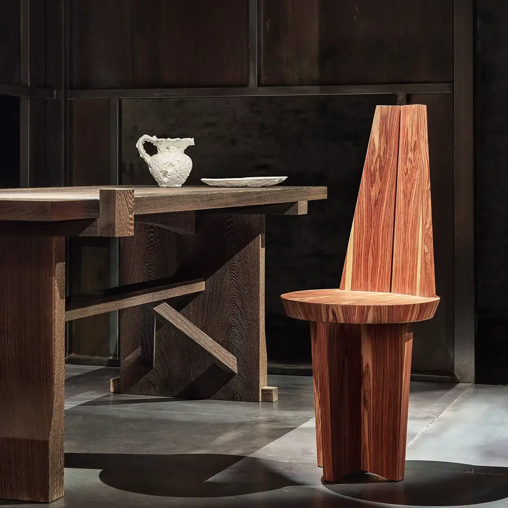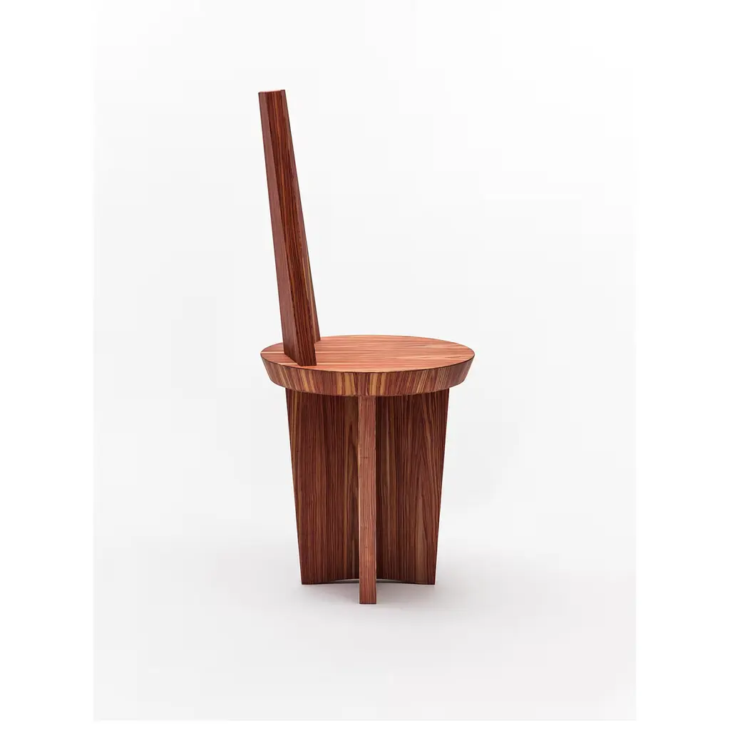 Part of a collection that seeks to recreate the intimate objects of traditional rooms as a reflection of Italian society, this chair is named after the Italian words for "poor chair", due to its simple yet effective design. Enhancing the natural flair of rosewood, the piece features a tall backrest resting on a round seat and crisscrossed legs.